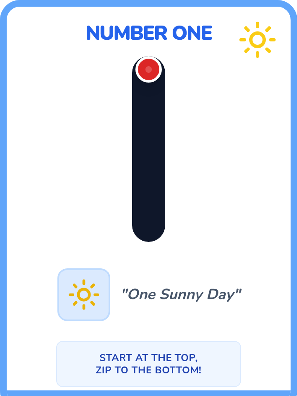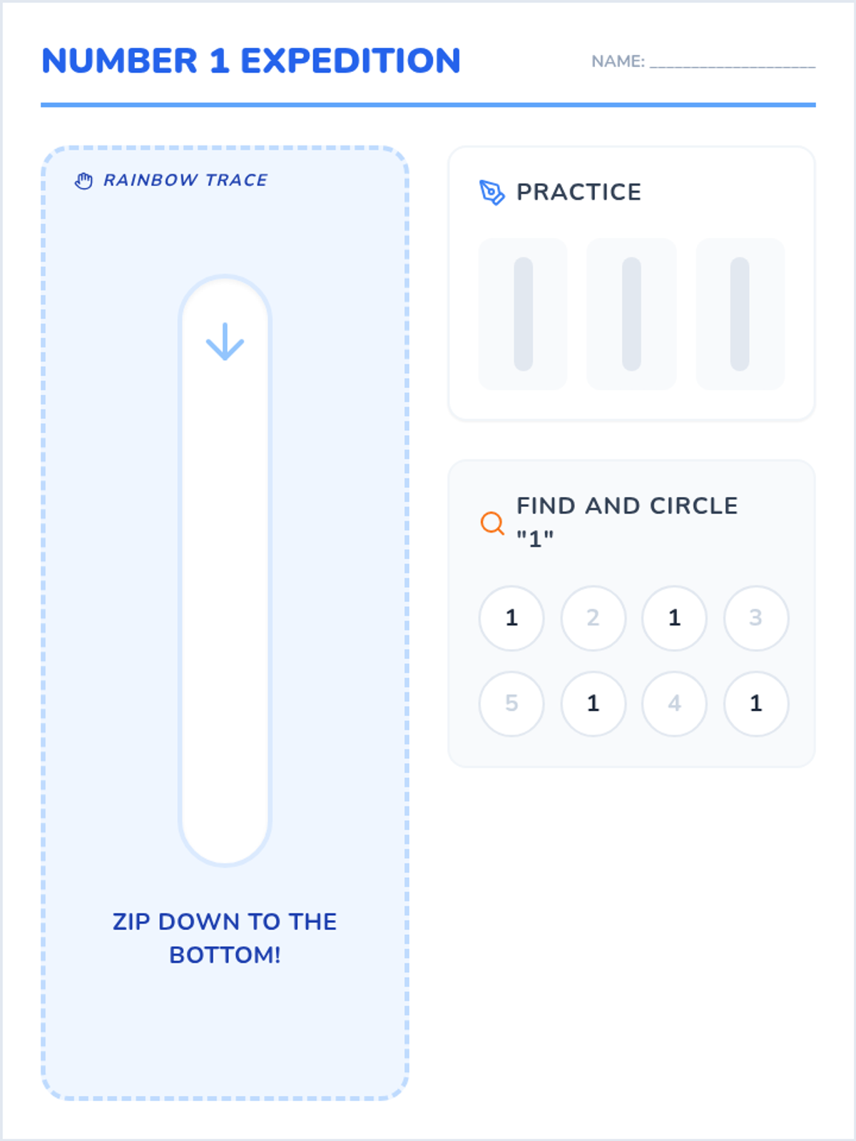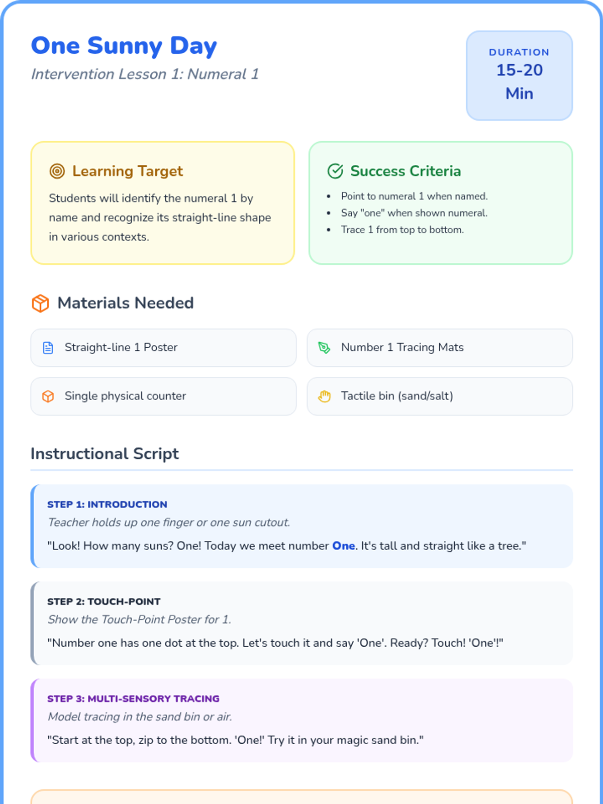Introduction to the numeral 1, focusing on its name, shape, and value using touch-point imagery and sky-writing scripts.