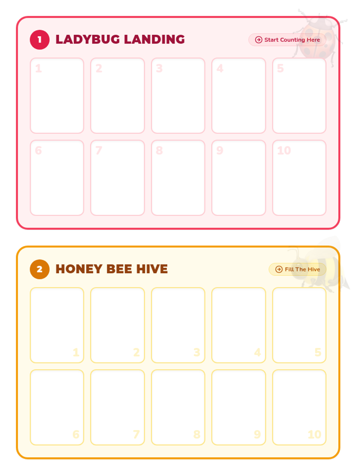 Expand counting skills to 5 using a five-frame (top half of a ten-frame) and friendly garden flies.