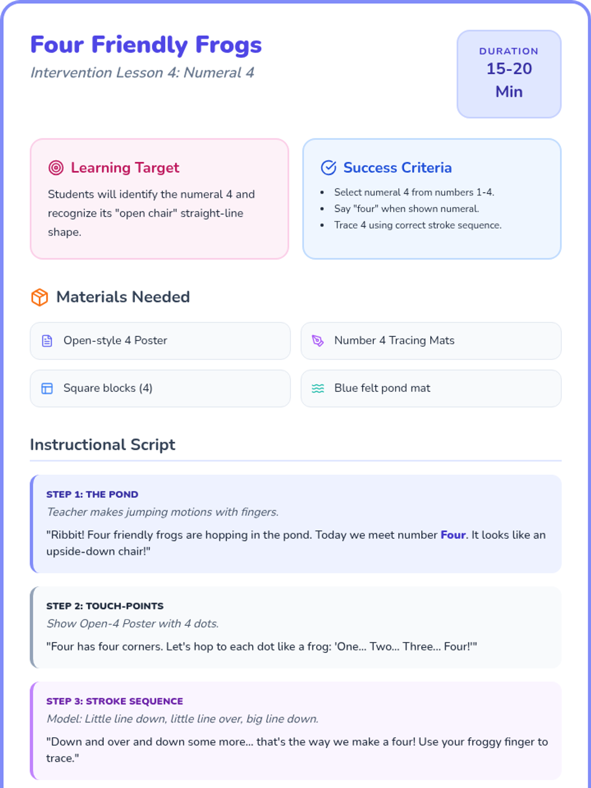Discovering the numeral 4, teaching its straight lines and four distinct touch-points with a friendly frog theme.