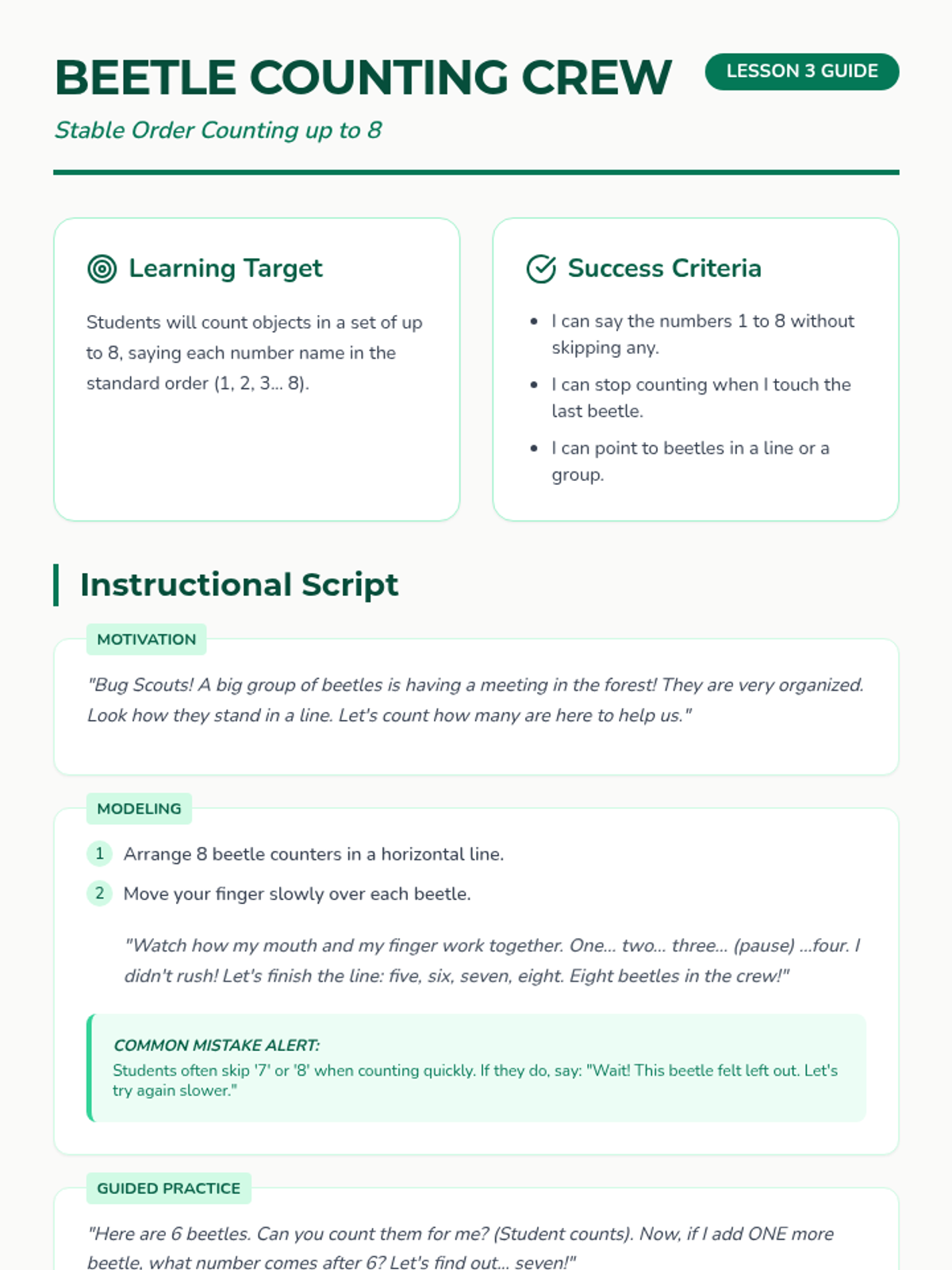 Practicing counting from 1 to 8 using a beetle-themed grid and focusing on stable order counting.