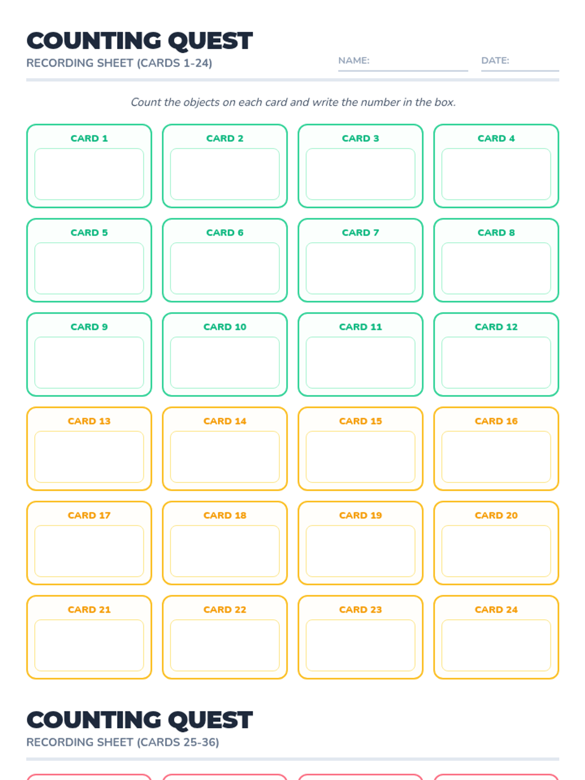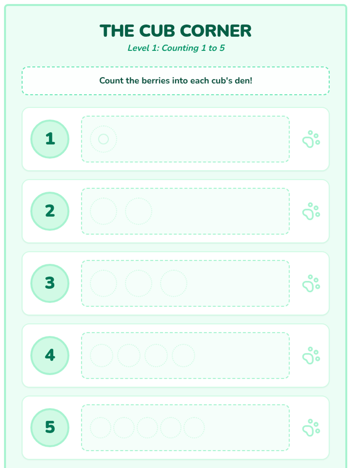 A fun introduction to the numbers 1-10 through matching and visual recognition. Students use color-coded cards to connect numerals with sets of objects.