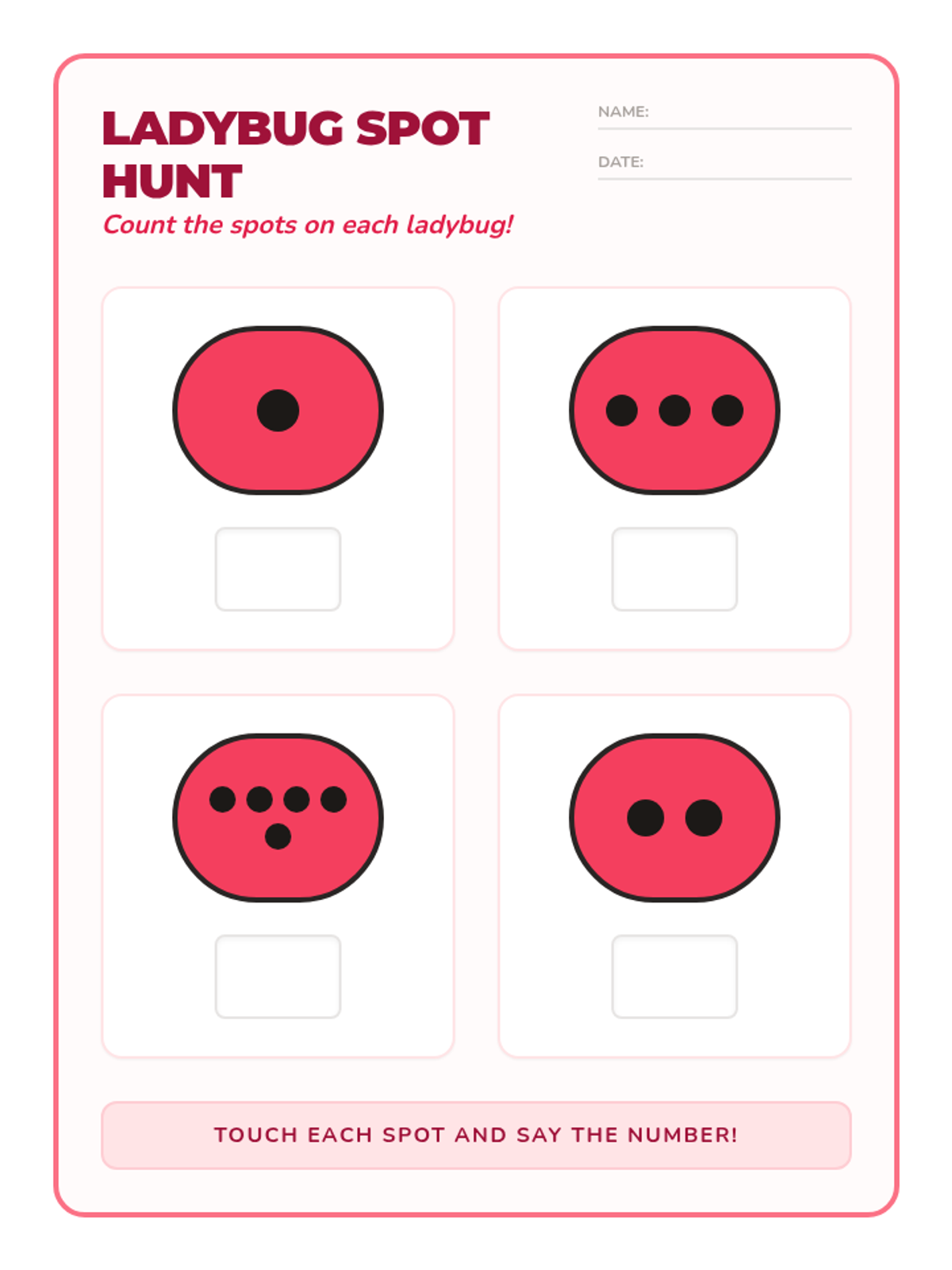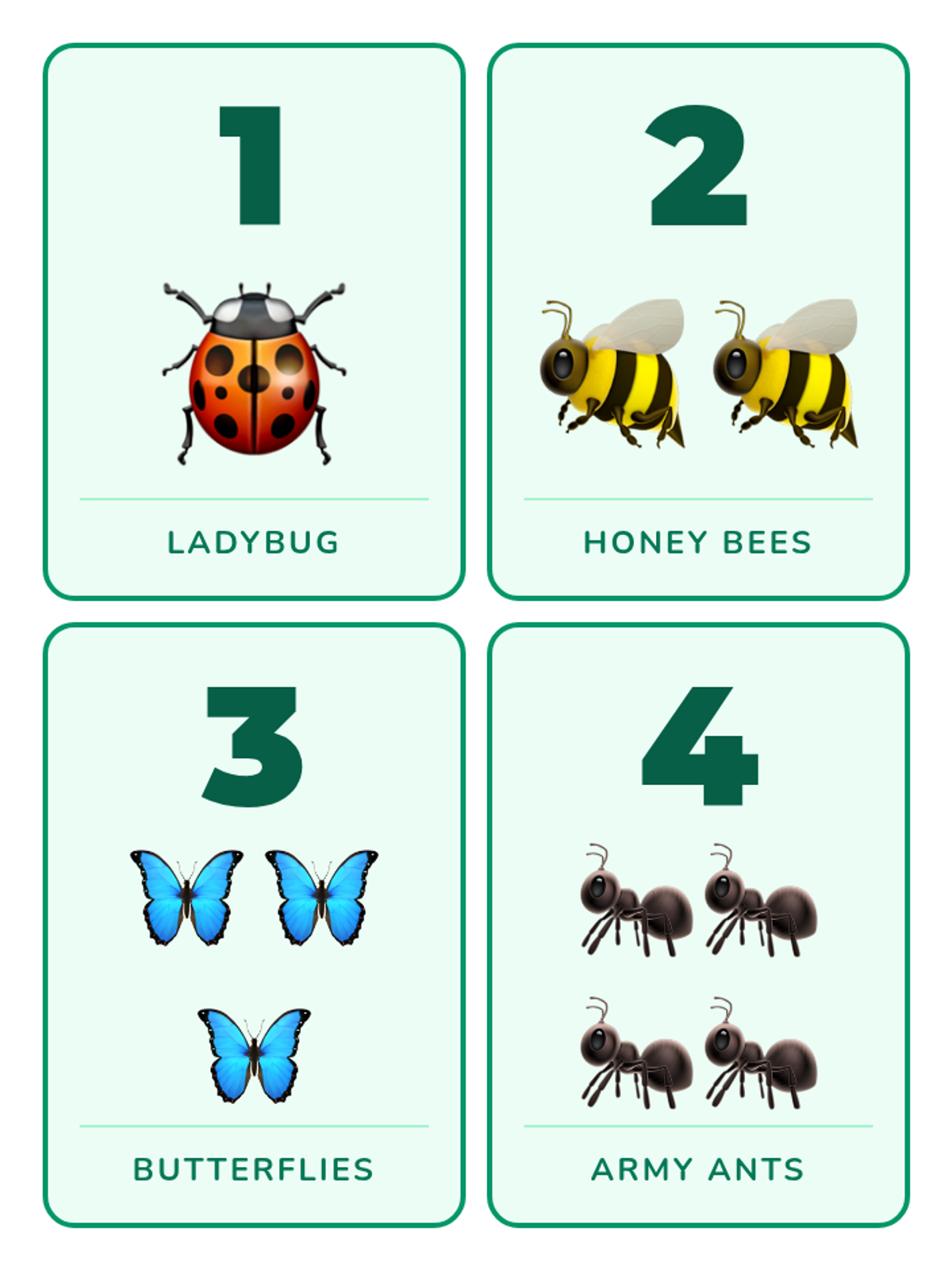 Introduce the concept of one-to-one correspondence by counting 1, 2, and 3 insect friends. Focus on pointing to each object once.