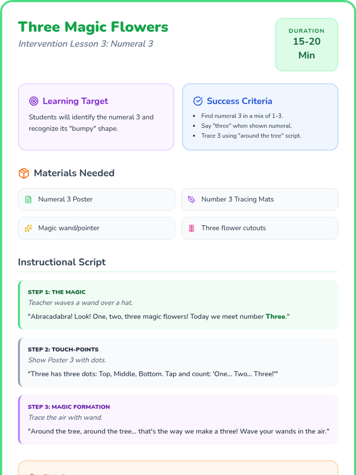 Exploring the numeral 3, focusing on its identifying features and the three touch-points in a 'magic' themed lesson.