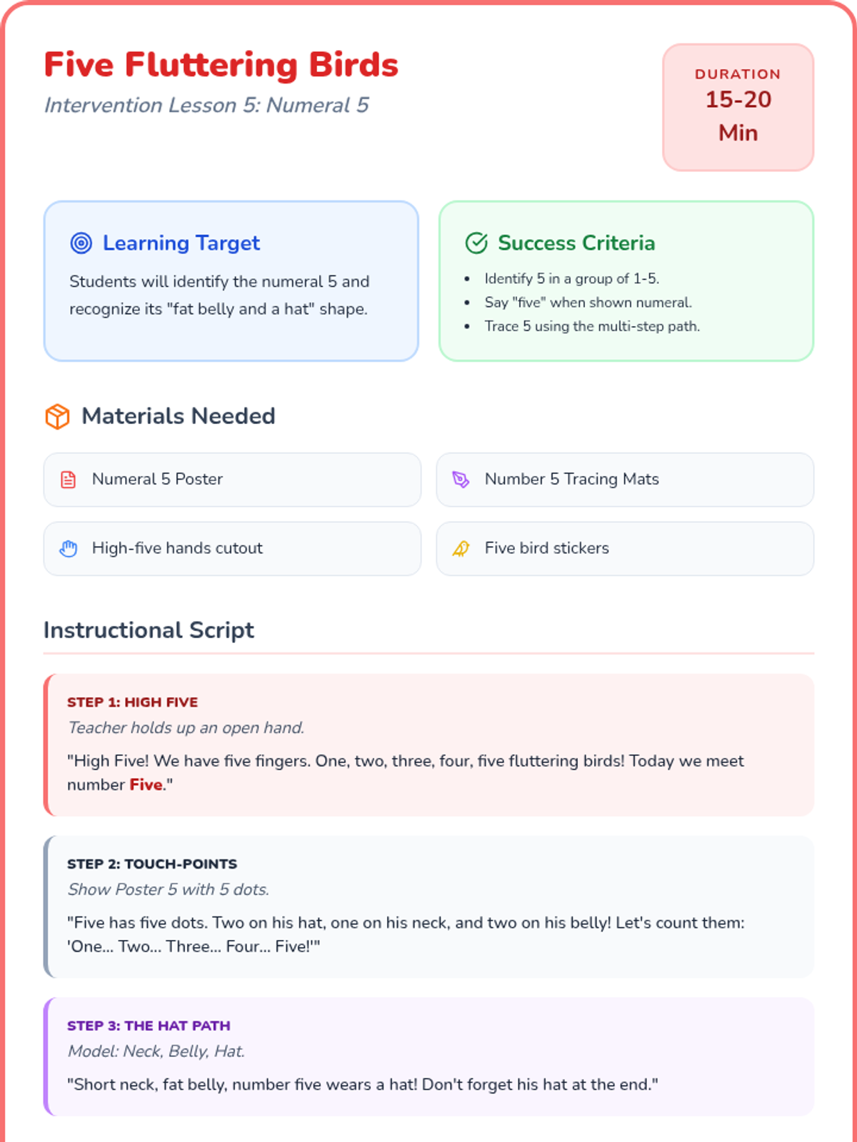 Introduction to the numeral 5, focusing on its unique shape and five touch-points using 'high-five' analogies and bird imagery.
