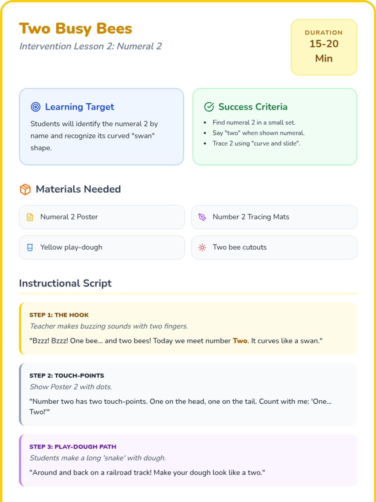 Days 1-5 focus on establishing a strong foundation with numbers 0-20, emphasizing correct formation, sequencing, and the unique structure of teen numbers as 'ten and some more.' Includes a pretest and initial formative assessment.