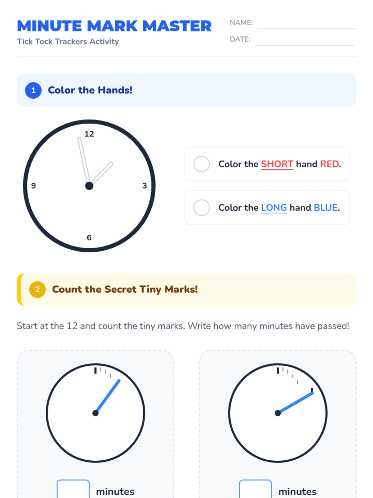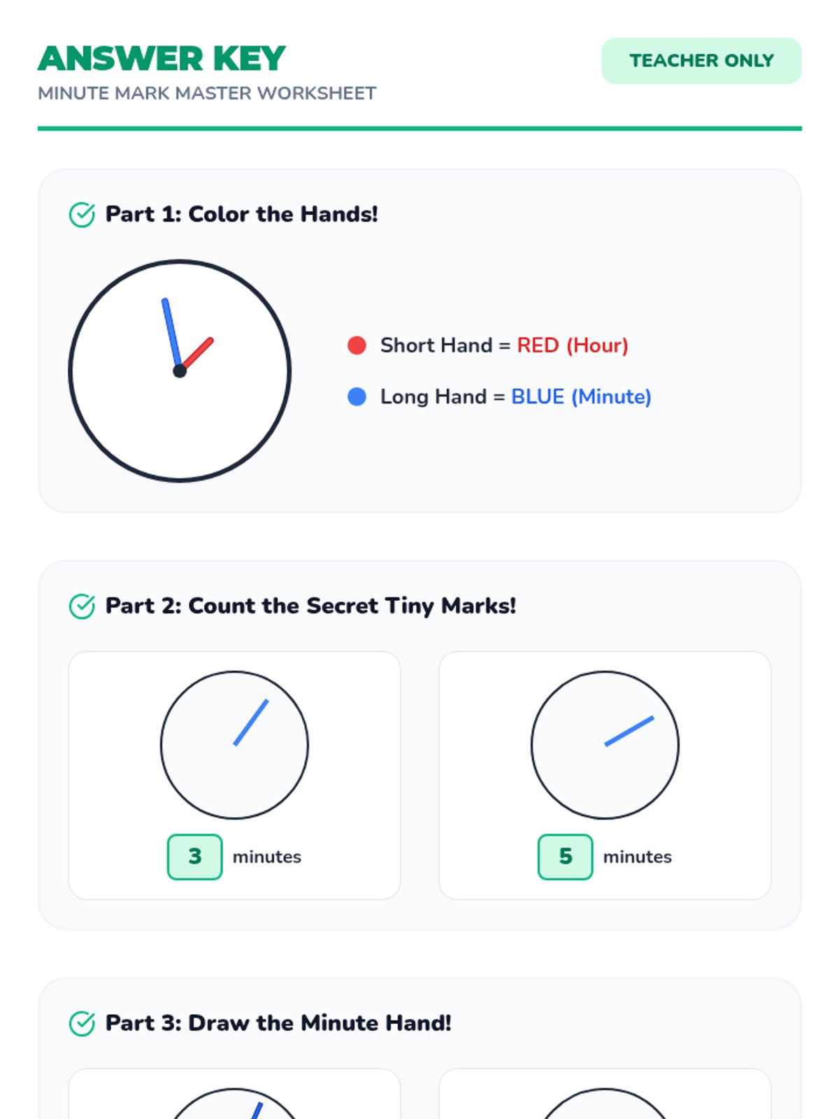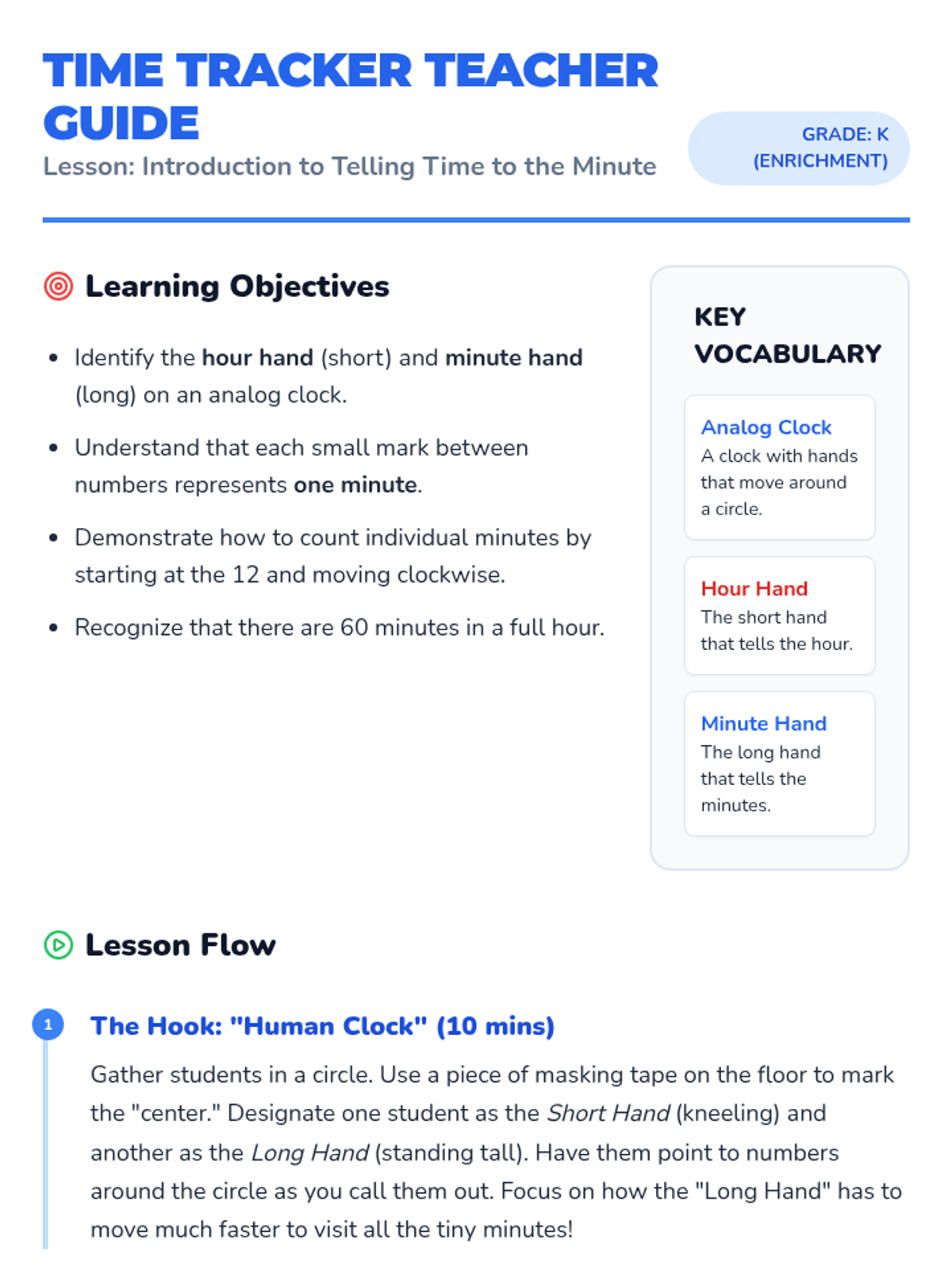 A comprehensive introduction to telling time, focusing on identifying clock parts and understanding how the minute hand moves to specific marks. Designed for advanced Kindergarten learners or as an enrichment unit.