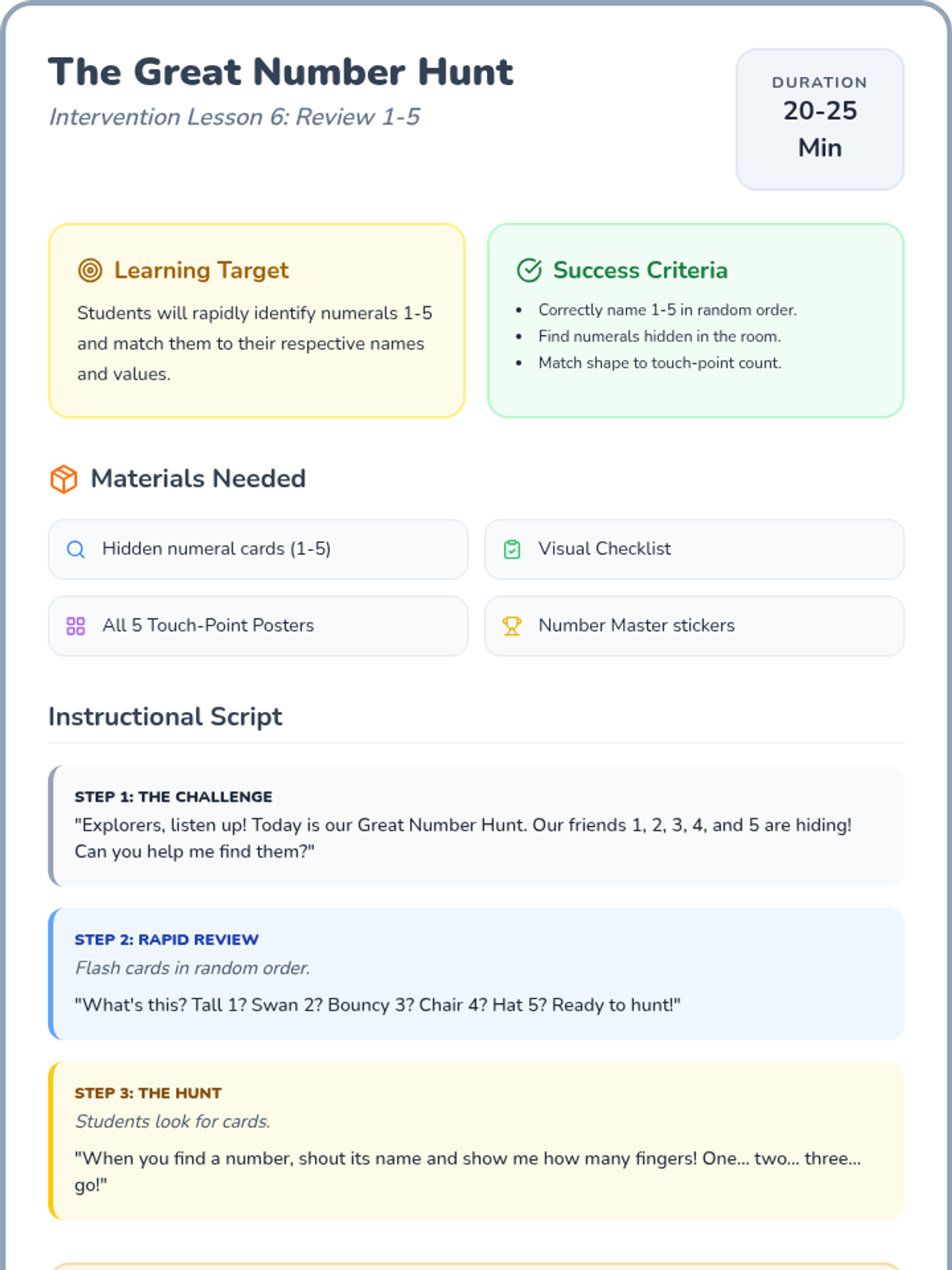 A comprehensive review of numerals 1-5, focusing on rapid identification and matching names to shapes through a 'scavenger hunt' format.