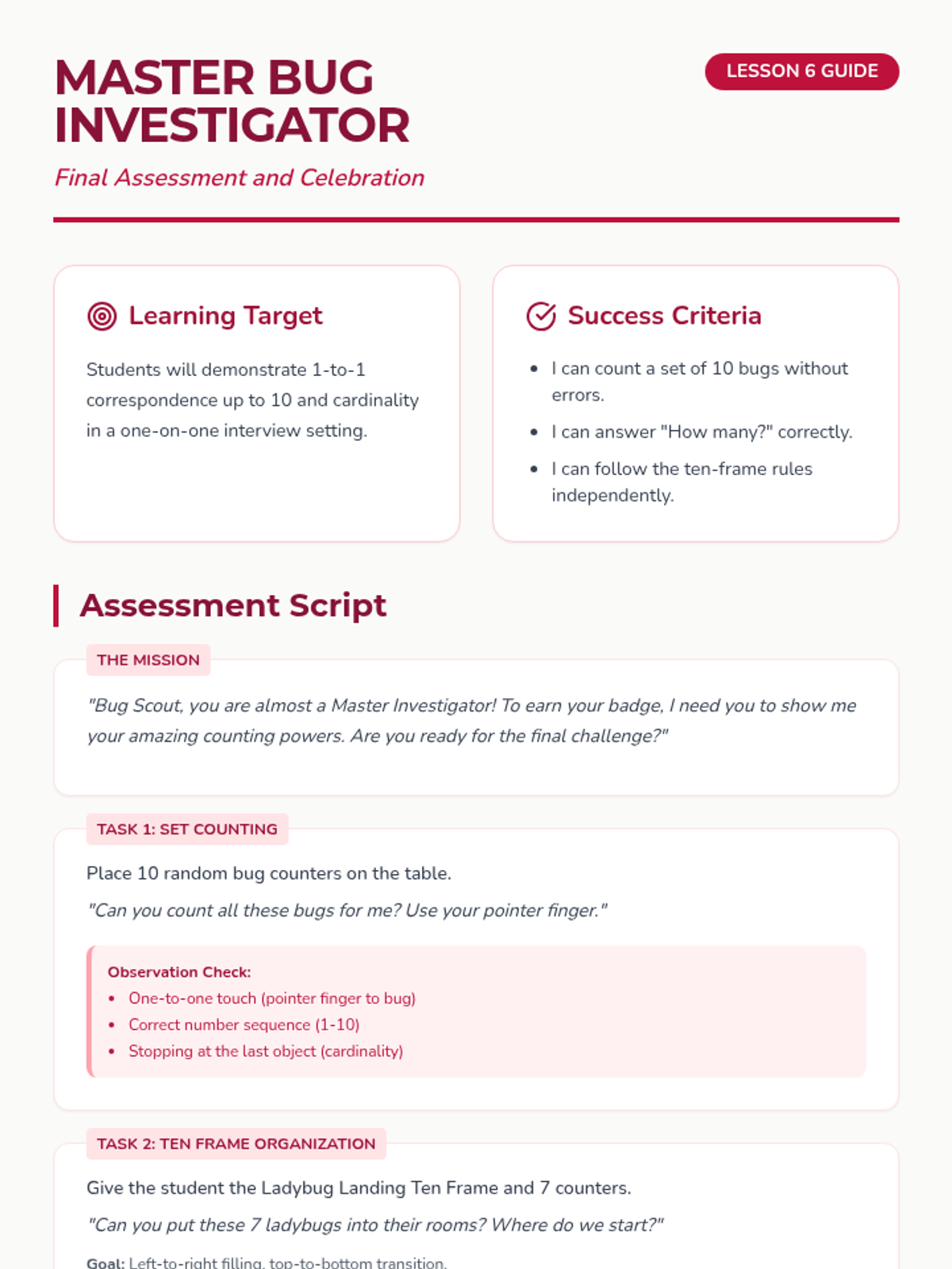 A final consolidation and assessment lesson where students demonstrate their counting skills to earn their 'Master Bug Scout' badge.