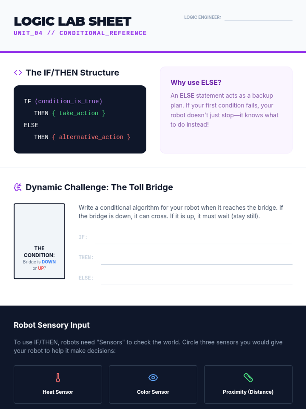 Students add decision-making power to their algorithms using 'If/Then/Else' logic, modifying maze instructions to handle dynamic obstacles.
