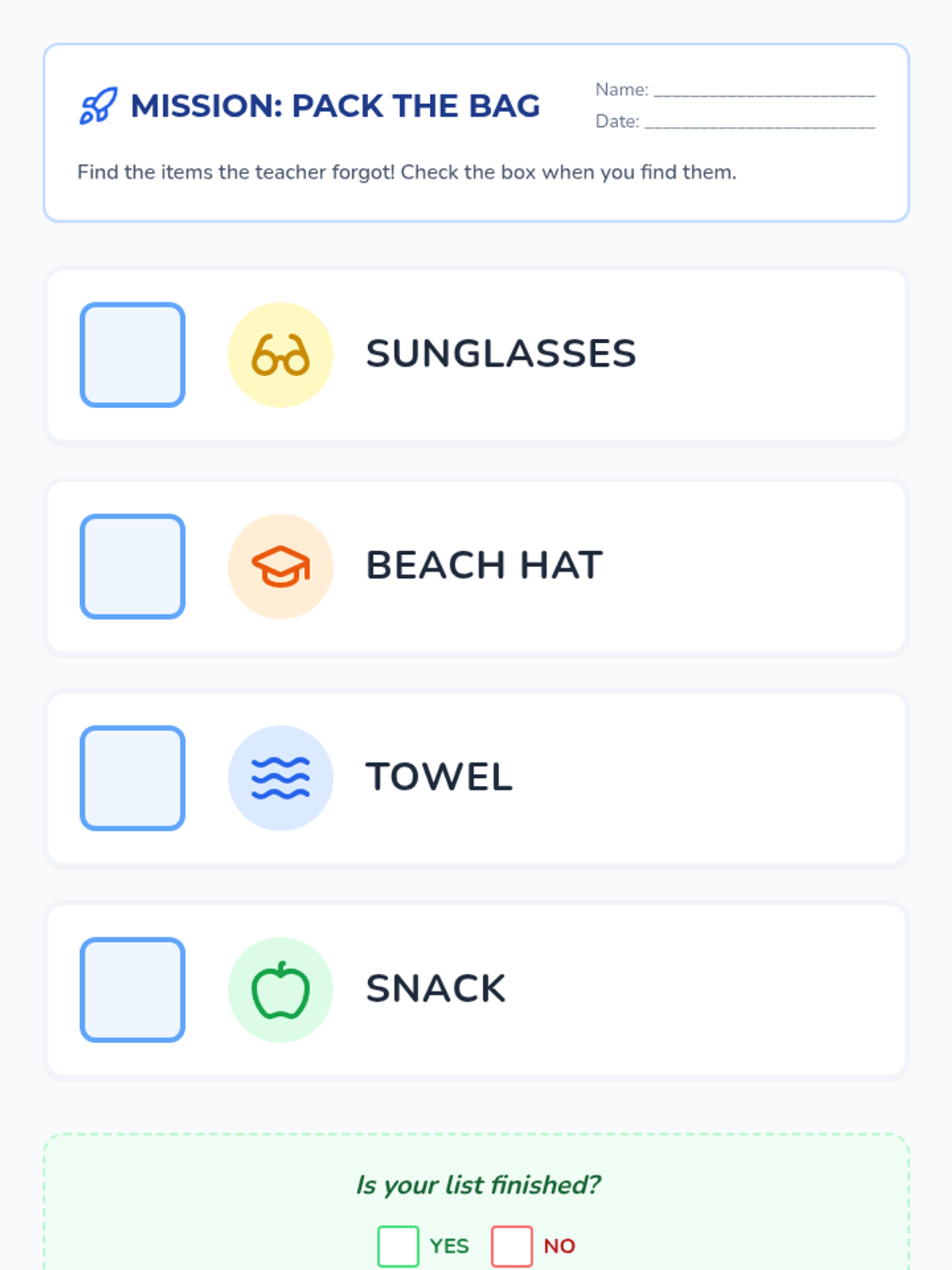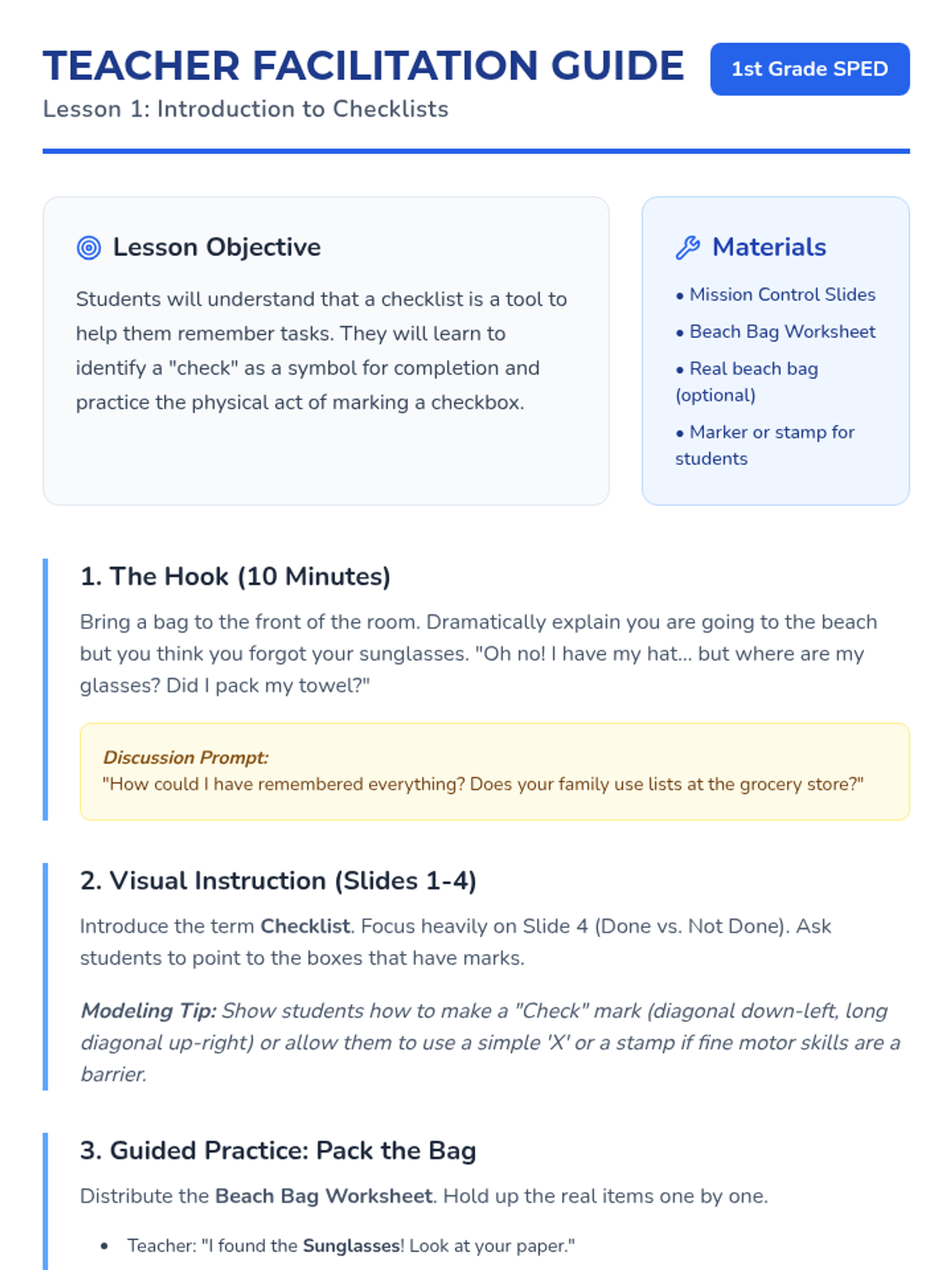Students are introduced to the format of a vertical checklist with checkboxes or velcro spots. They learn the symbol for 'check' and compare a finished list to an unfinished one.