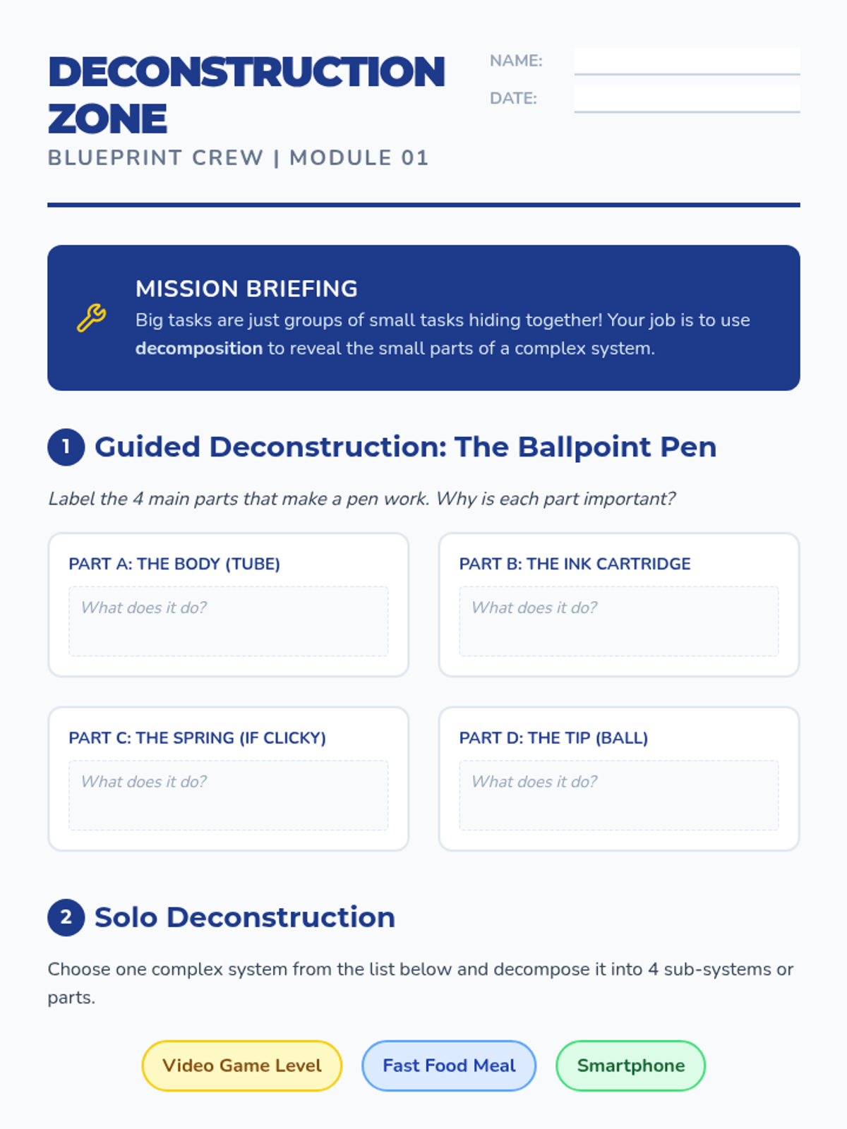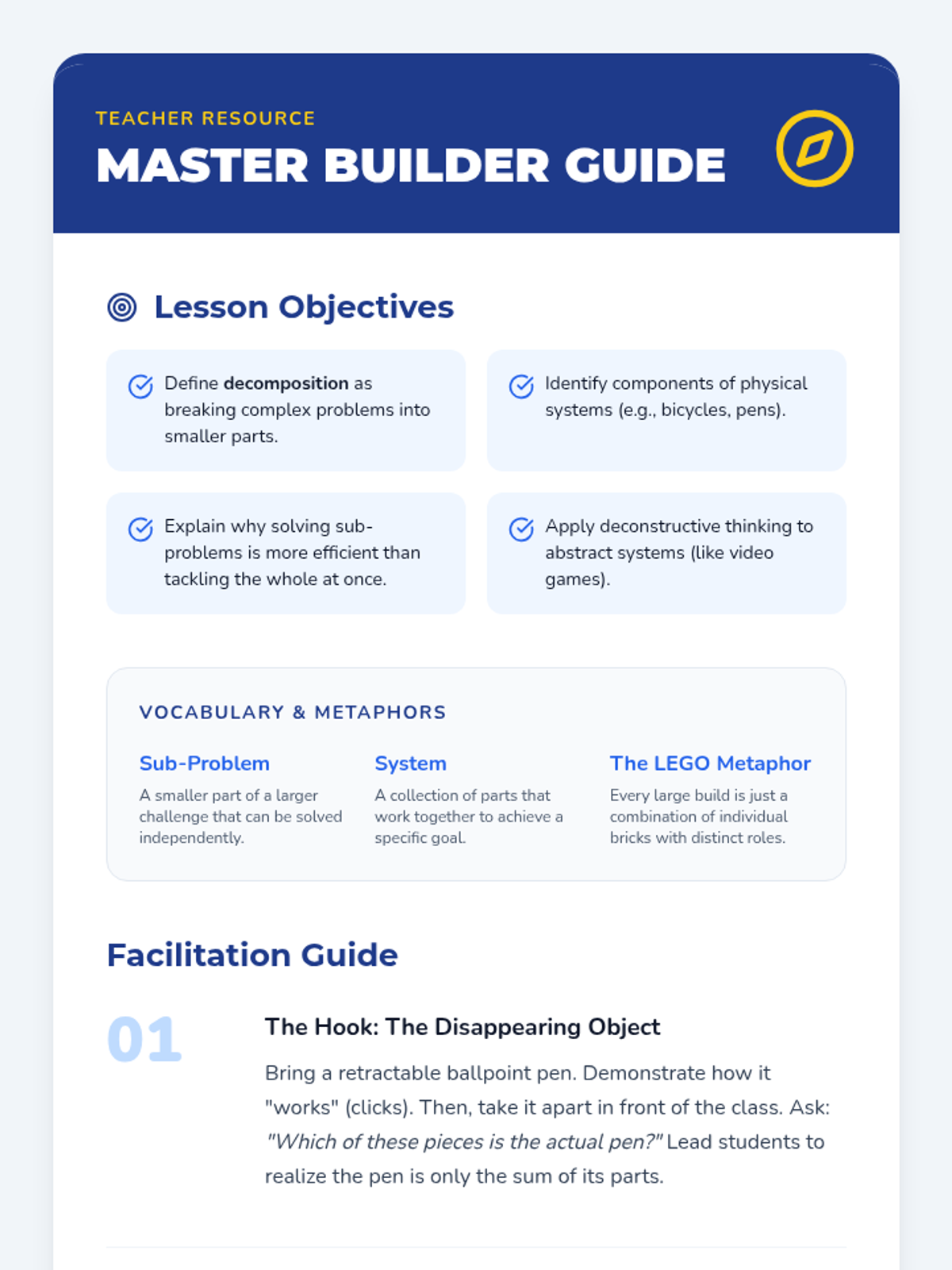 Students explore how complex objects and systems are made of simpler, independent parts using real-world examples like bicycles and pens.