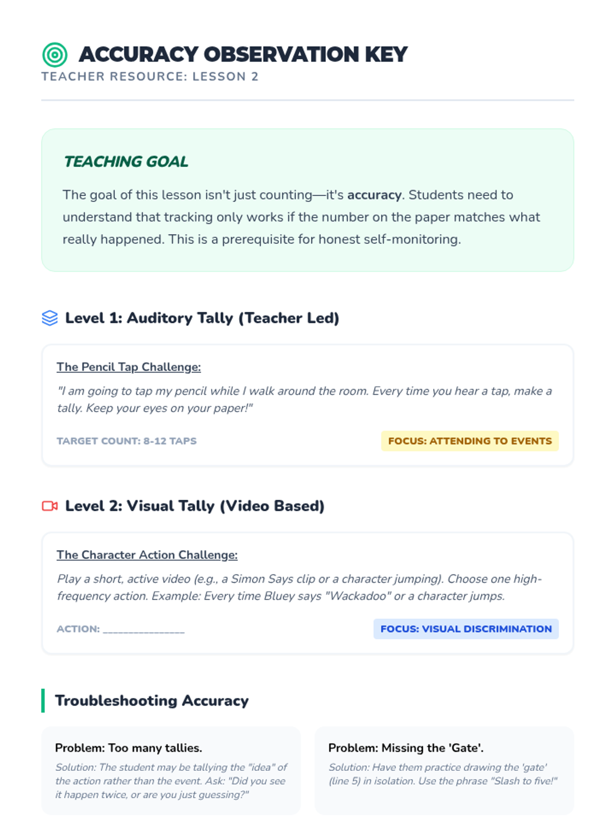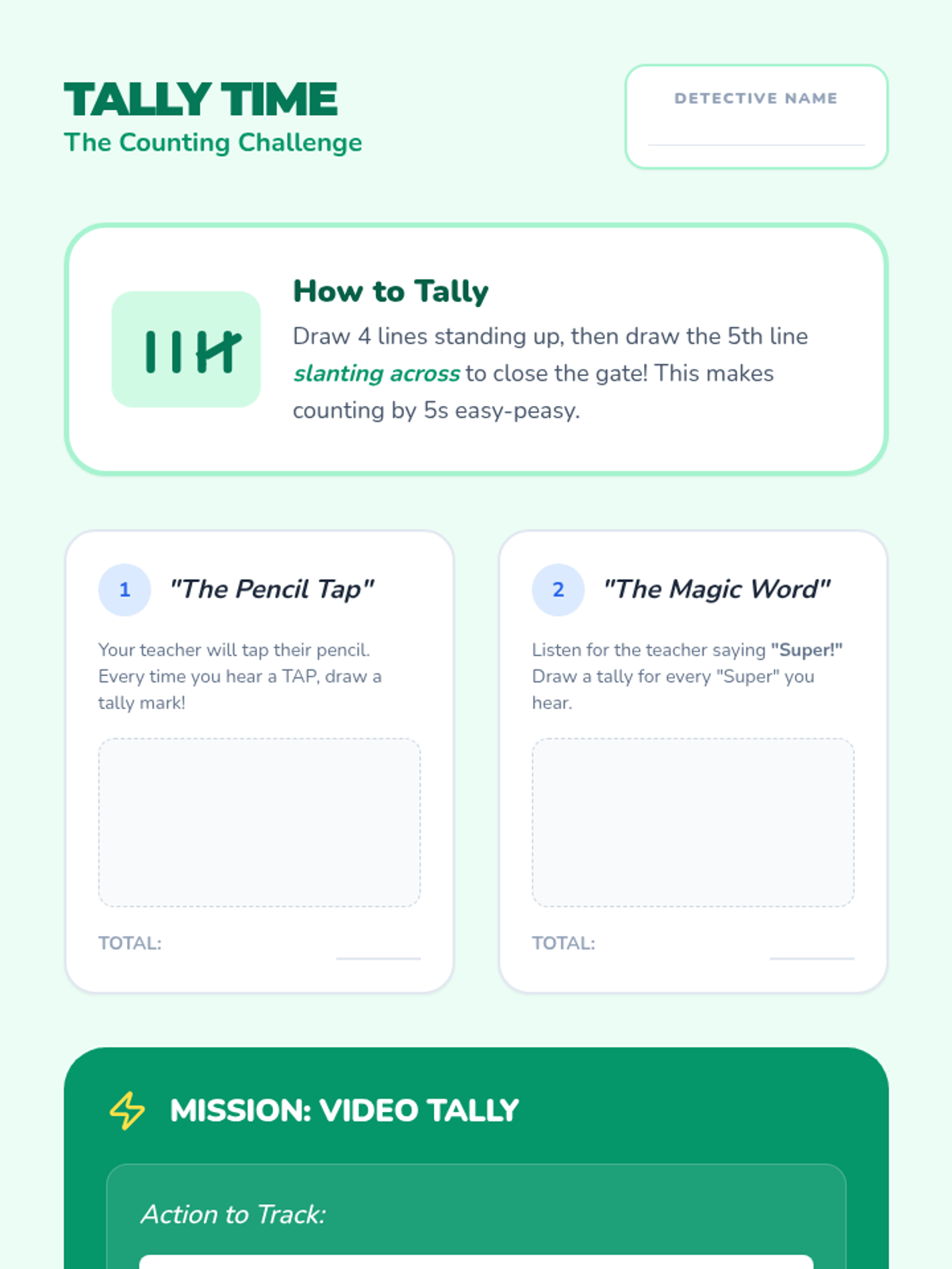 Students learn how to use tally marks to count specific events. They practice by watching a classroom scenario or clip and tallying how many times a character performs a certain action, discussing the importance of accuracy.