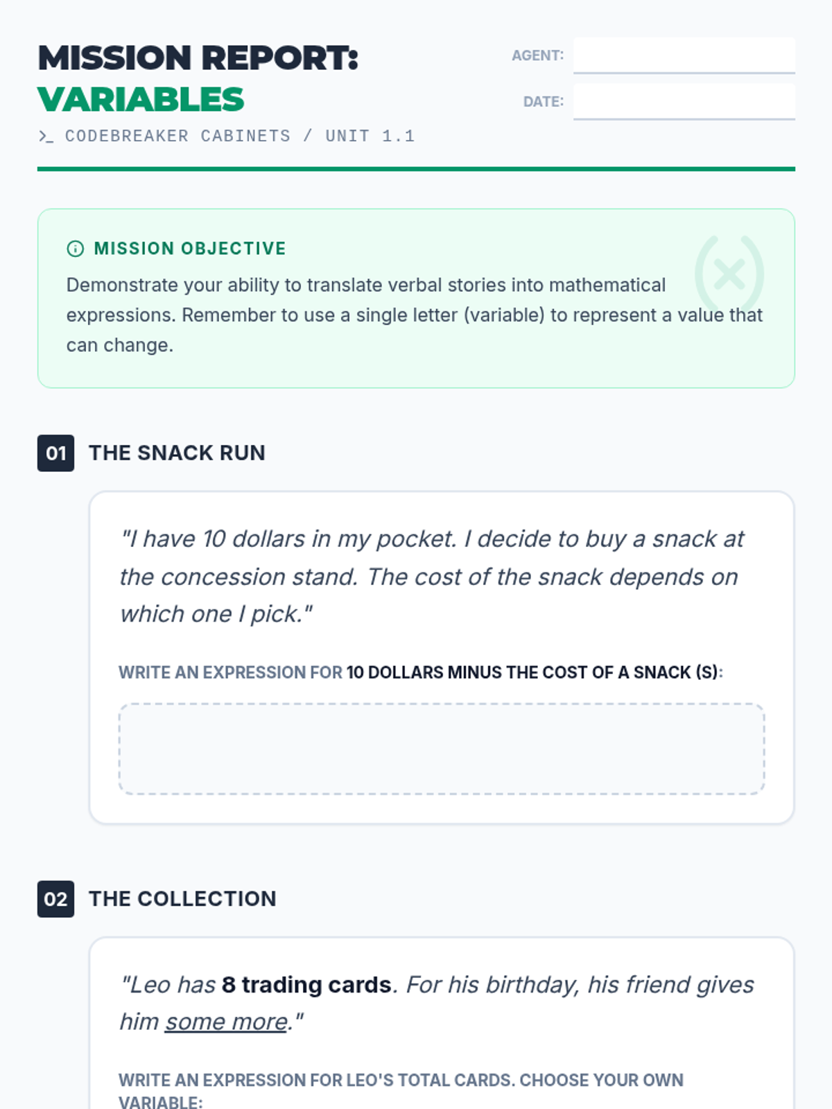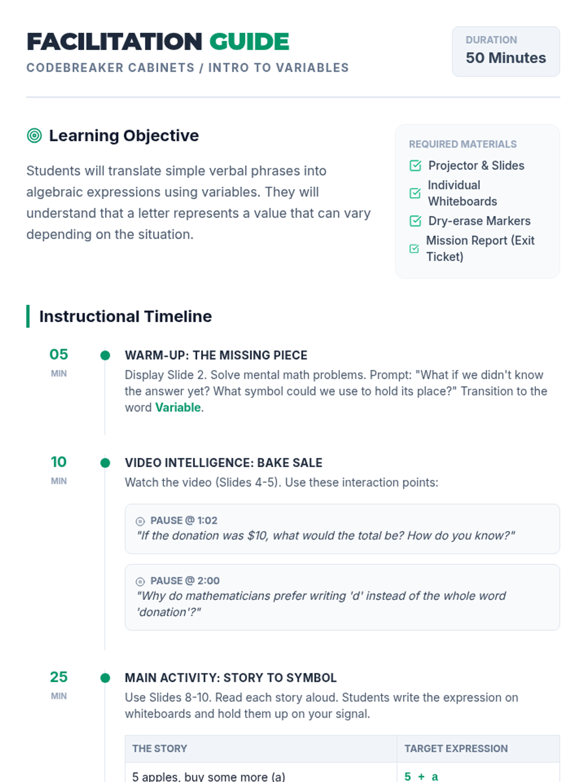 Students will learn to decode verbal stories into mathematical expressions using variables. Through a bake-sale video and hands-on 'Story to Symbol' practice, they will discover how letters can represent unknown or changing values.