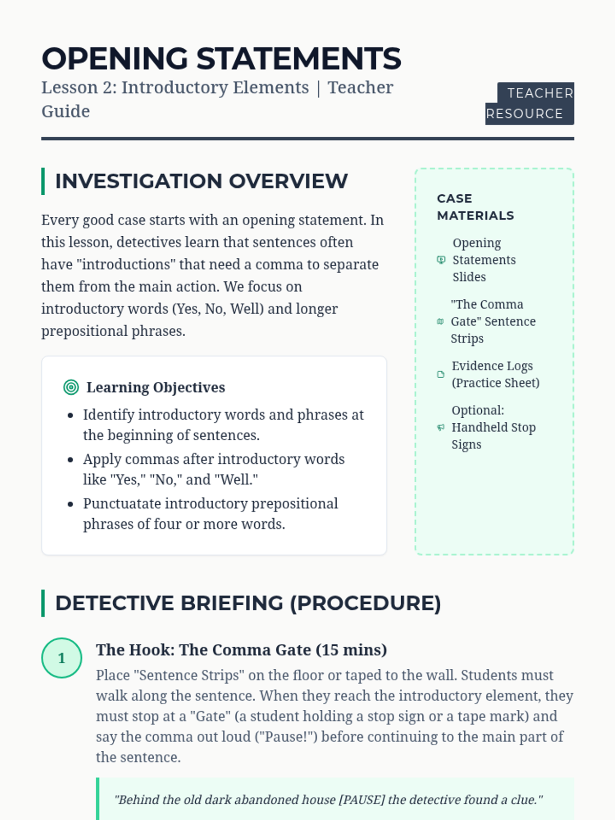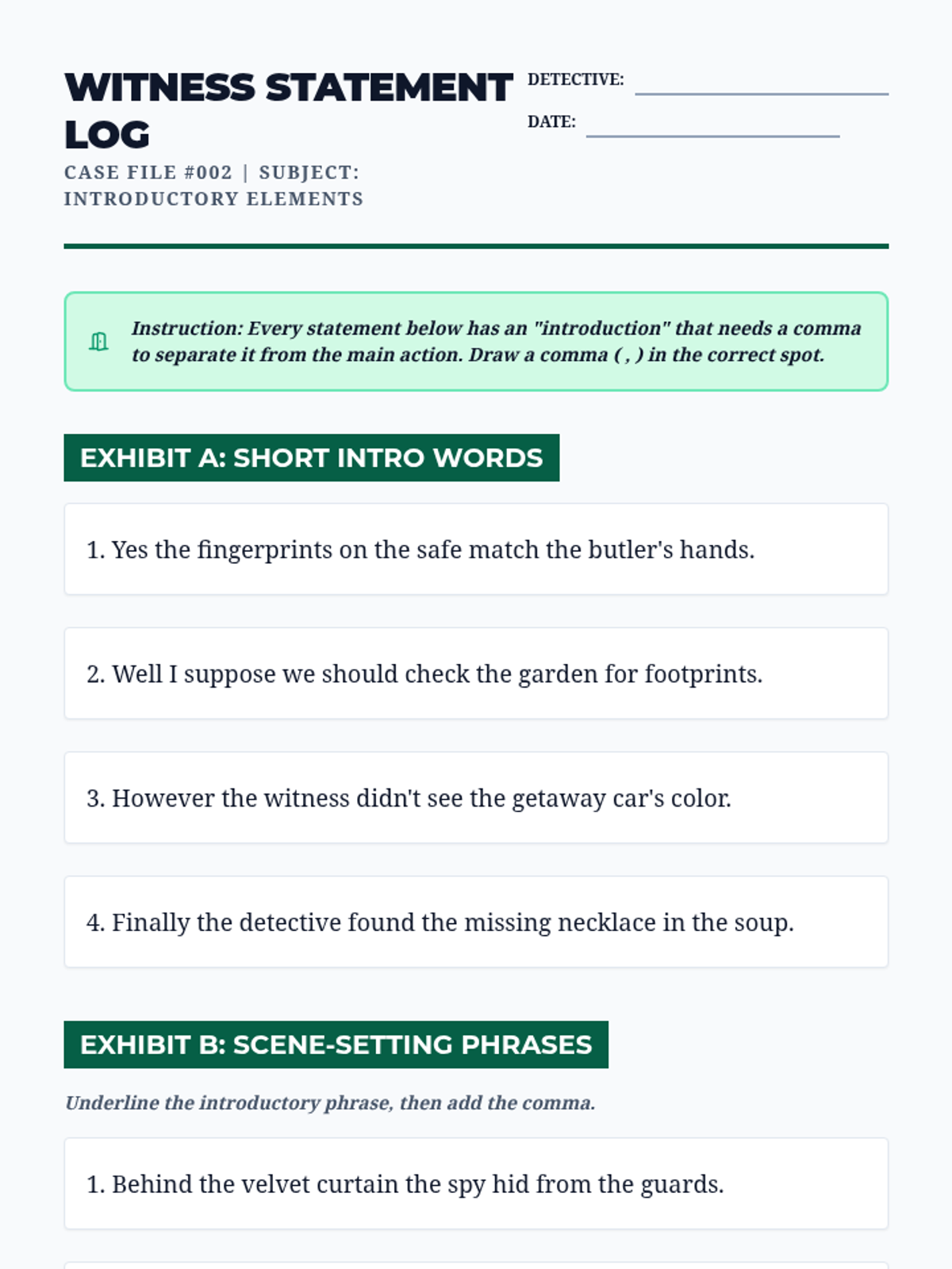 Students learn to use commas after introductory words and prepositional phrases, practicing the 'physical pause' required before entering the main part of a sentence.