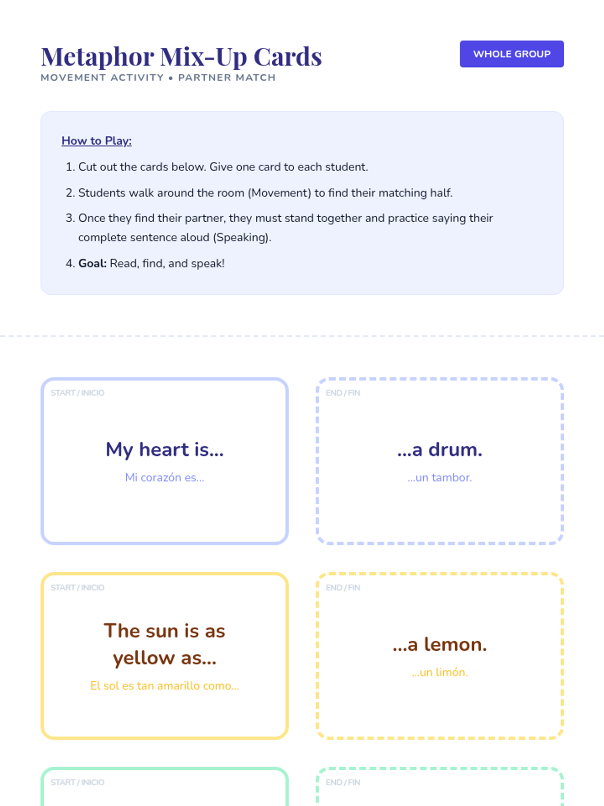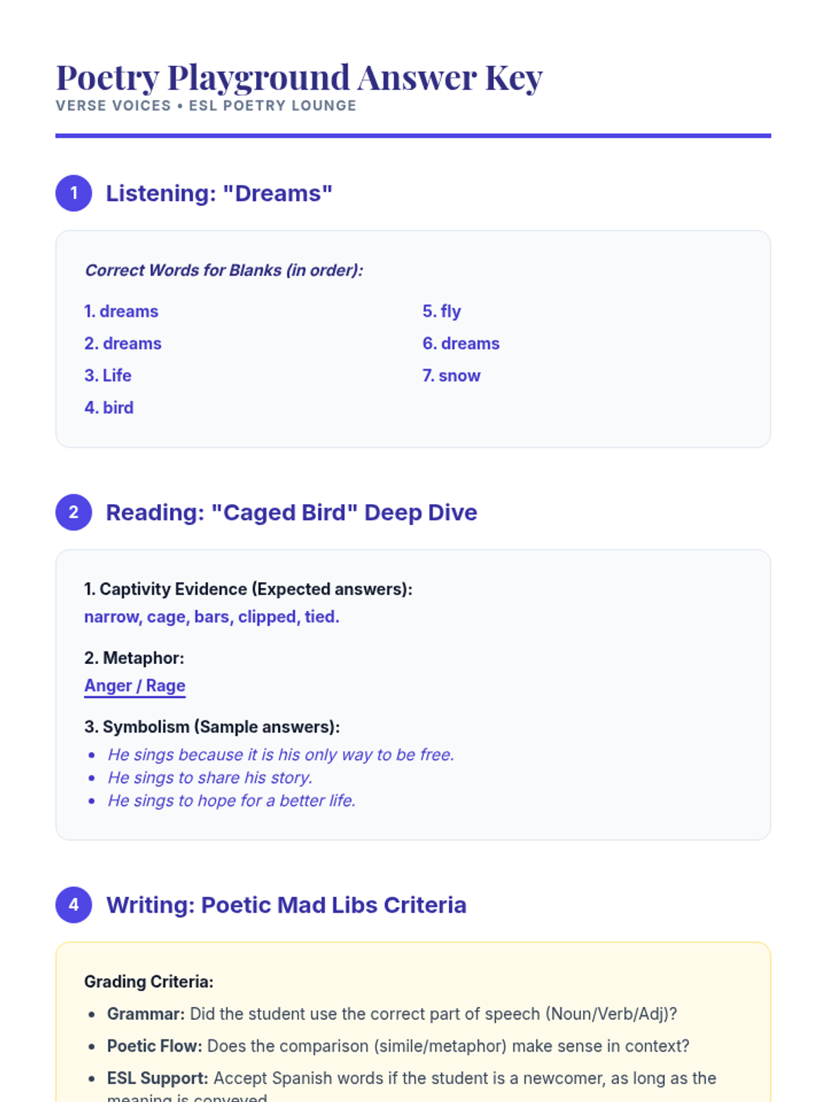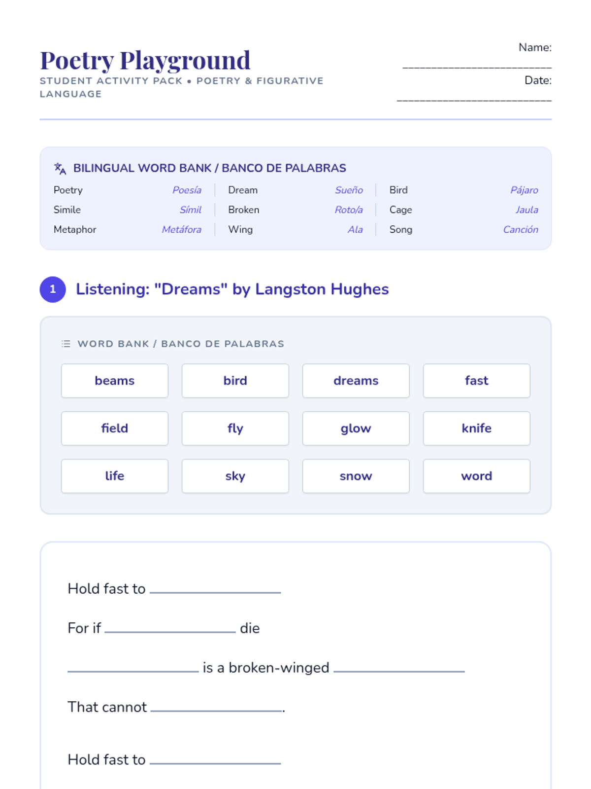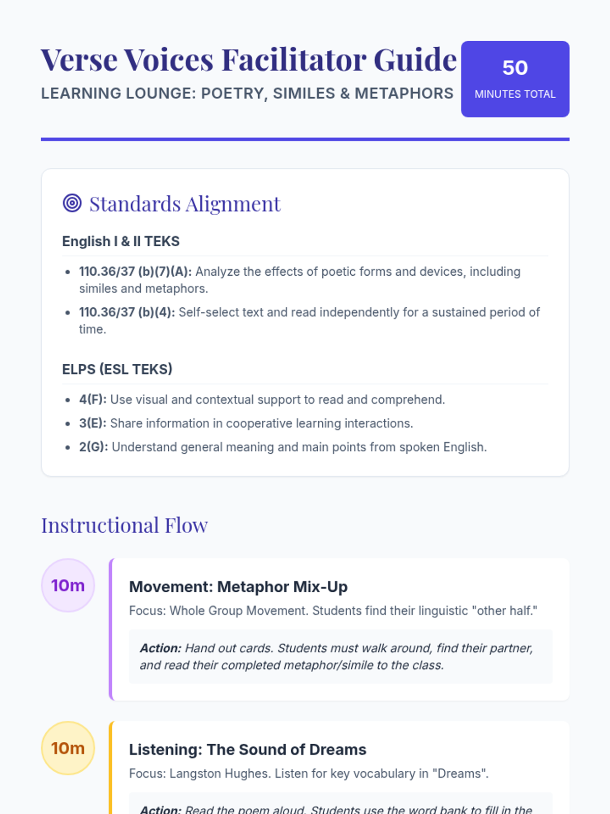 A comprehensive ESL-focused lesson exploring poetry through the works of Langston Hughes, Maya Angelou, Pablo Neruda, and Sandra Cisneros, with a focus on similes and metaphors across four 10-minute skill-based activities.