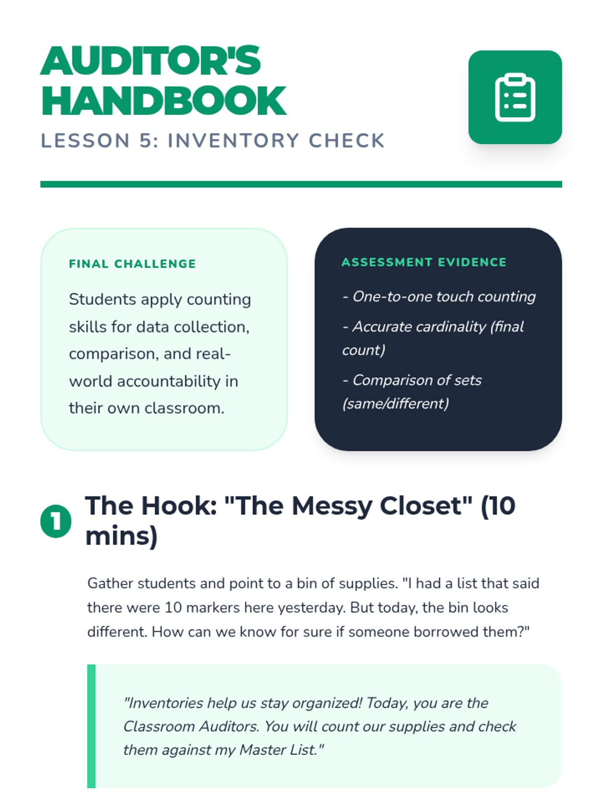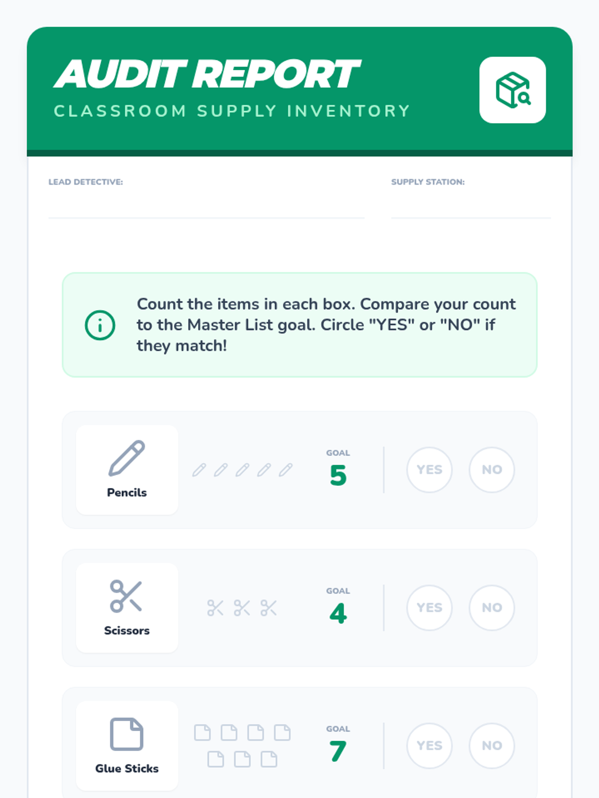In this final workshop, students perform an inventory of classroom supplies, counting and comparing totals to a master list for accountability.