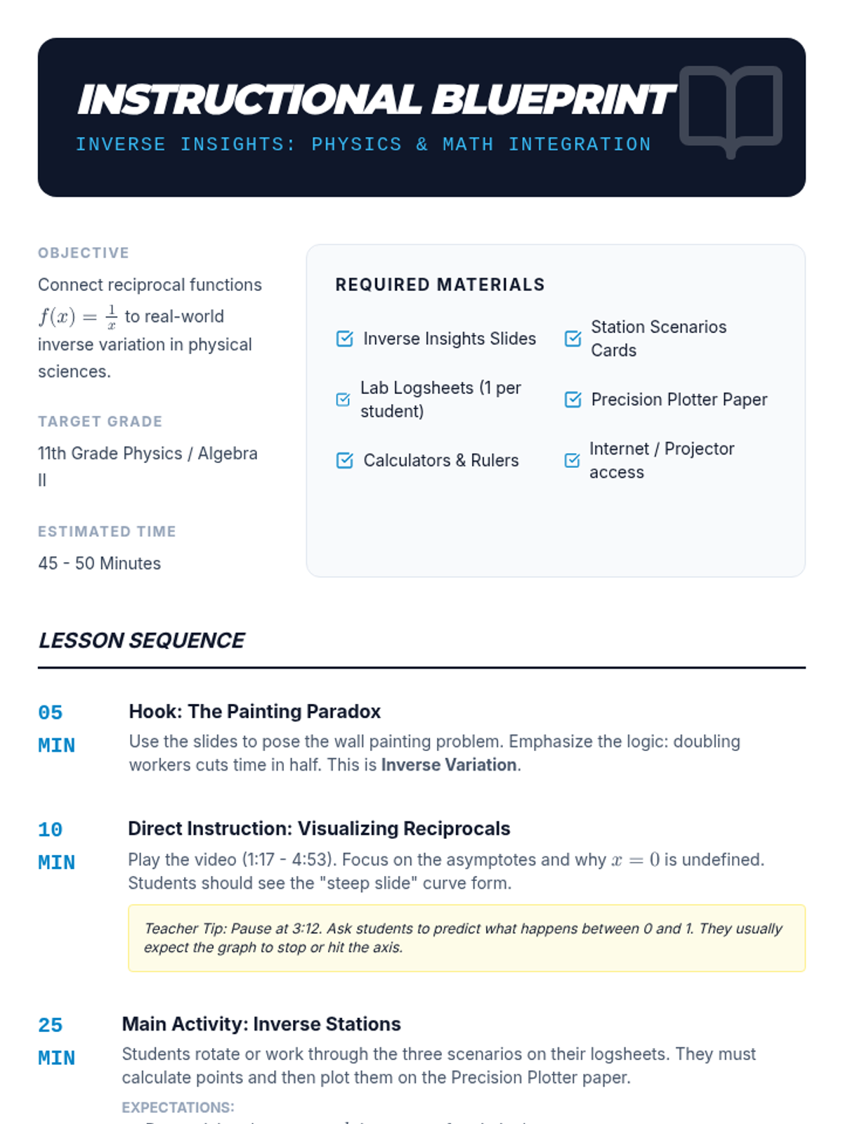 An 11th-grade lesson integrating mathematics and physics to explore reciprocal functions through real-world inverse variation, featuring data collection stations and graphical analysis.