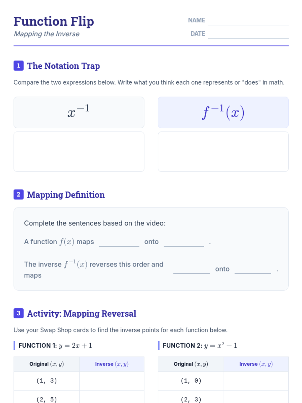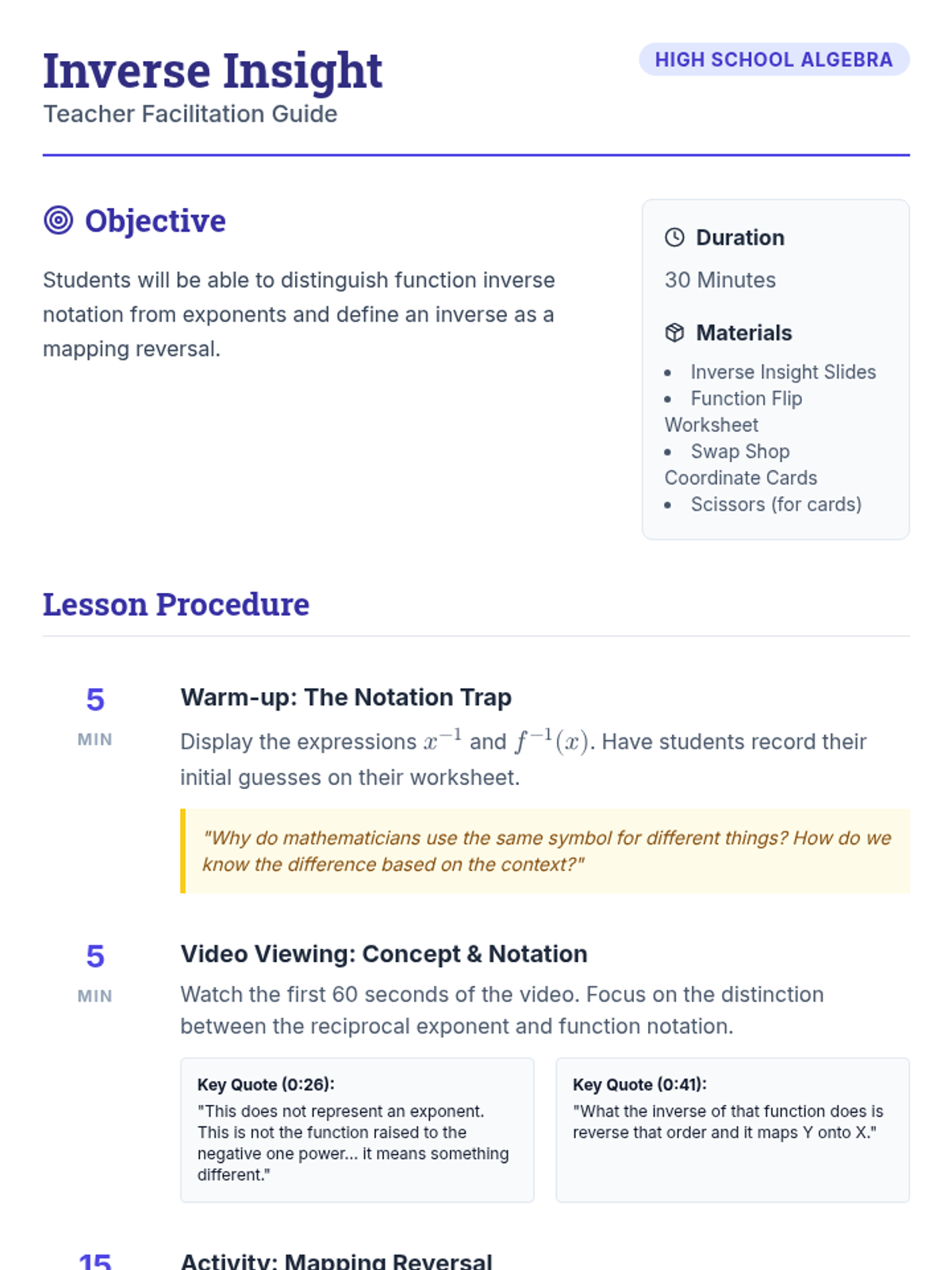 A high school algebra lesson introducing function inverse notation and the conceptual definition of an inverse as a mapping reversal, distinguishing it from reciprocal exponents.