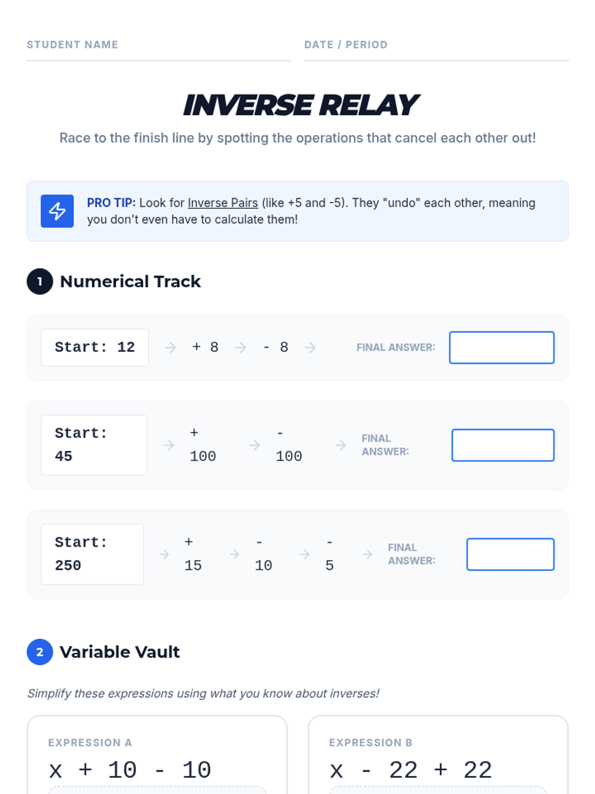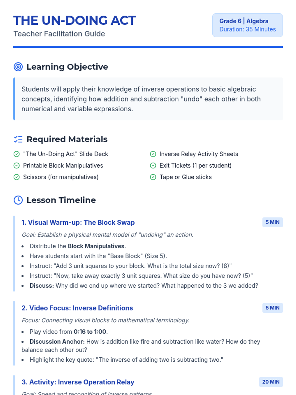 This lesson introduces 6th-grade students to the concept of inverse operations through visual demonstrations, a vocabulary-focused video, and a collaborative relay activity, culminating in applying these concepts to algebraic variables.