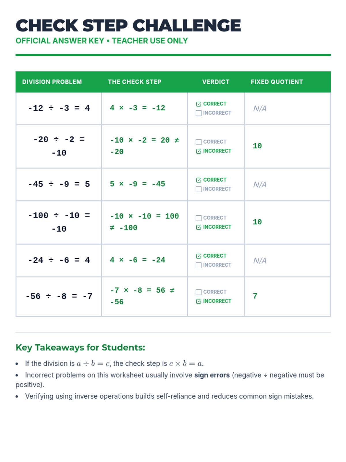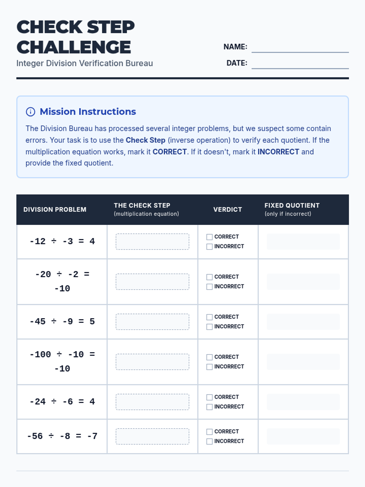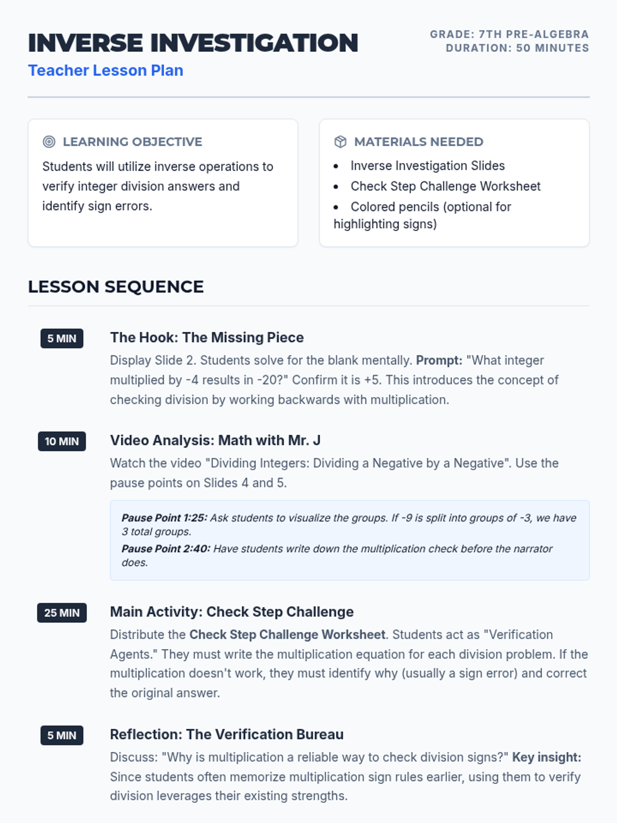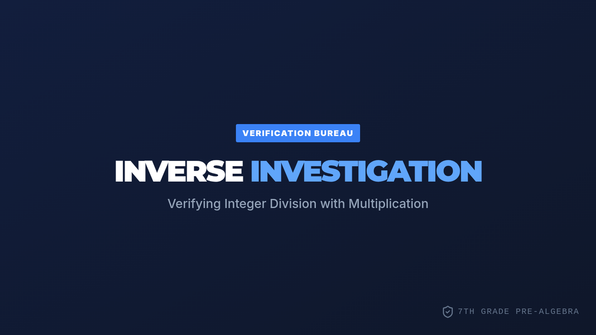 A lesson focused on verifying integer division using multiplication (inverse operations). Students will watch a video tutorial, perform a 'Check Step' challenge to identify and fix incorrect division problems, and create their own challenge equations.