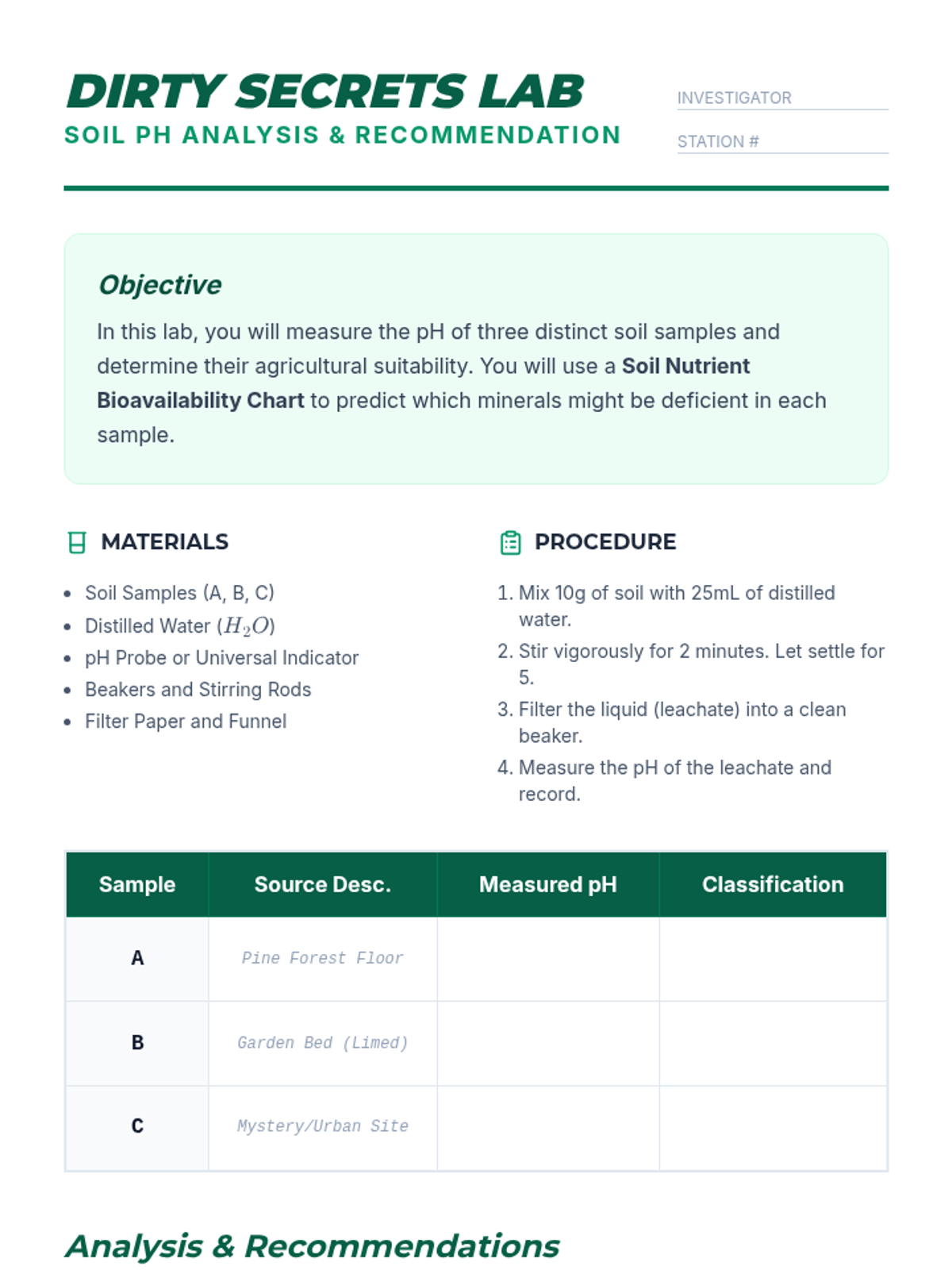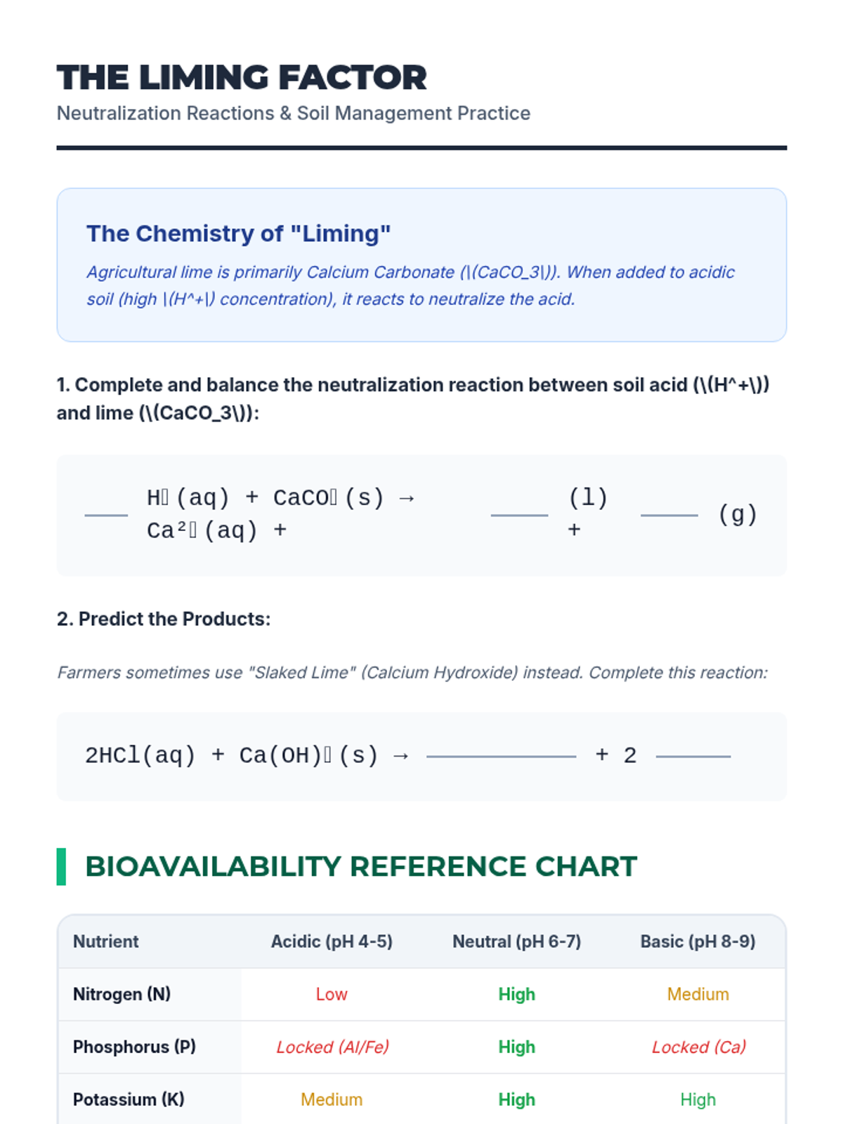 Students test soil samples and research how pH affects nutrient availability for plants. They learn how farmers use lime (bases) to adjust soil chemistry for optimal crop yield.