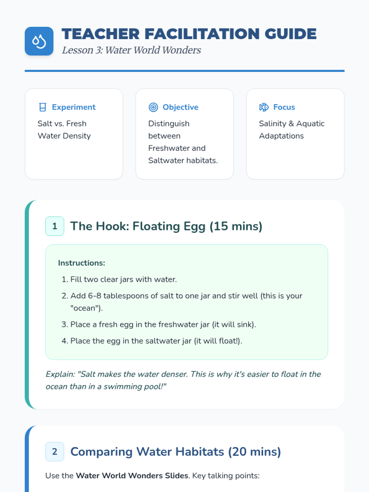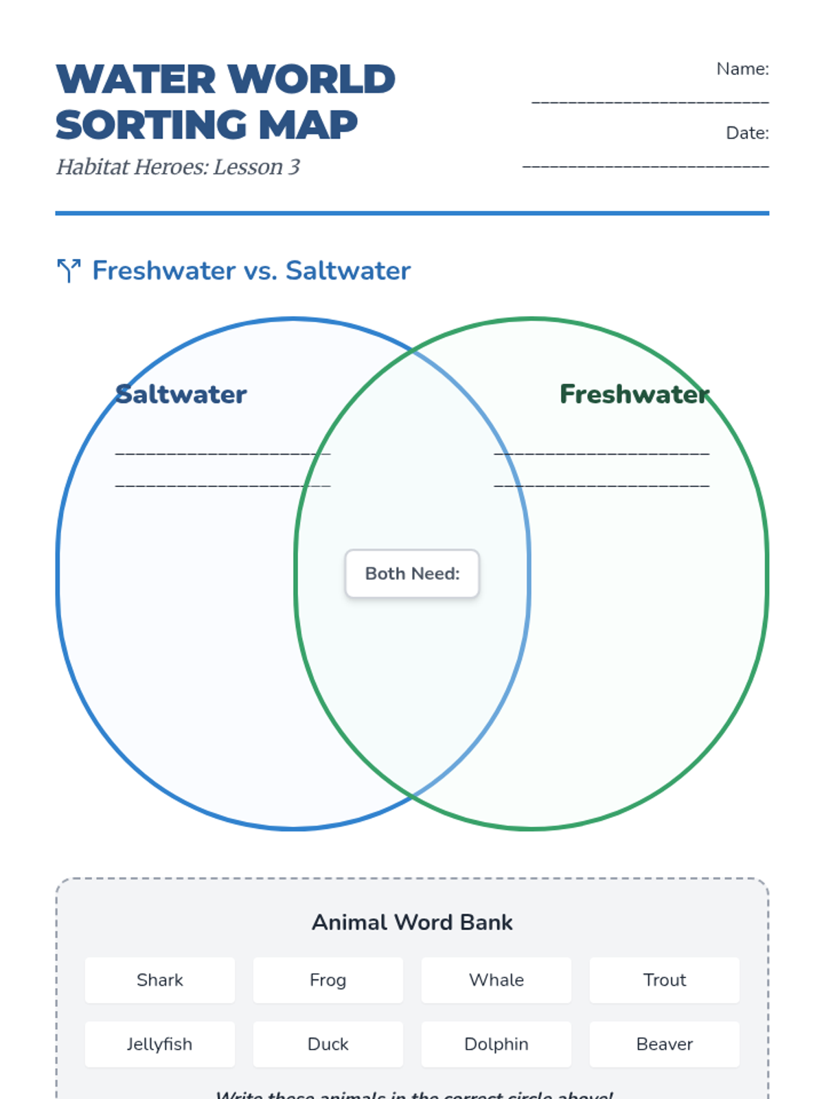 Students distinguish between freshwater and saltwater habitats, investigating how aquatic animals breathe and move in different water environments.