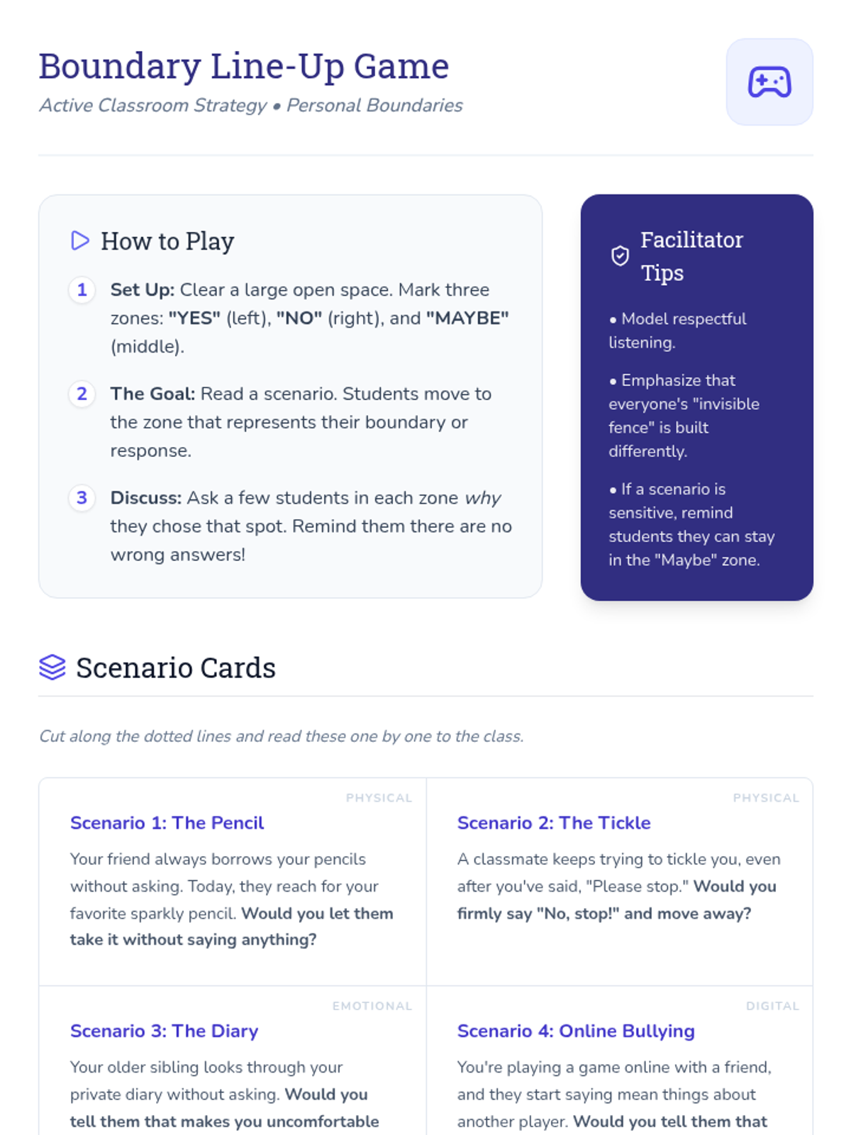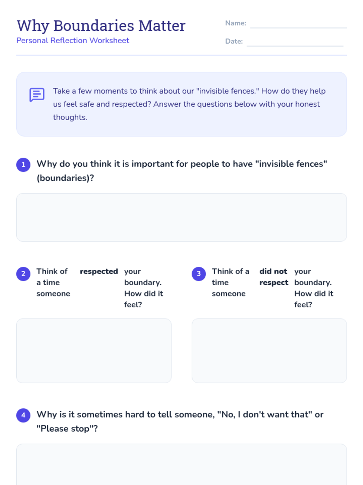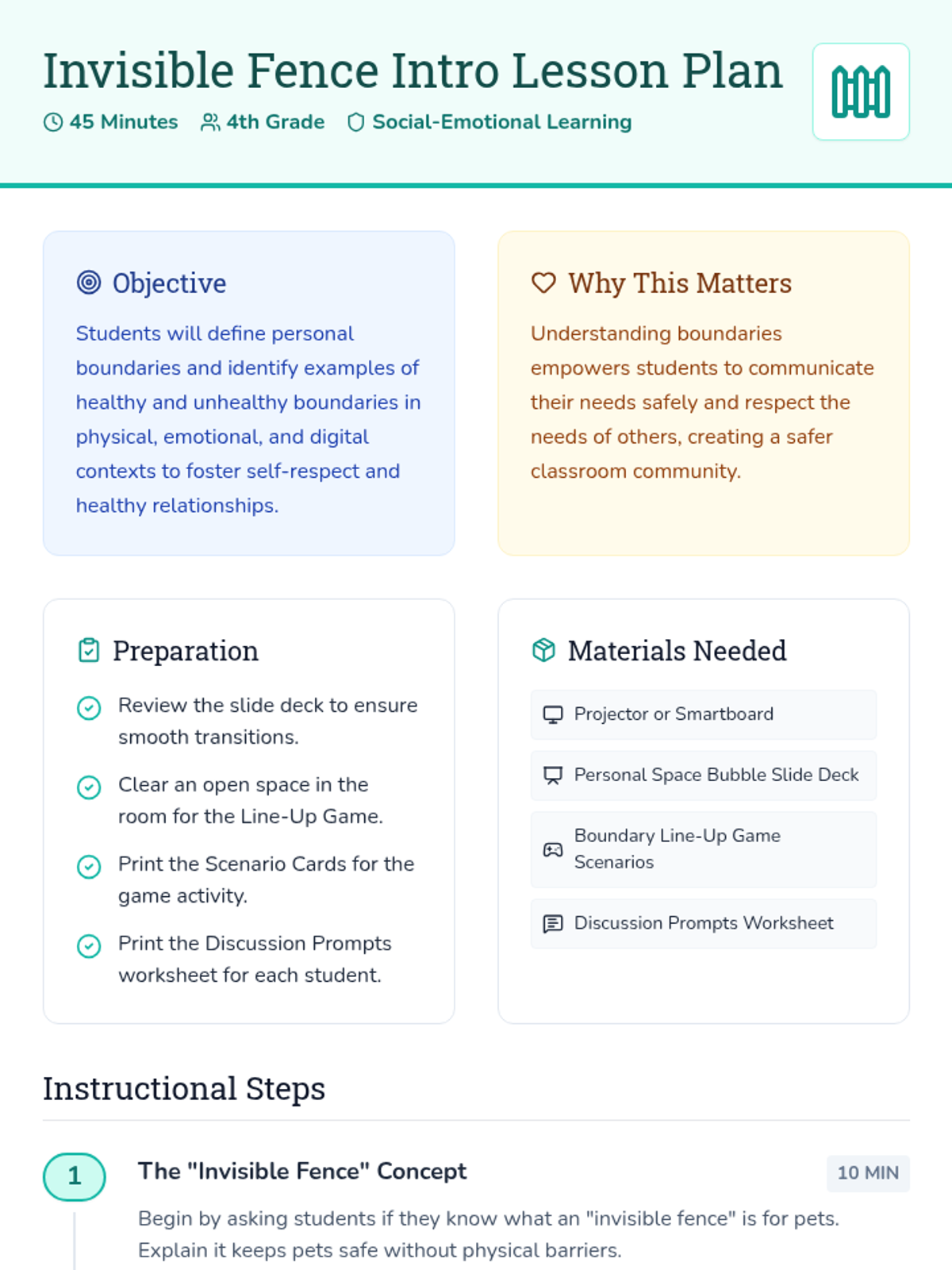 This lesson introduces 4th-grade students to personal boundaries through the 'invisible fence' metaphor, covering physical, emotional, and digital boundaries to promote self-respect and healthy relationships.