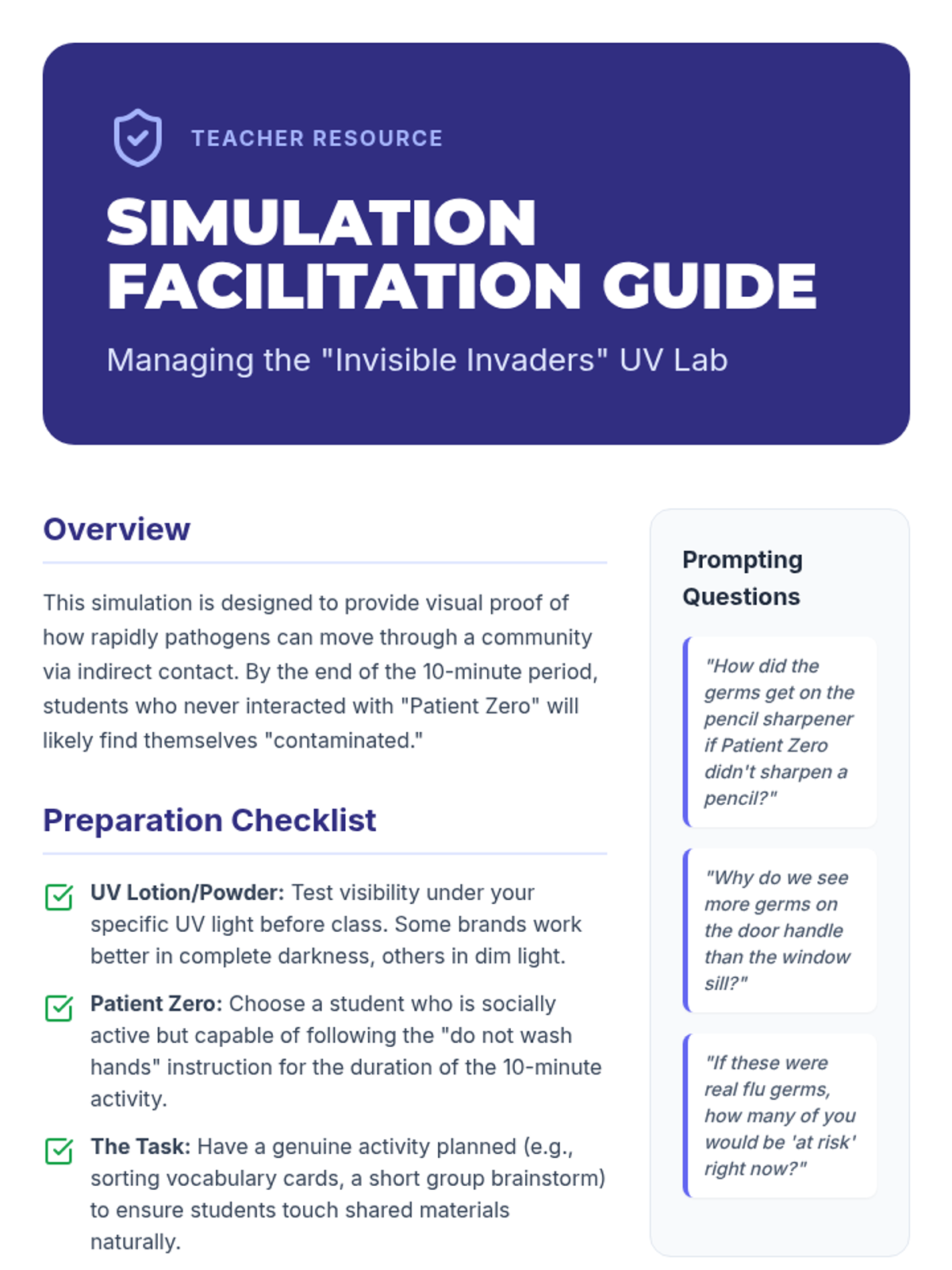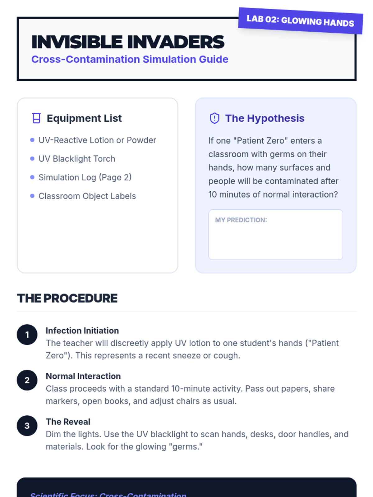 Using UV-reactive materials, students simulate and map the spread of synthetic germs through classroom interactions to understand cross-contamination.