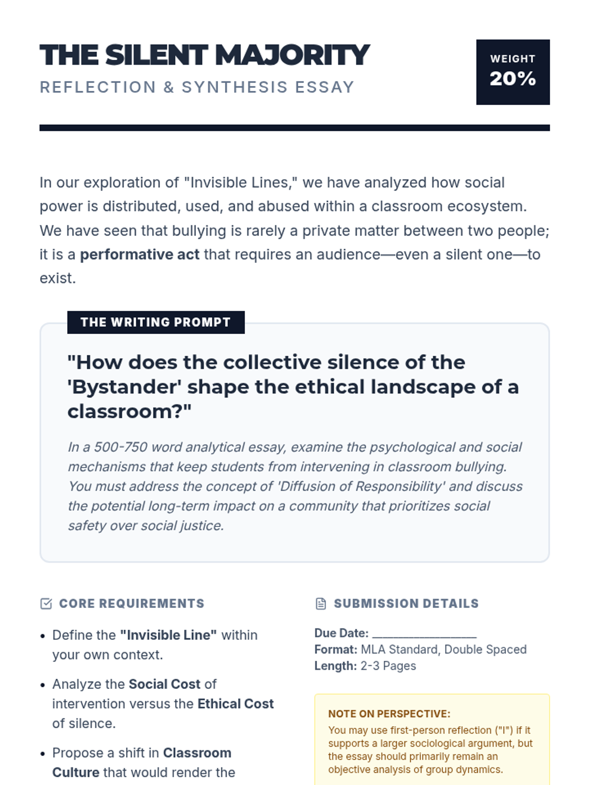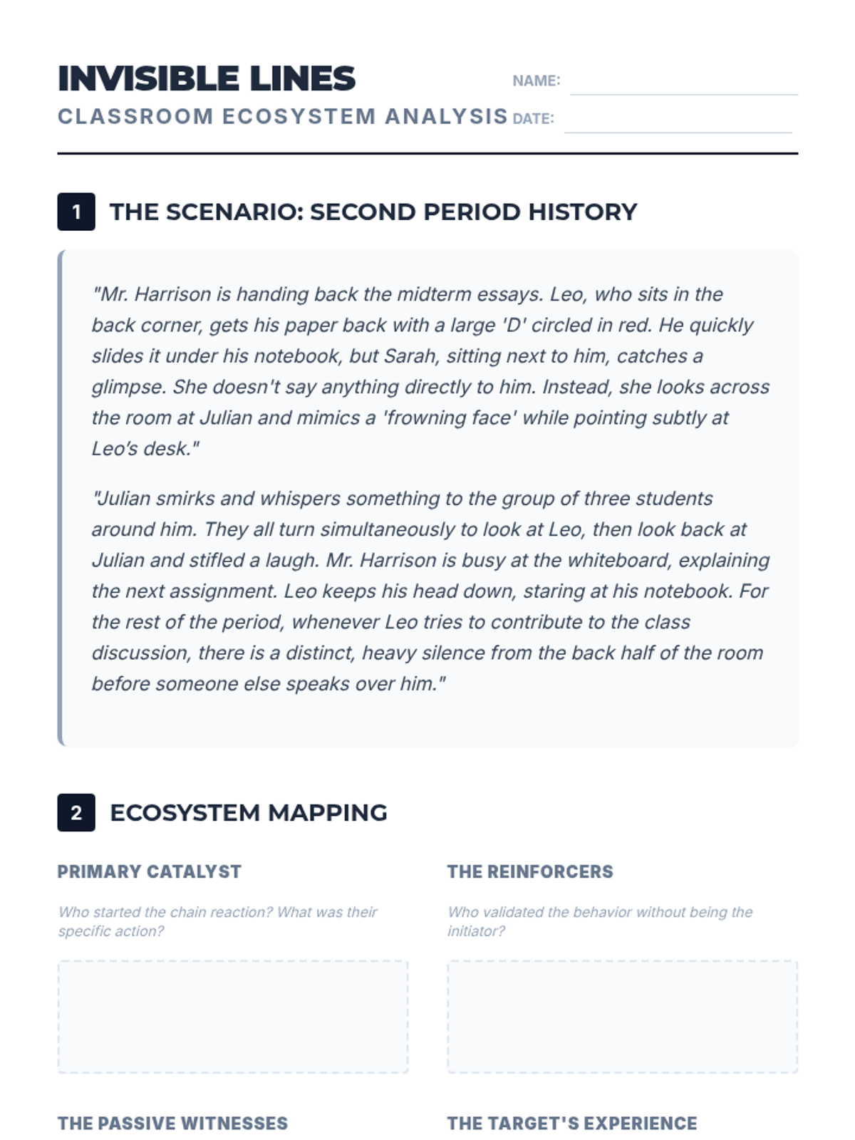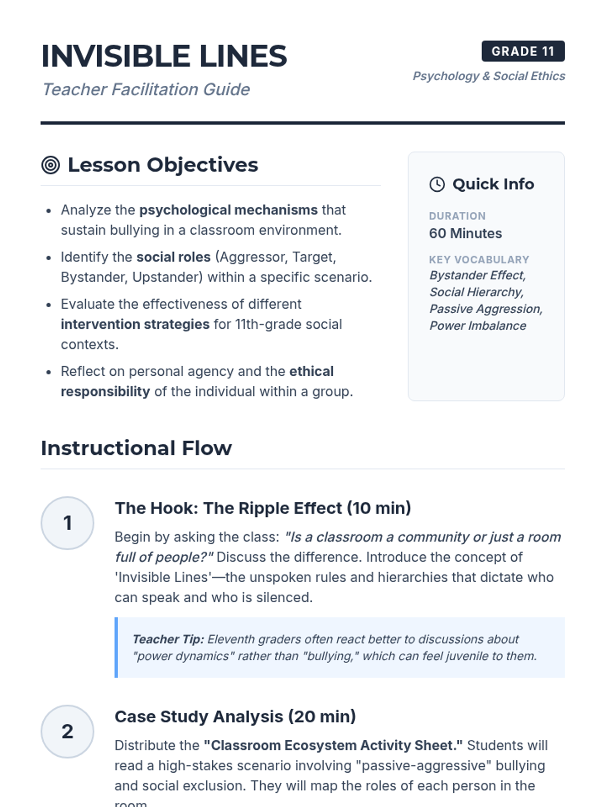 A high school lesson exploring the complex social dynamics of in-person classroom bullying, focusing on bystander intervention and the psychology of social hierarchies.