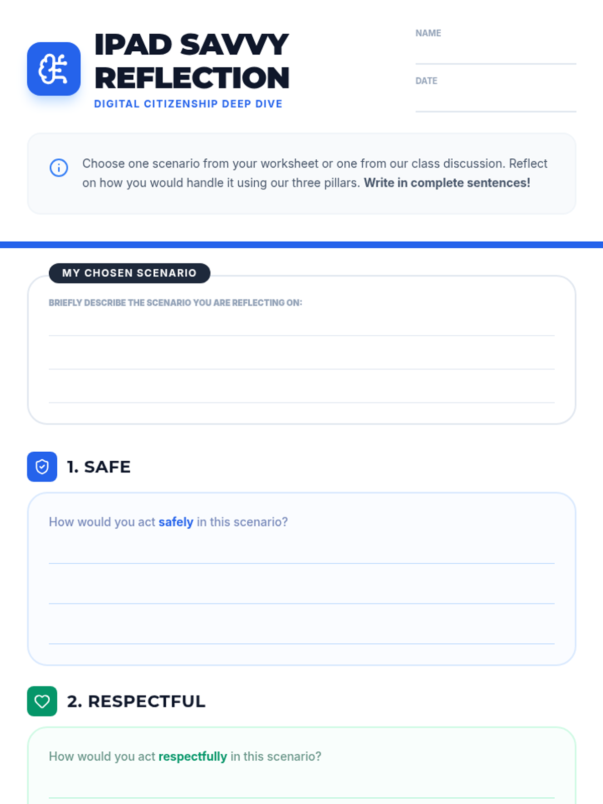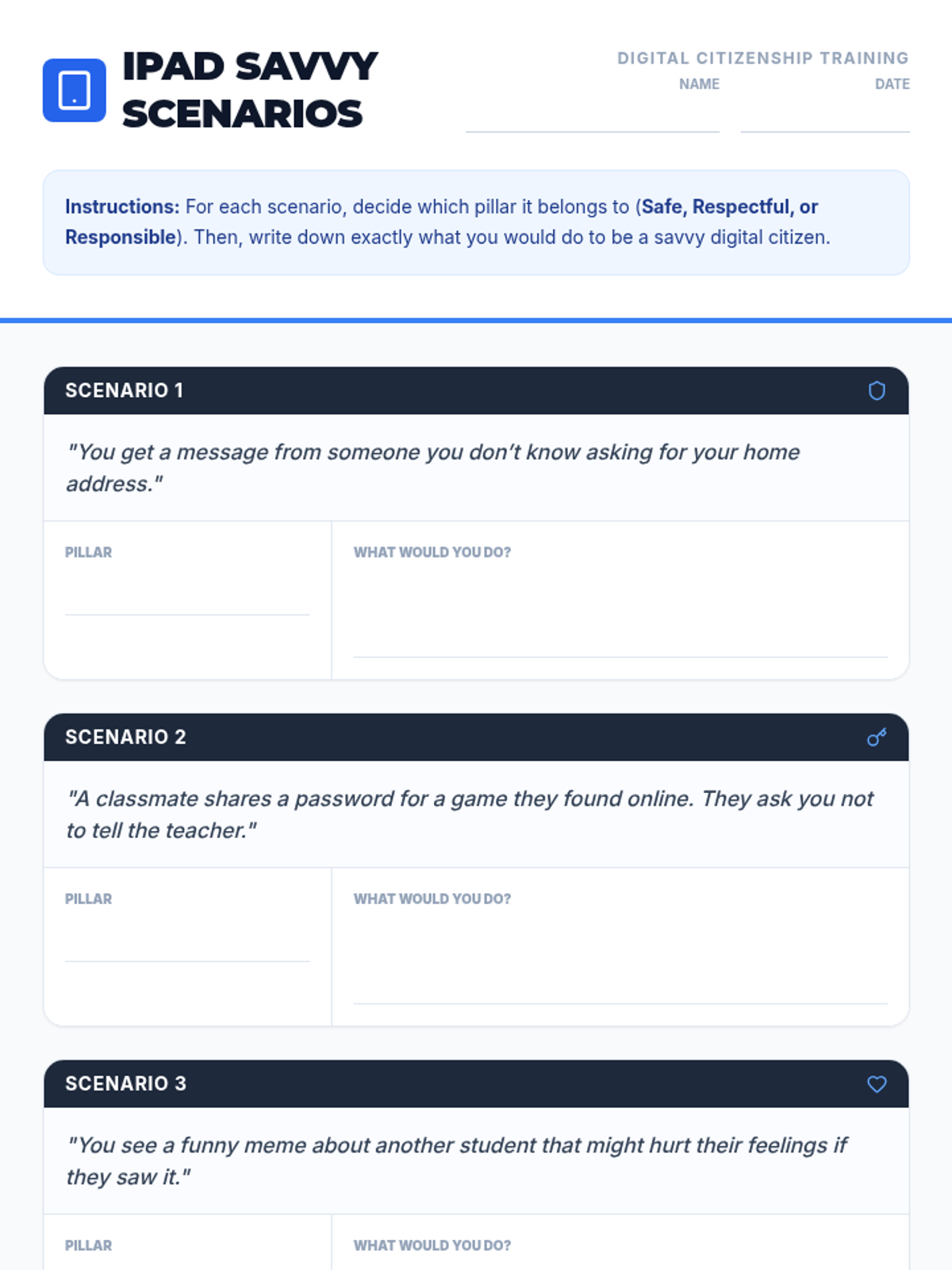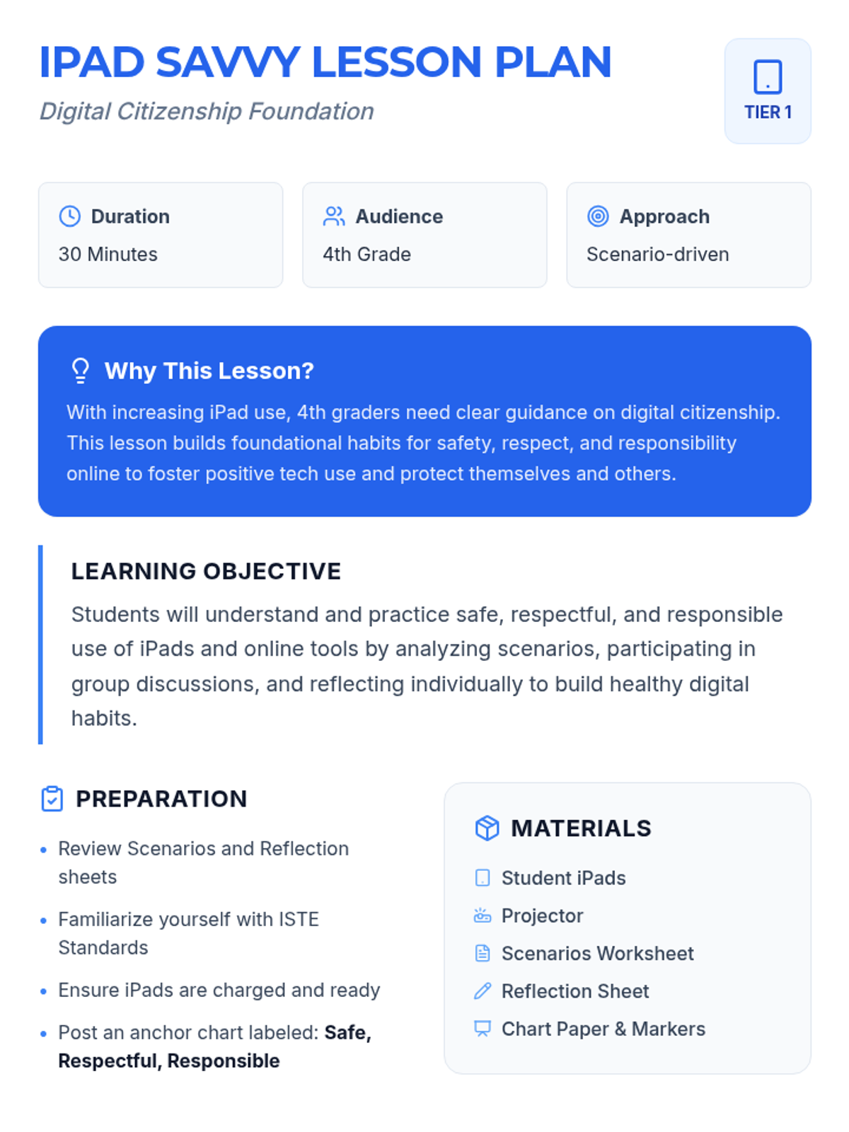 A 30-minute Tier 1 lesson for 4th graders exploring safe, respectful, and responsible iPad use. Through scenario analysis and reflection, students build foundational digital citizenship habits.