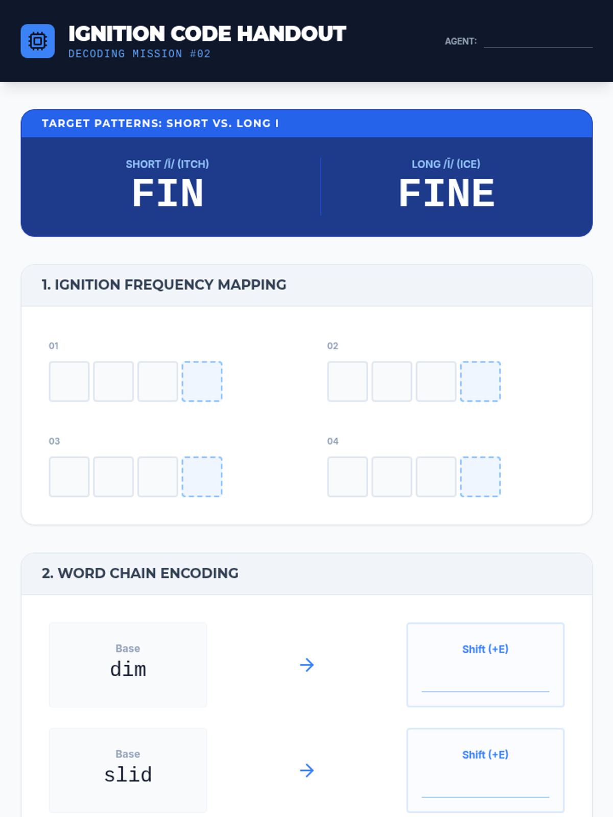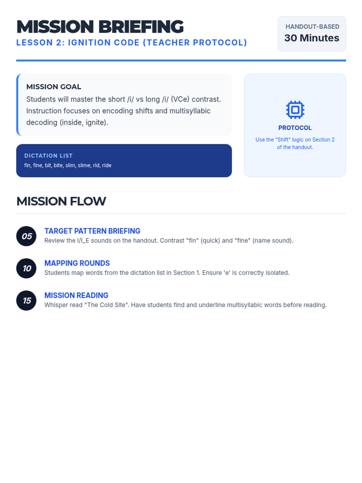 Focuses on short /i/ and long /i/ (VCe) patterns, featuring encoding drills and a mission-based reading passage.