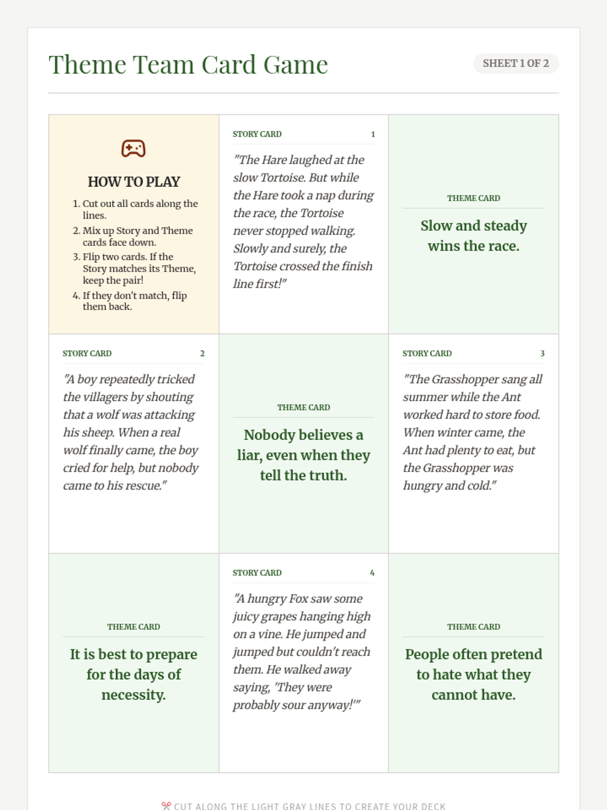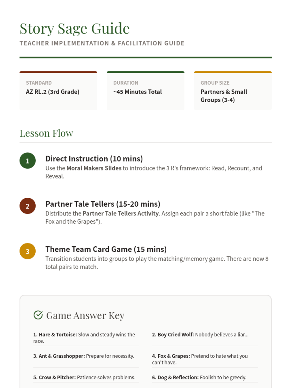 A 3rd-grade lesson focused on recounting stories and identifying themes using partner-based storytelling and a small group matching game. Students will practice summarizing key events and extracting central lessons from diverse fables and folktales.