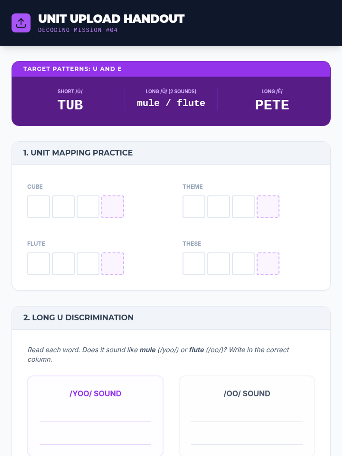Covers short /u/ and /e/ versus their long VCe counterparts, incorporating advanced phoneme-grapheme mapping.