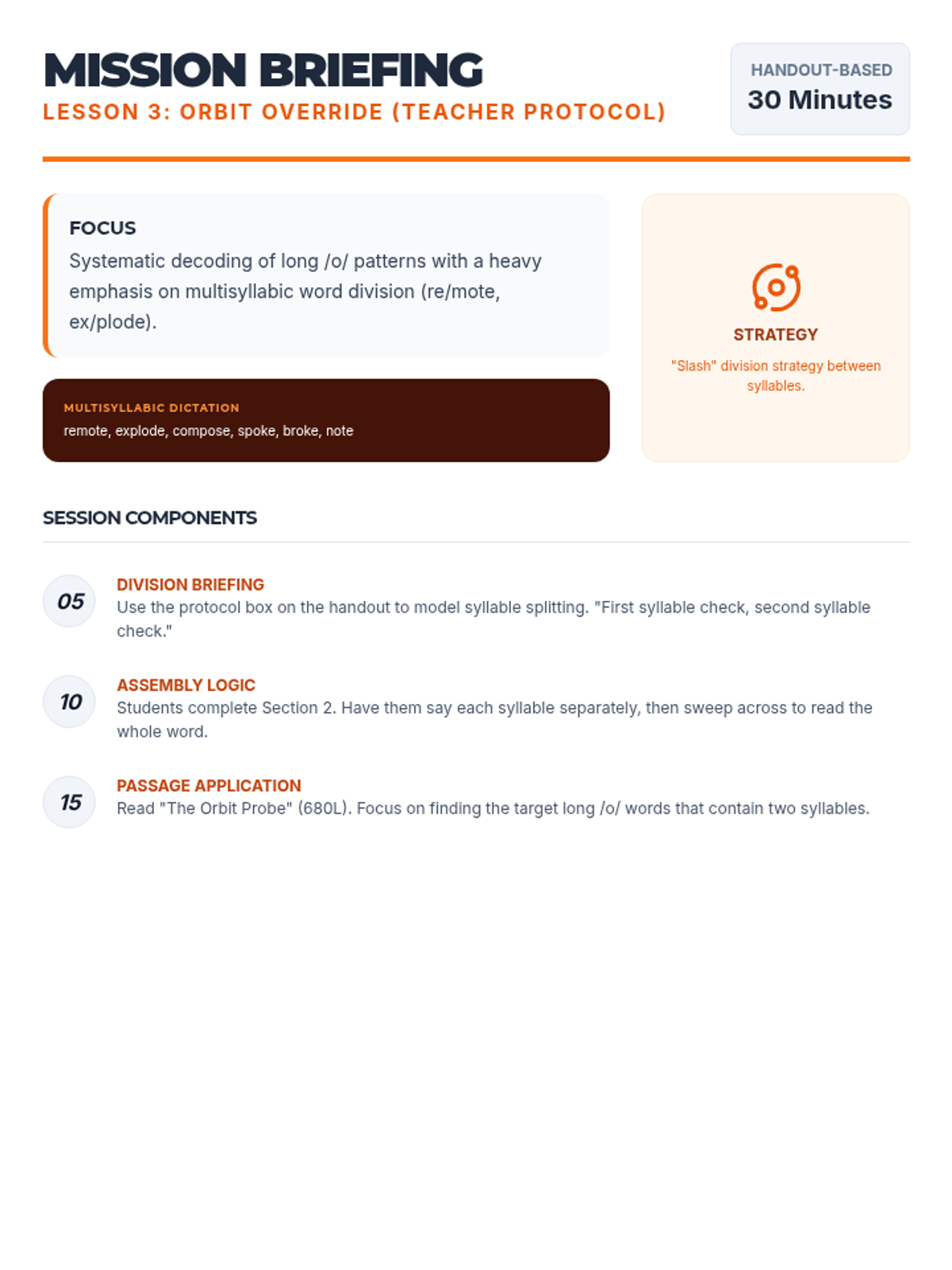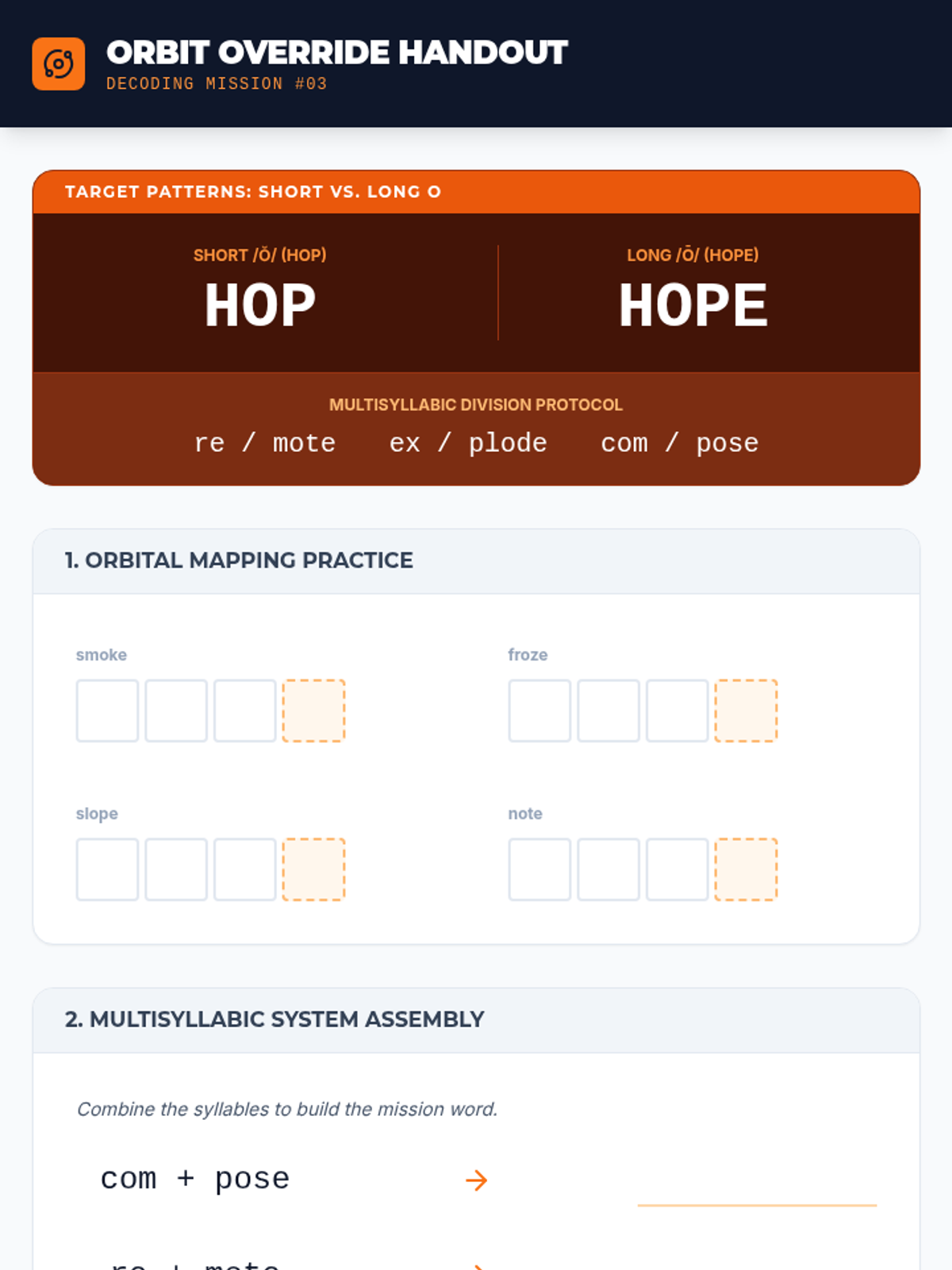Explores short /o/ and long /o/ (VCe) patterns with a focus on multisyllabic word decoding and fluency.