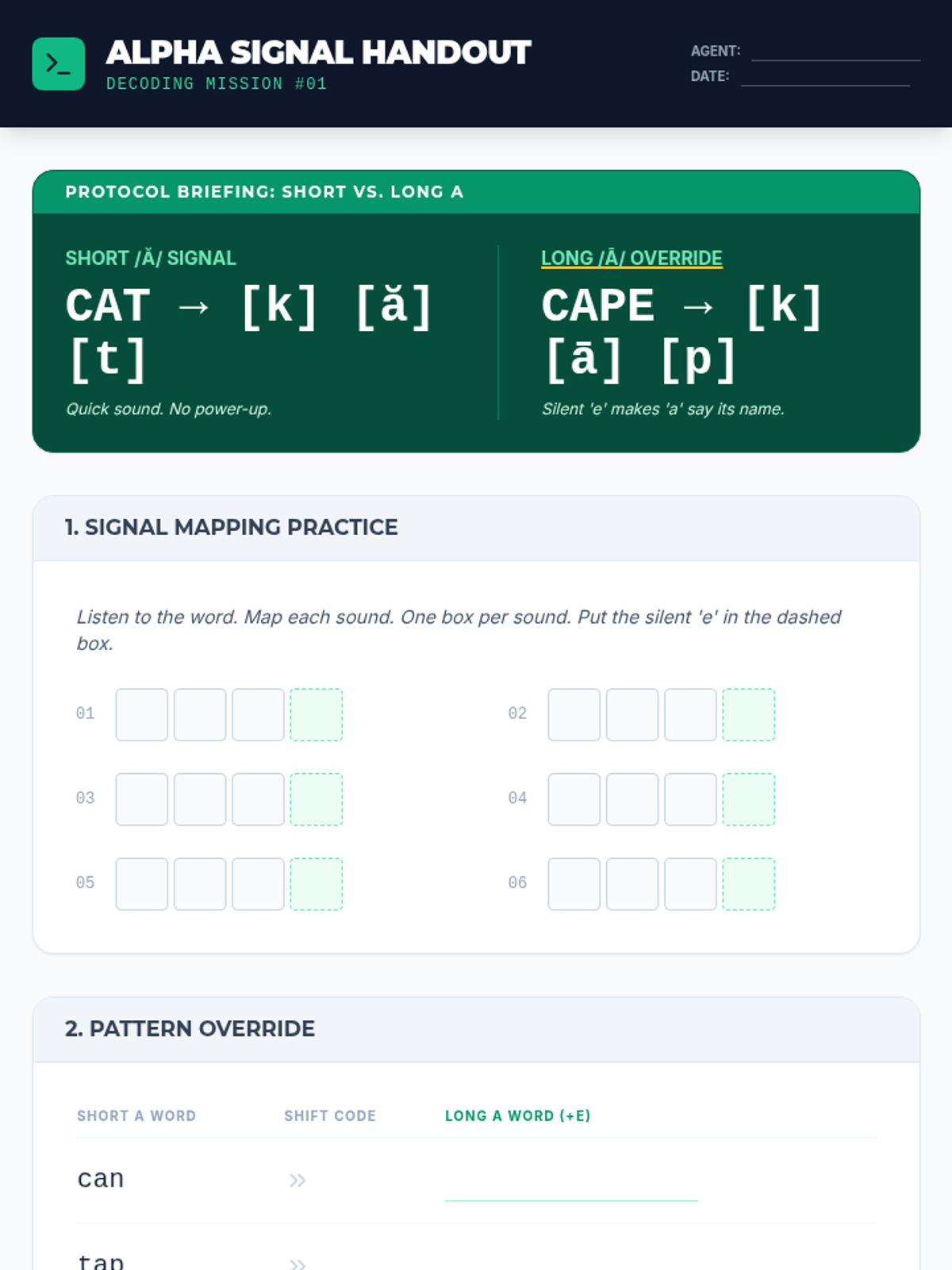 Focuses on discriminating between short /a/ (CVC) and long /a/ (VCe) patterns through phoneme-grapheme mapping and targeted decoding of an encrypted message text.
