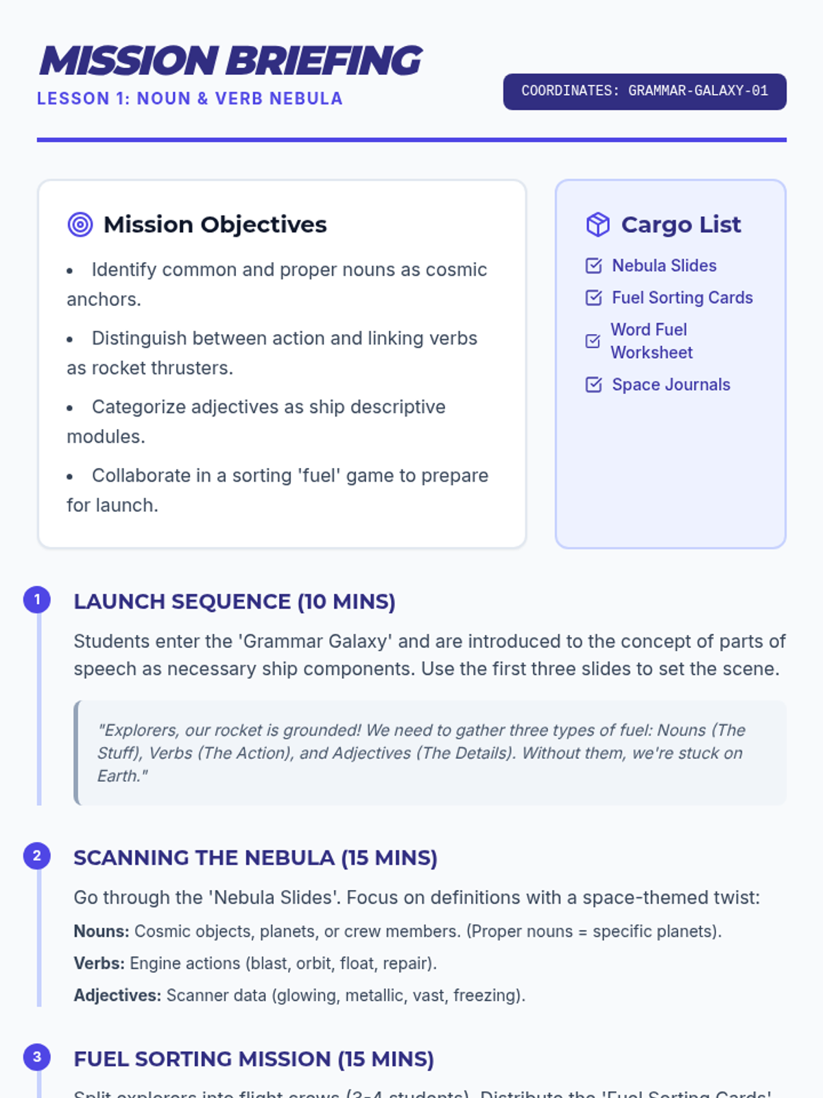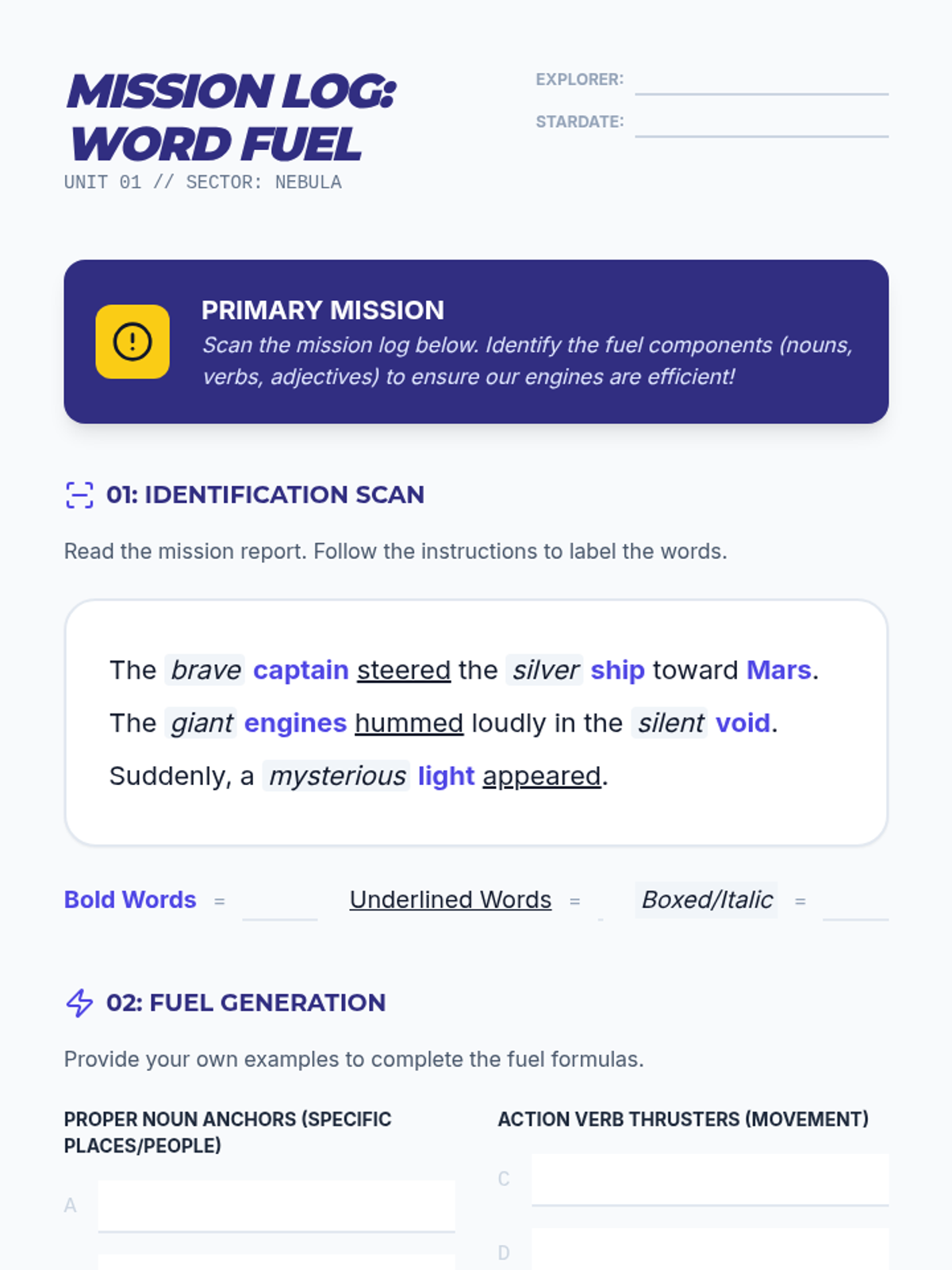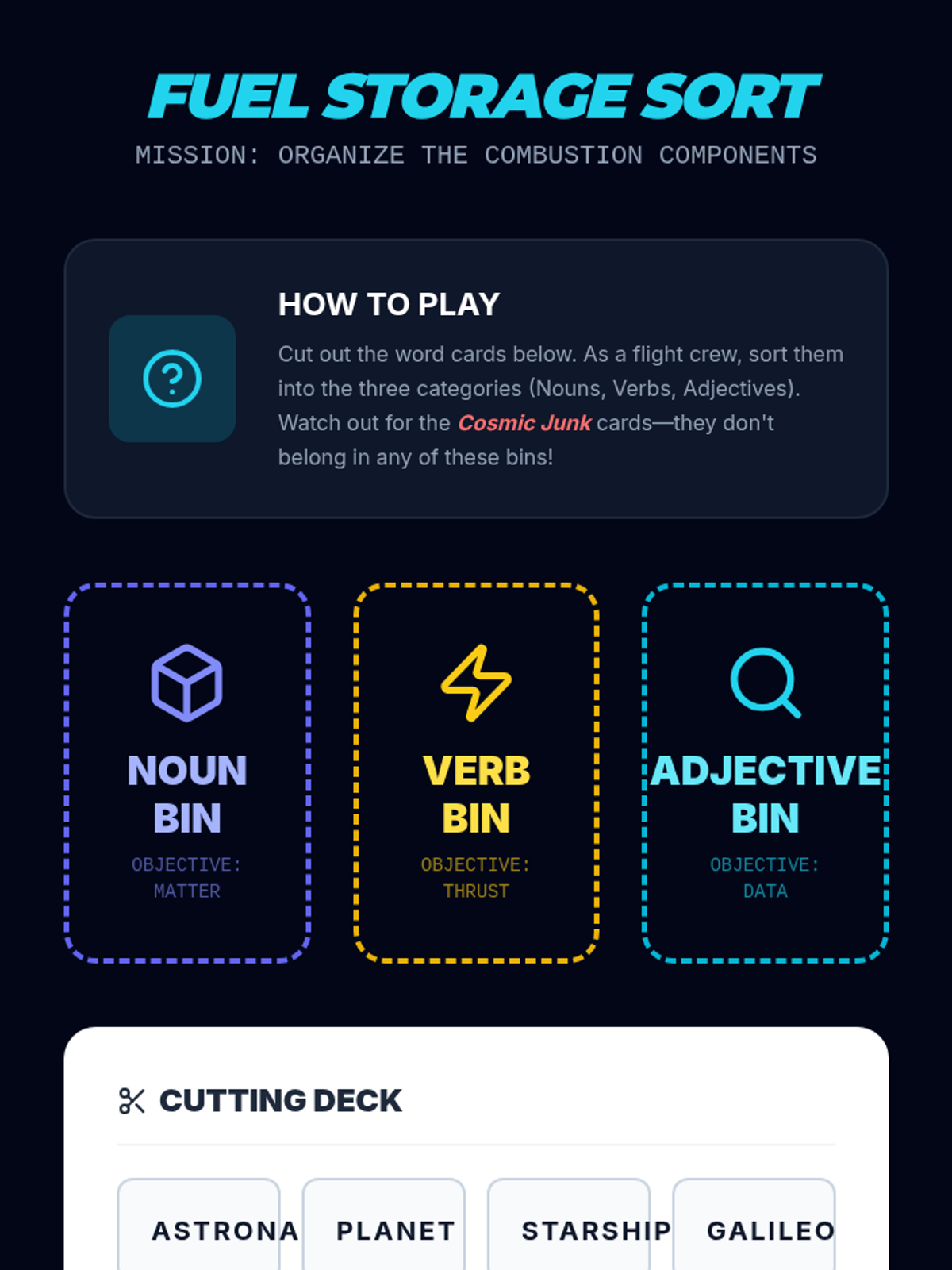 Explorers identify and categorize nouns, verbs, and adjectives to gather 'fuel' for their galactic journey.