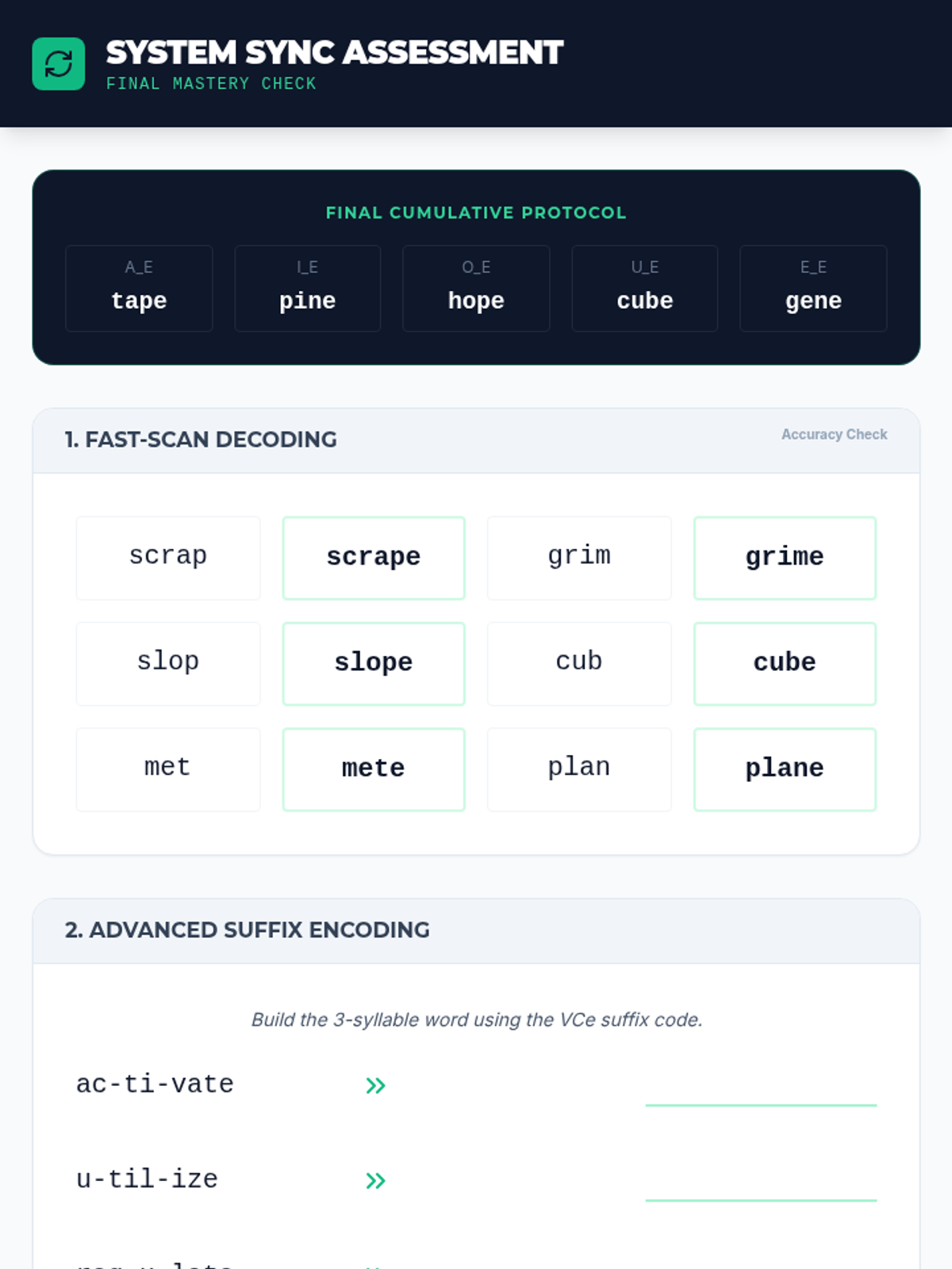 A cumulative review of all long and short vowel patterns (A, E, I, O, U) within a complex "System Sync" text reaching higher Lexile levels.