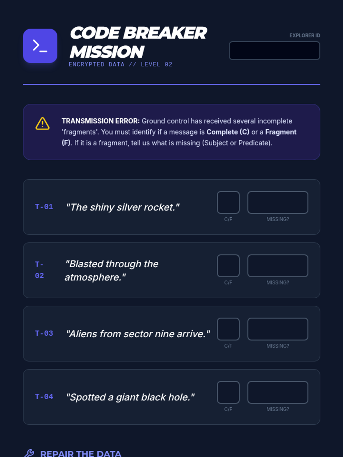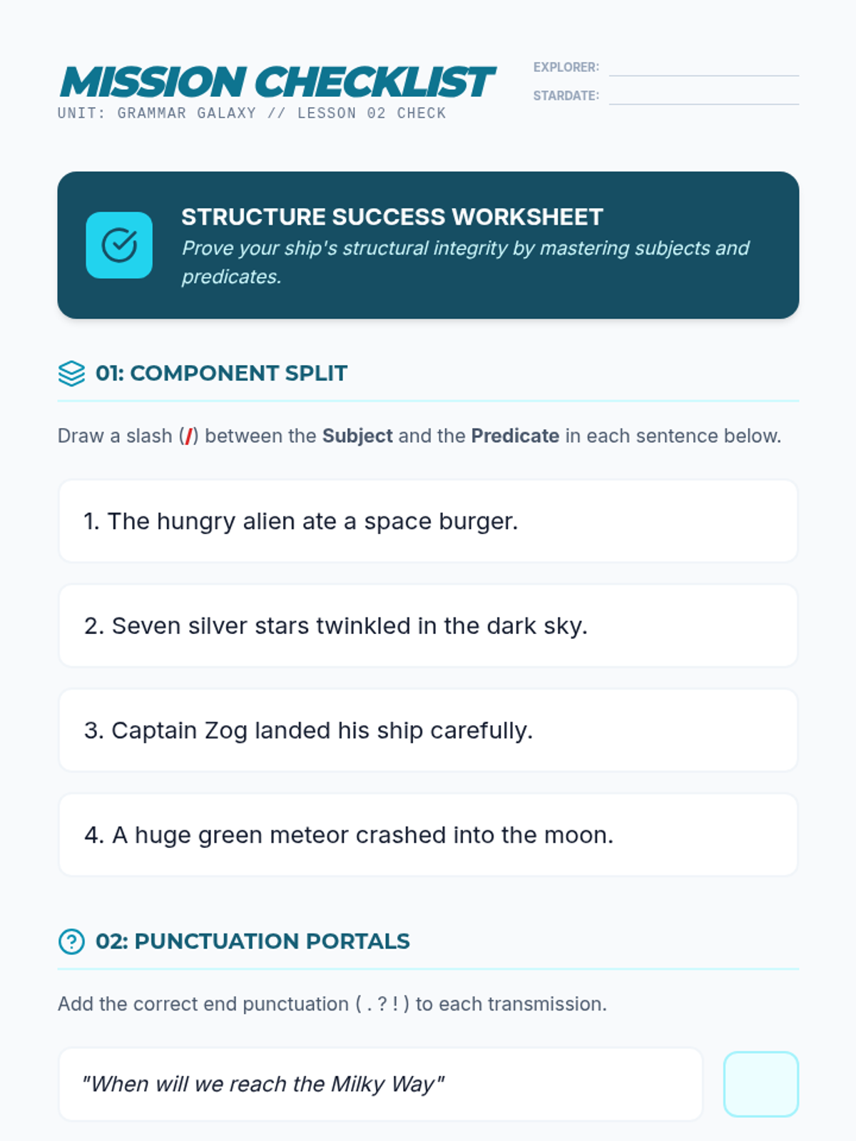 Students master the mechanics of subjects and predicates to build stable 'sentence ships' and navigate through syntax space.