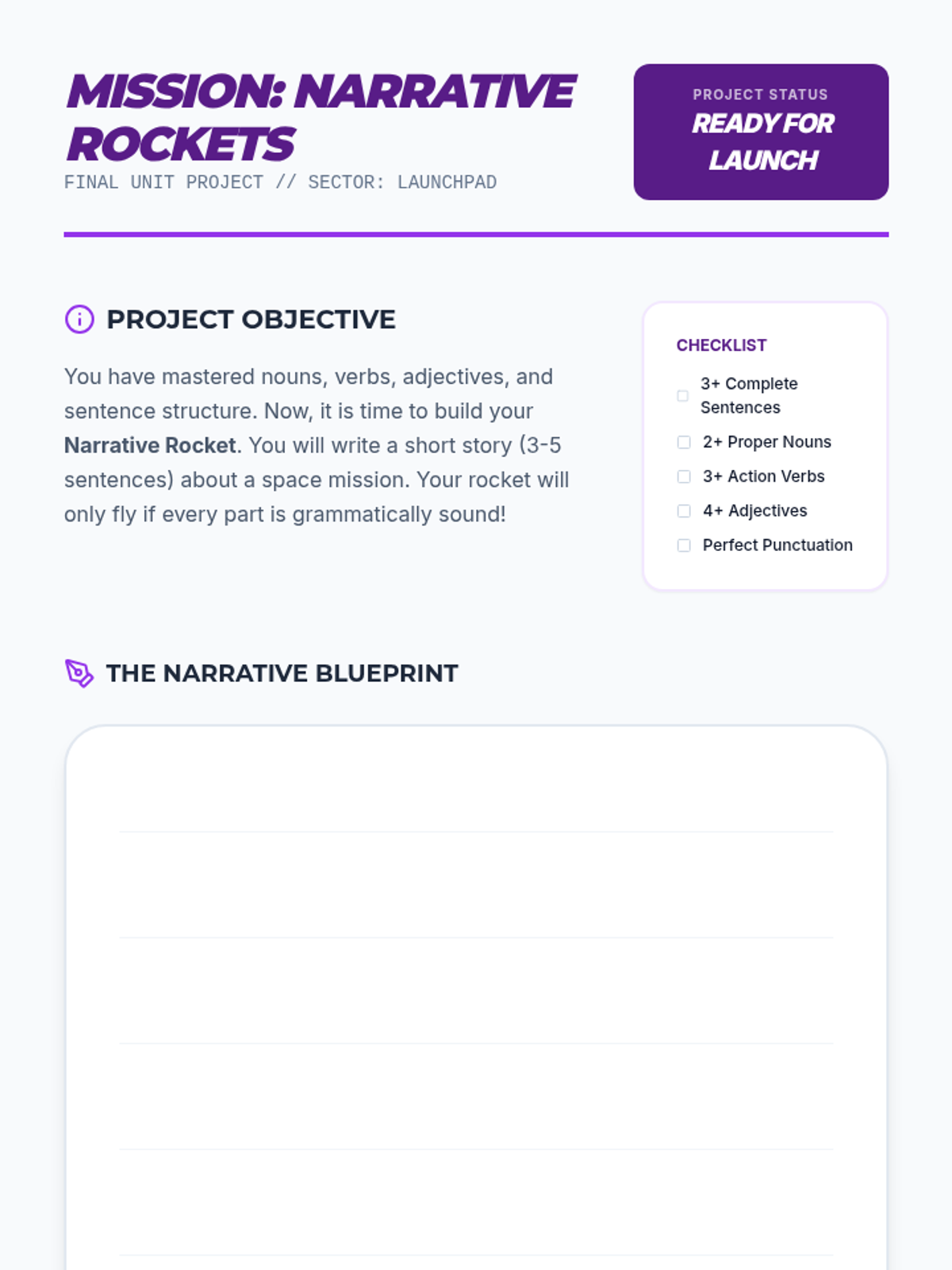 The final mission focuses on mastering punctuation 'portals' and launching the Narrative Rocket creative writing project.