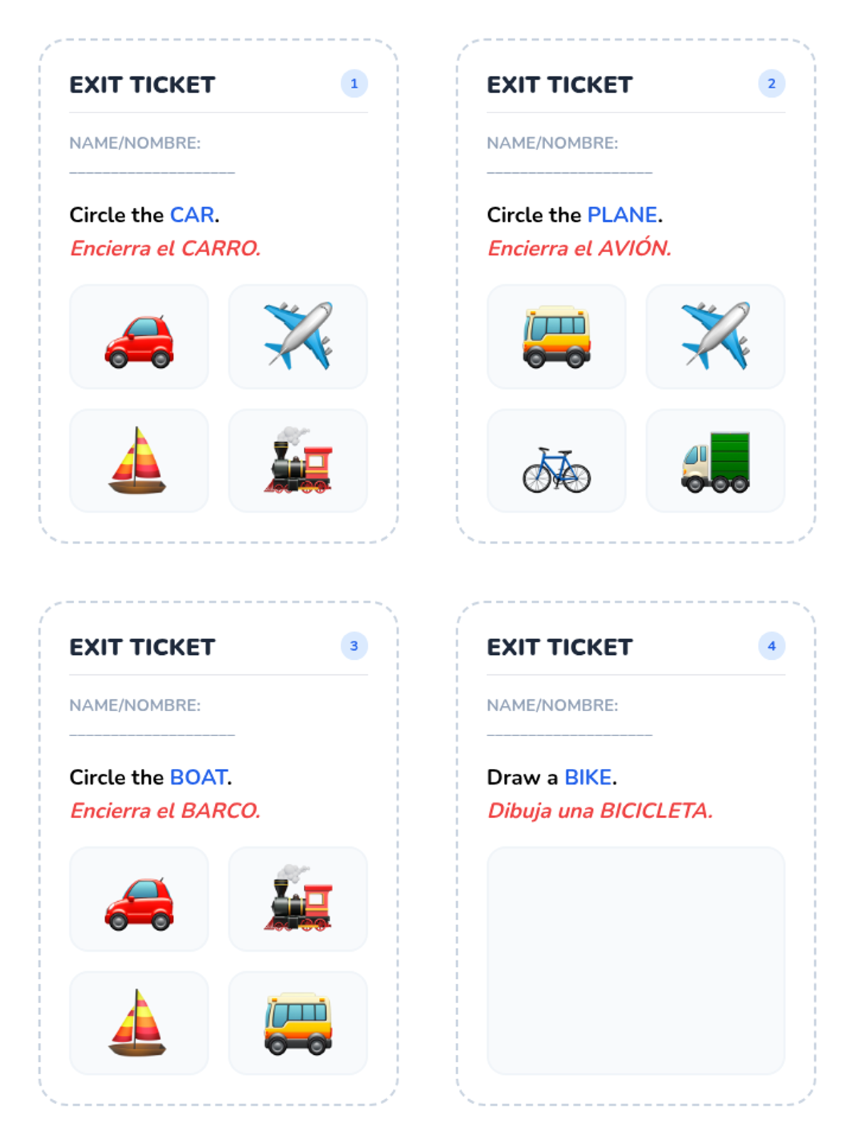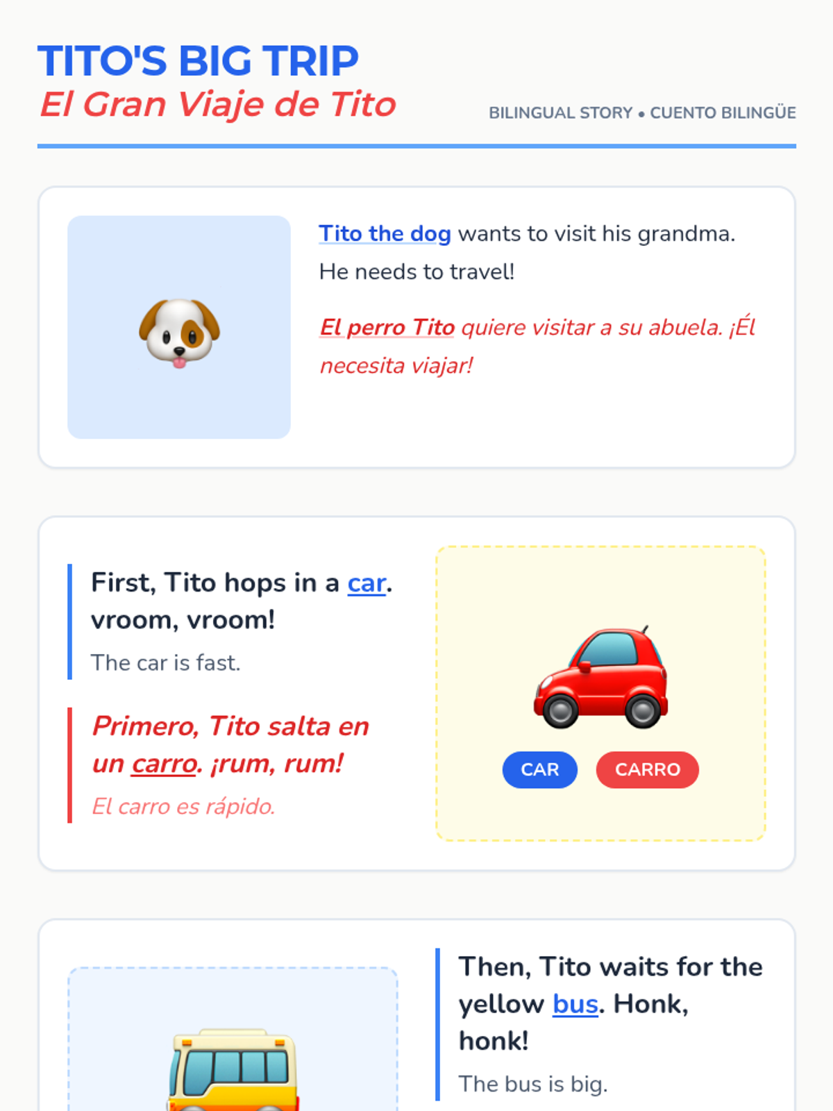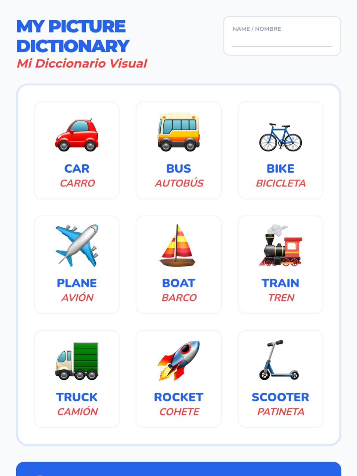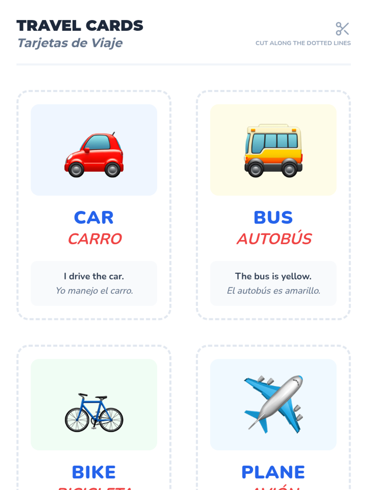An introductory lesson to common modes of transportation using a bilingual story and visual vocabulary support.