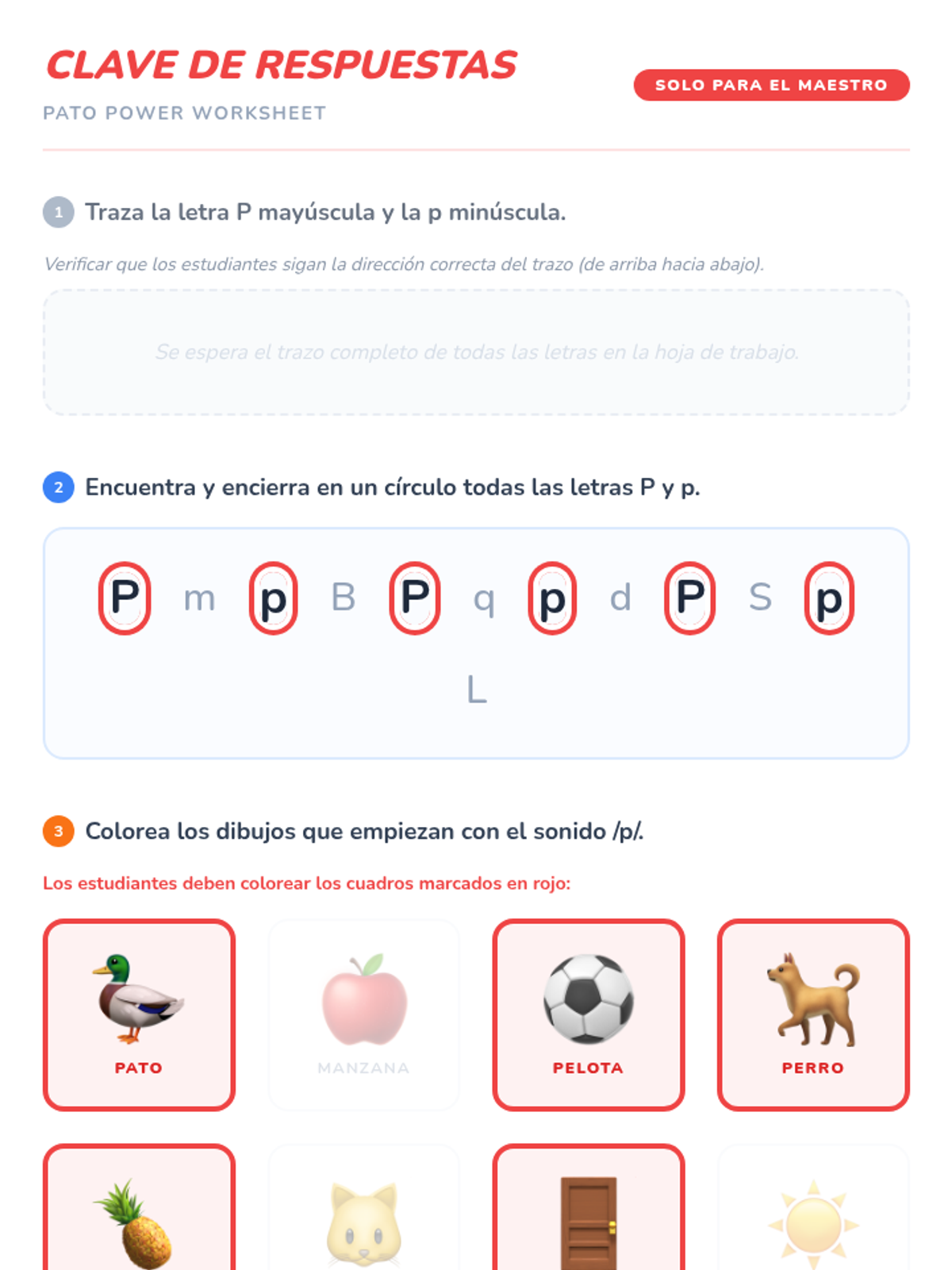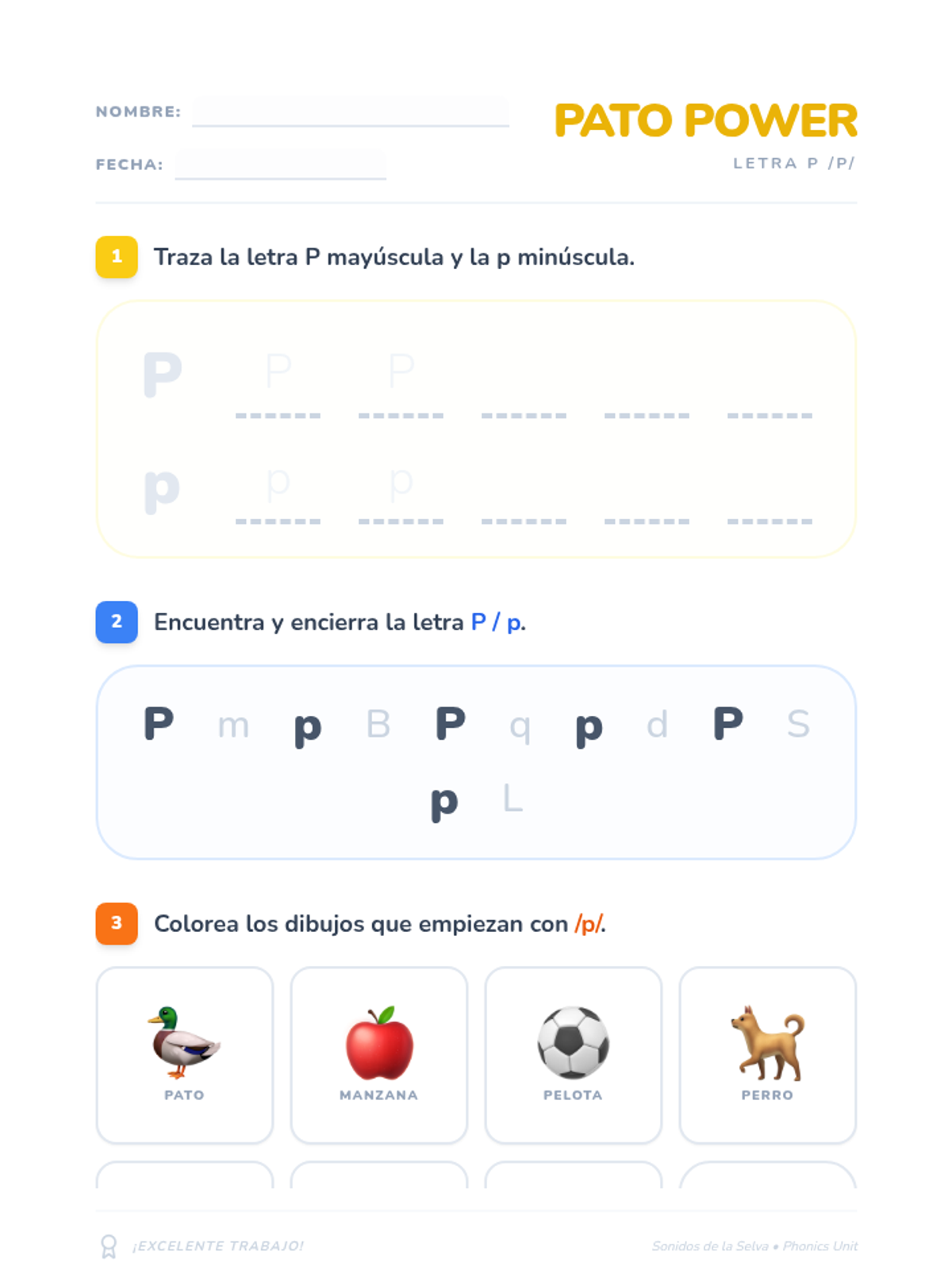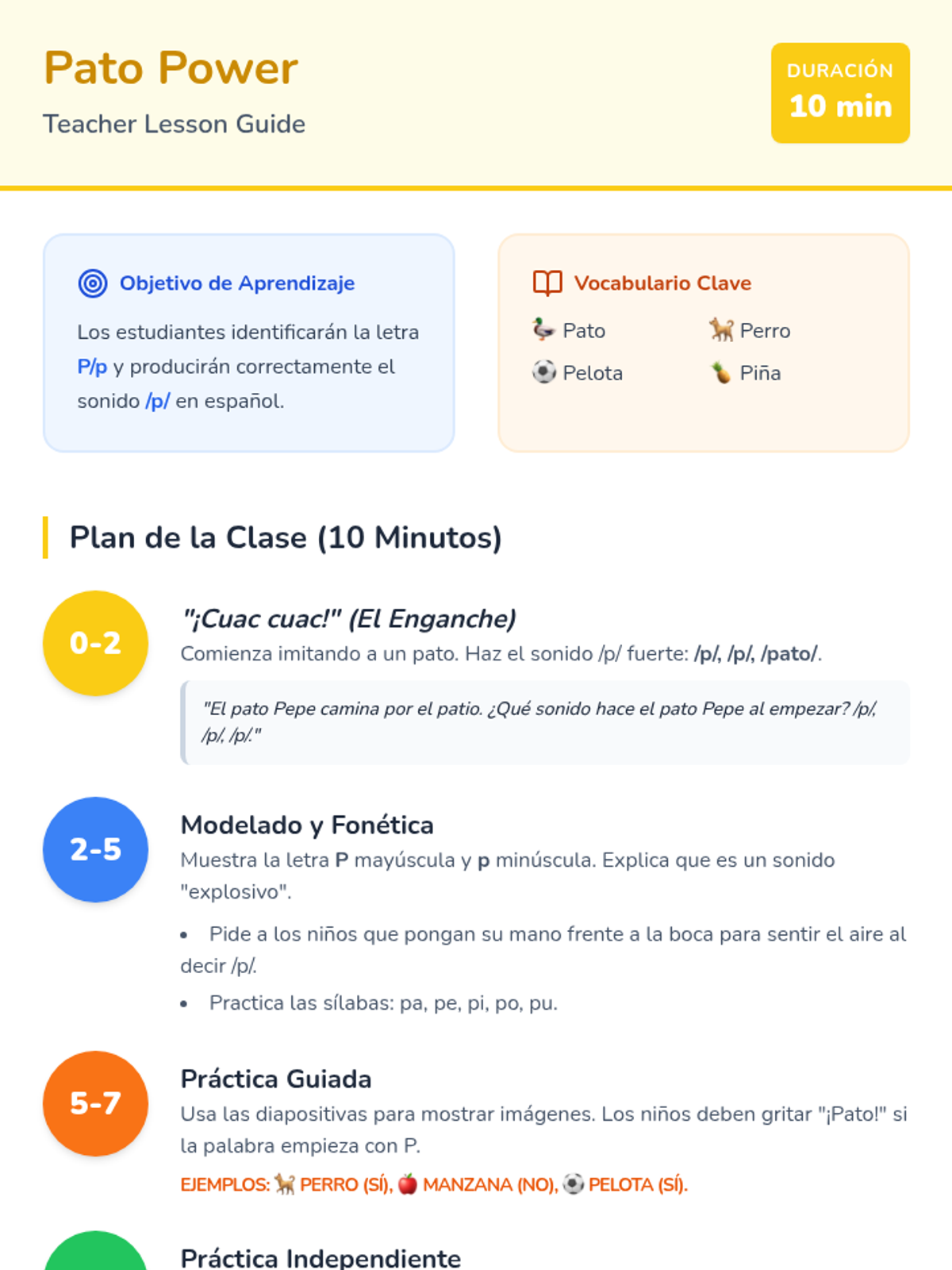 A quick, engaging 10-minute Spanish mini-lesson introducing the letter P and its sound /p/ through a fun duck theme. Includes a teacher guide, interactive slides, and a practice worksheet.