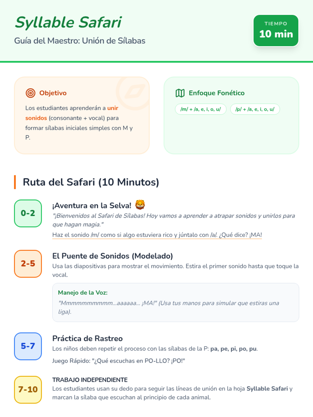 Una mini-lección de 10 minutos diseñada para enseñar el sonido inicial de la letra 'p' y la formación de sílabas (pa, pe, pi, po, pu) a través de actividades visuales, juegos de emparejamiento y práctica individual.