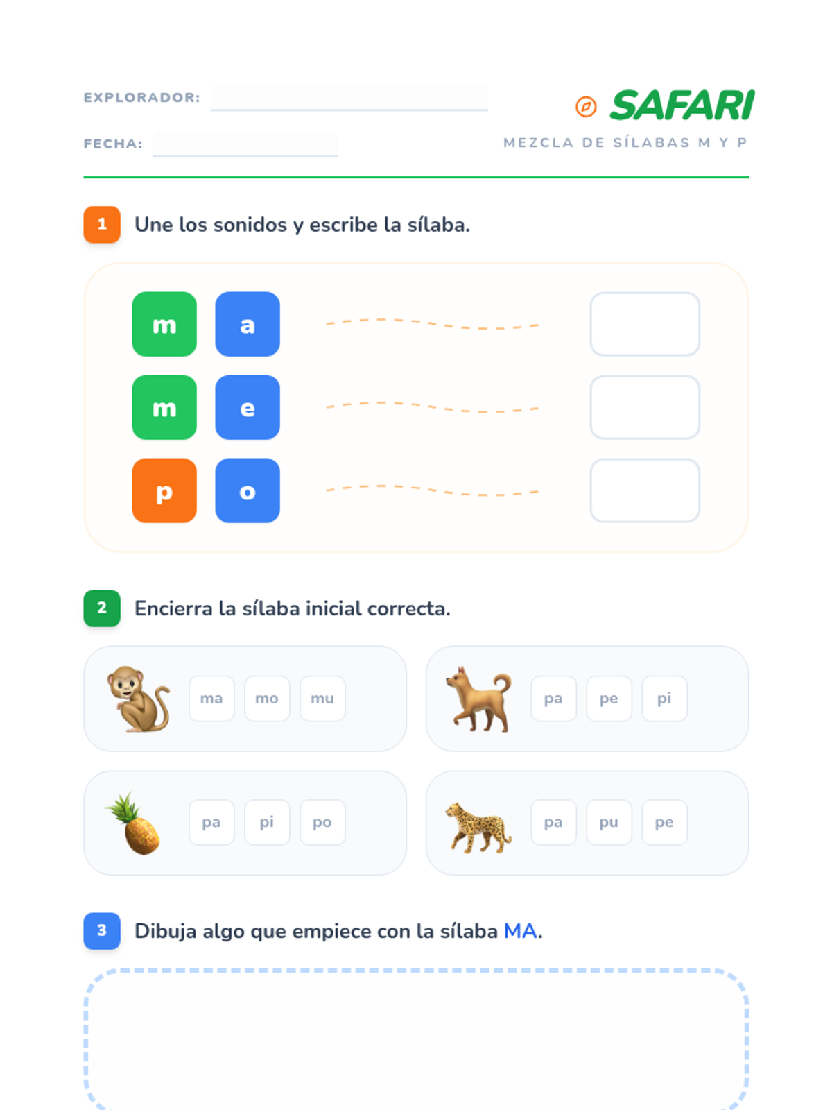 A high-energy 10-minute mini-lesson focused on blending initial consonant sounds with vowels to form syllables (ma, me, mi, mo, mu and pa, pe, pi, po, pu). Includes teacher instructions, visual blending slides, and a hands-on practice worksheet.