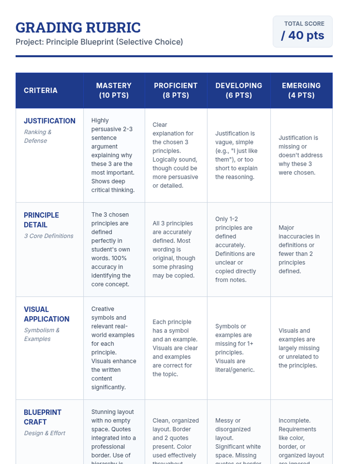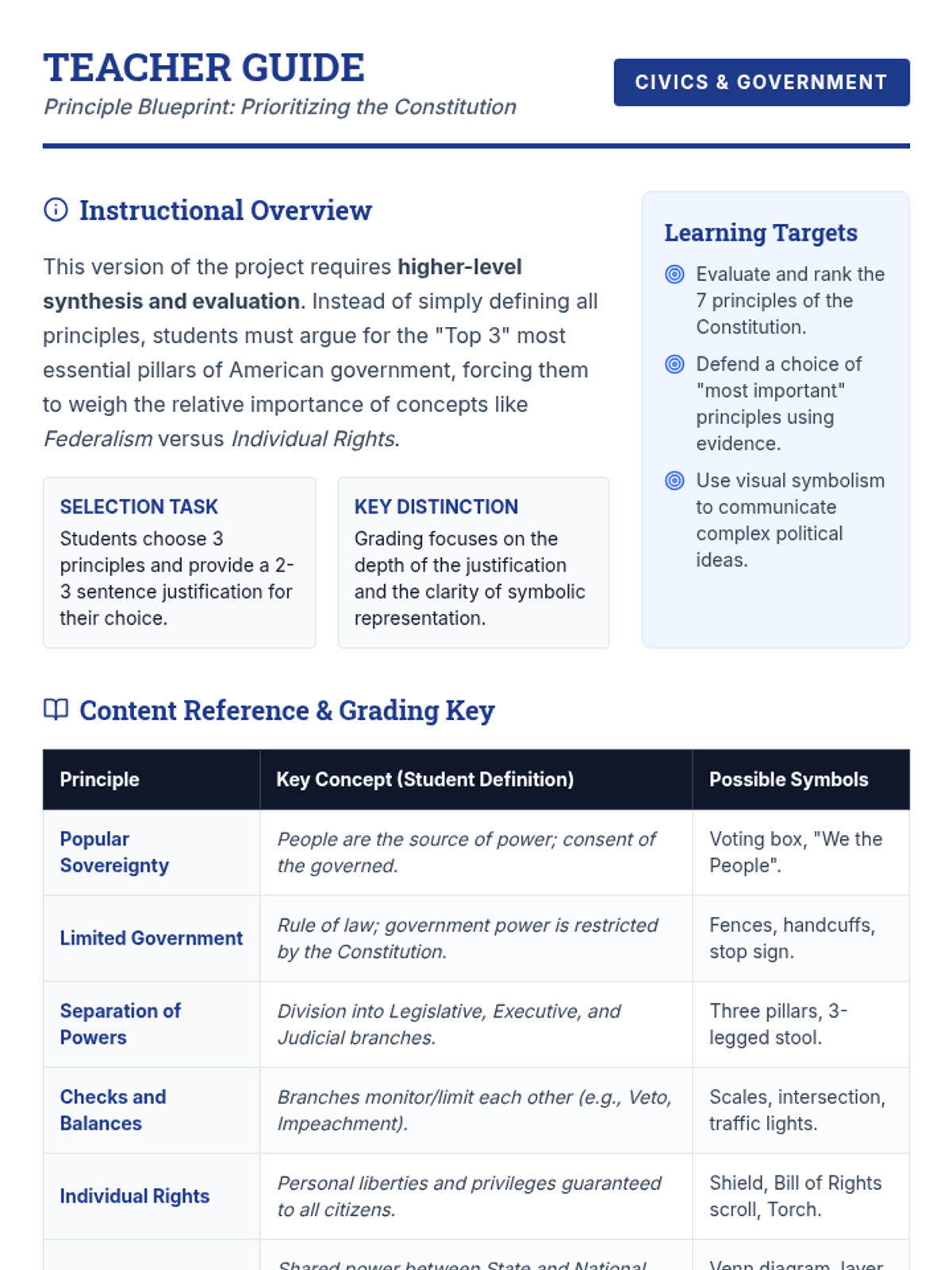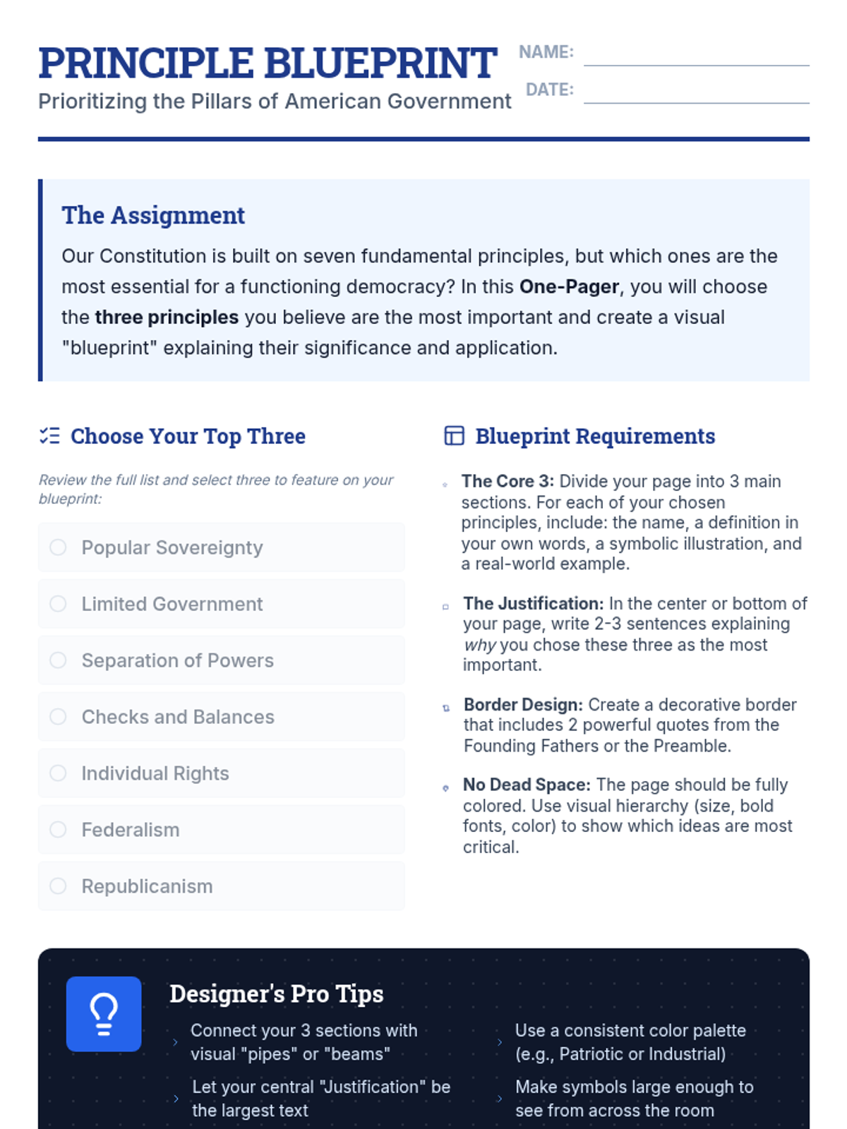 A creative project-based lesson where students synthesize their understanding of the seven fundamental principles of the U.S. Constitution through a visual one-pager assignment.