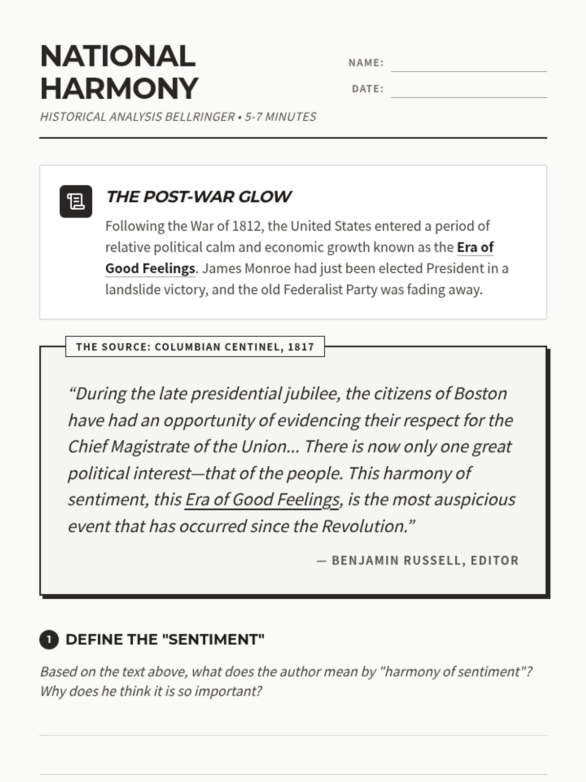 A quick introductory lesson focusing on James Monroe's presidency and the emergence of national unity following the War of 1812.