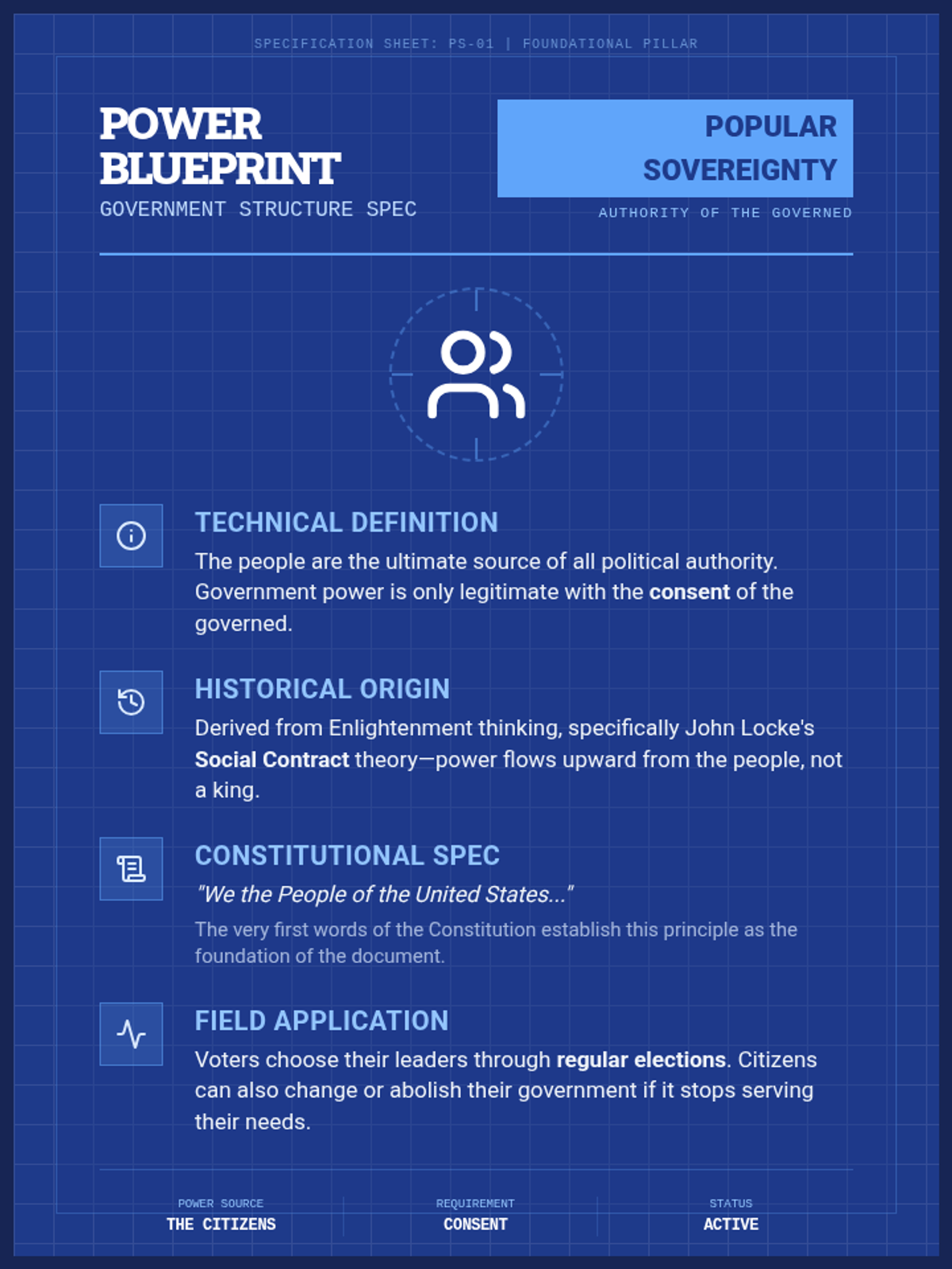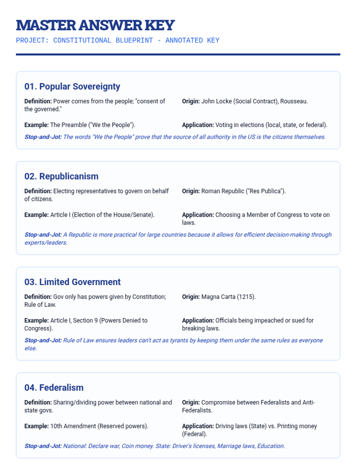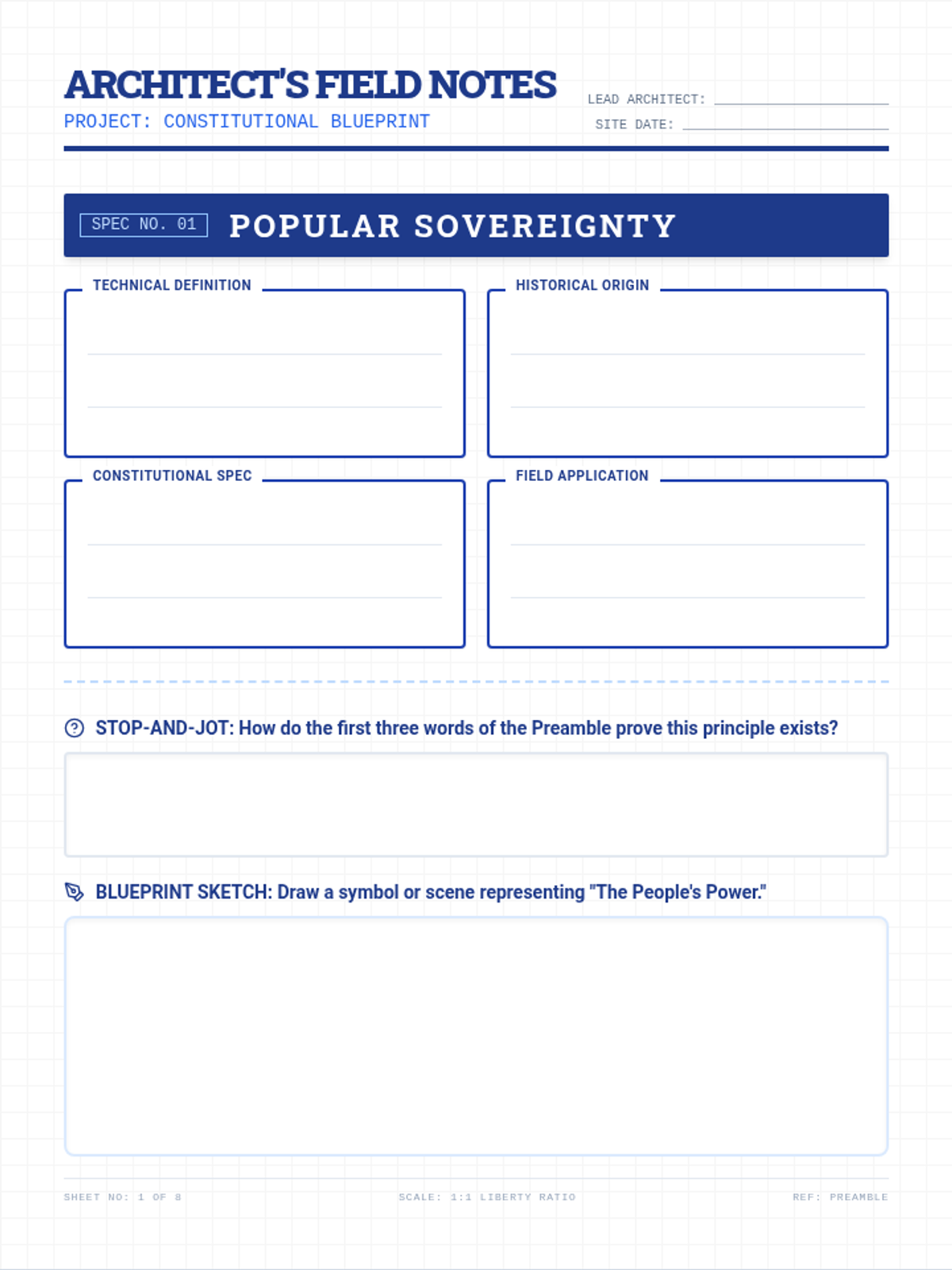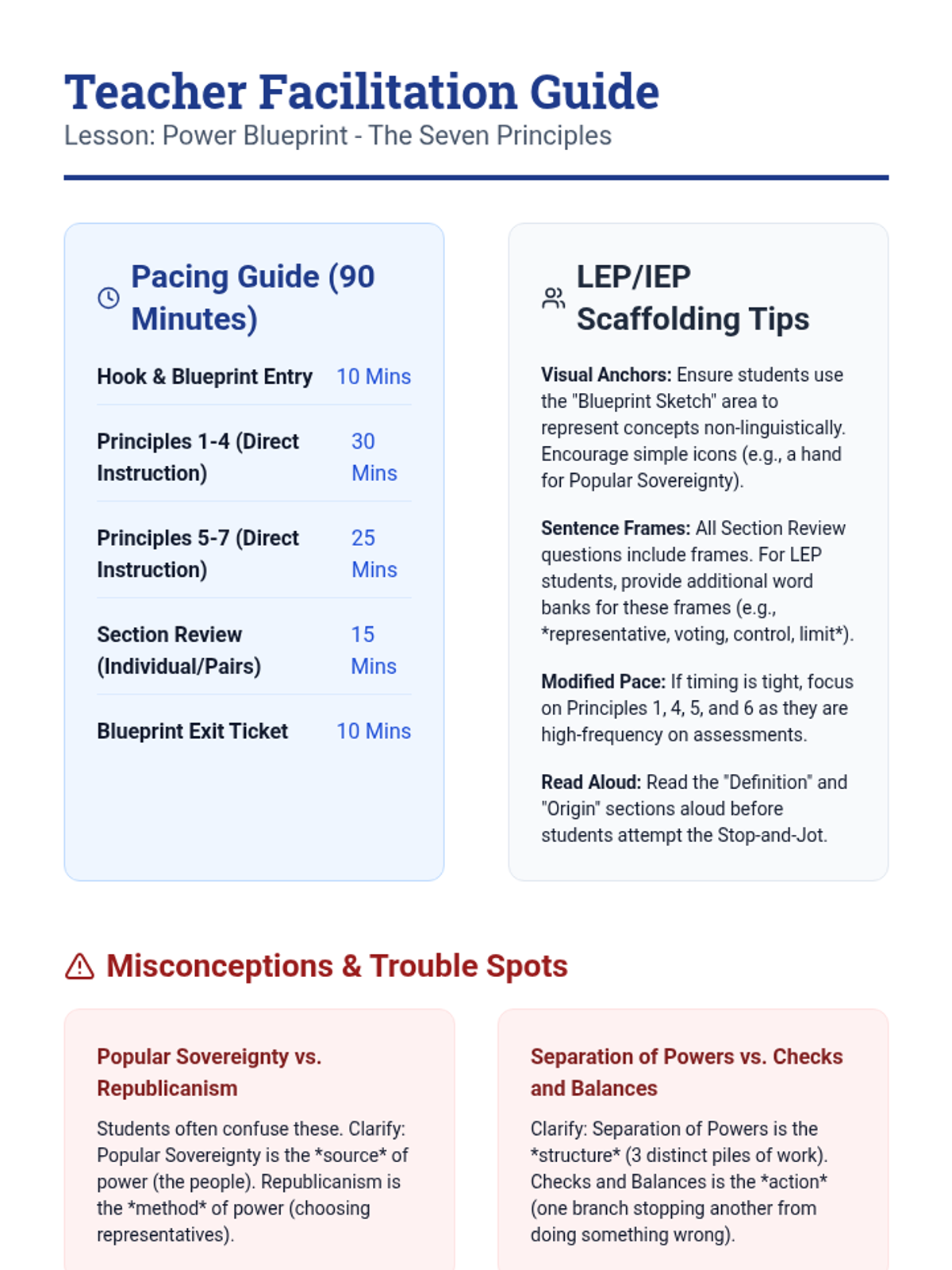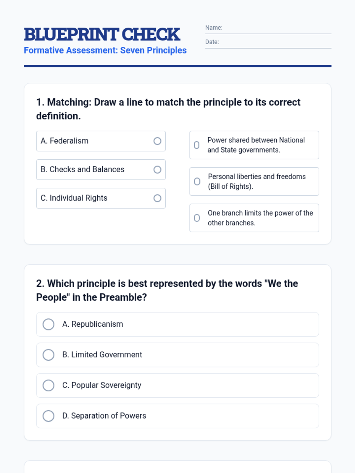 A comprehensive 90-minute lesson on the seven principles of the U.S. Constitution, featuring a blueprint-themed instructional approach with student graphic organizers, teacher scripts, and assessments.