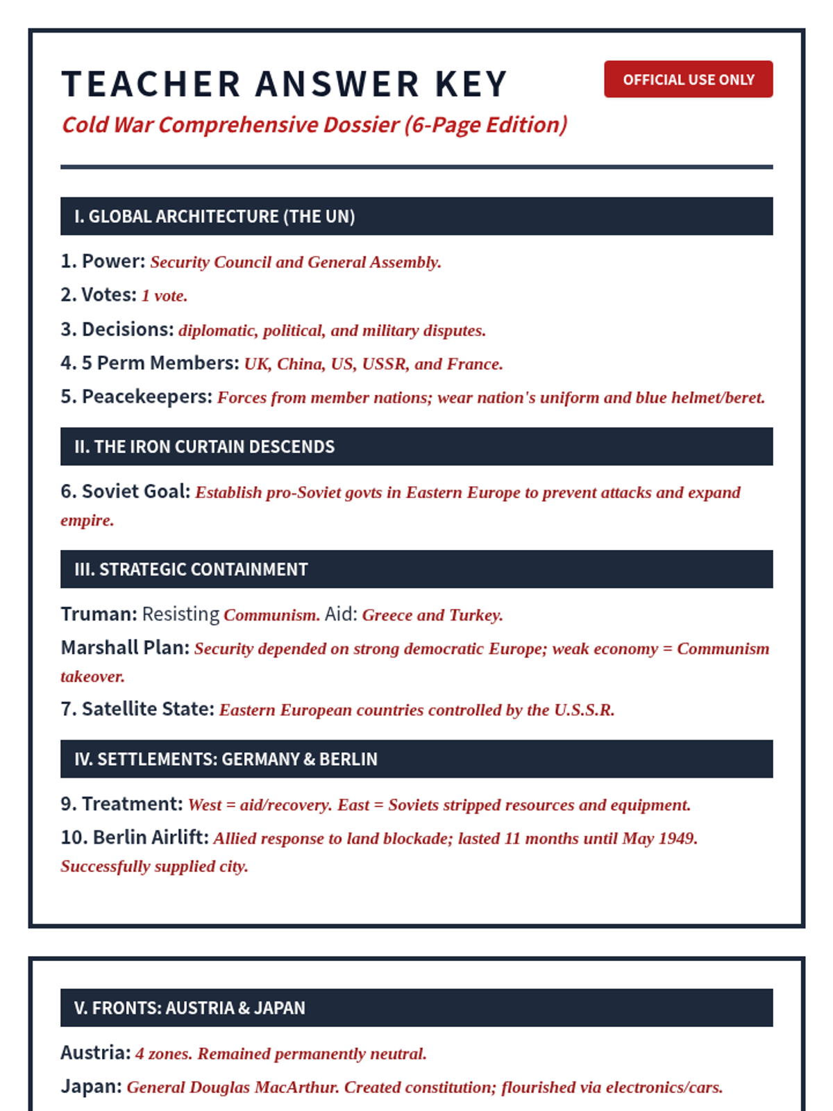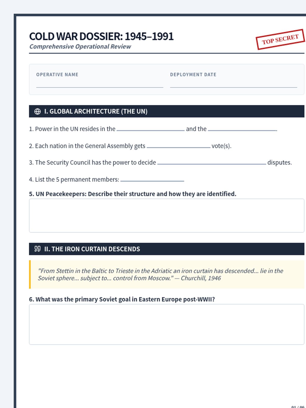 A comprehensive review of the Cold War era (1945–1991), focusing on key leaders, proxy wars, nuclear tension, and the eventual collapse of the Soviet Union. Includes a detailed student dossier assignment and teacher answer key.