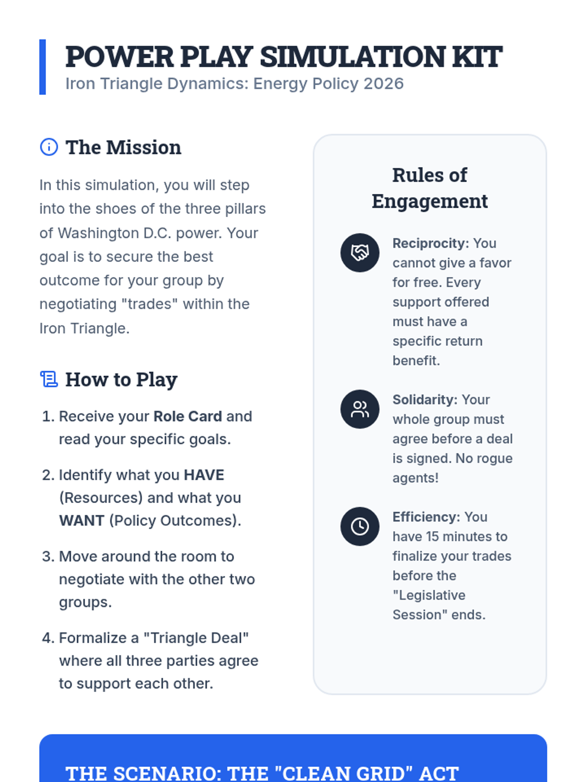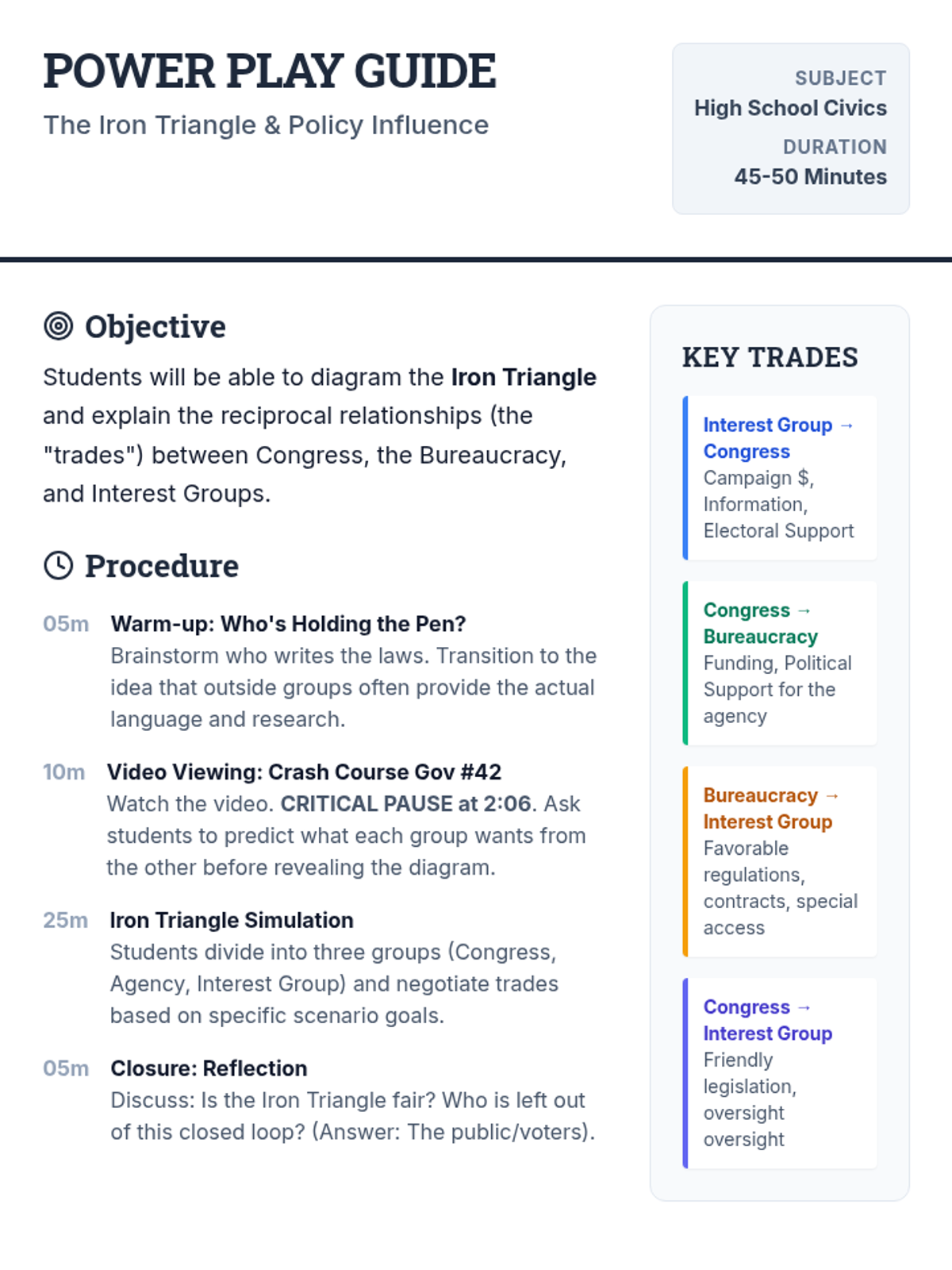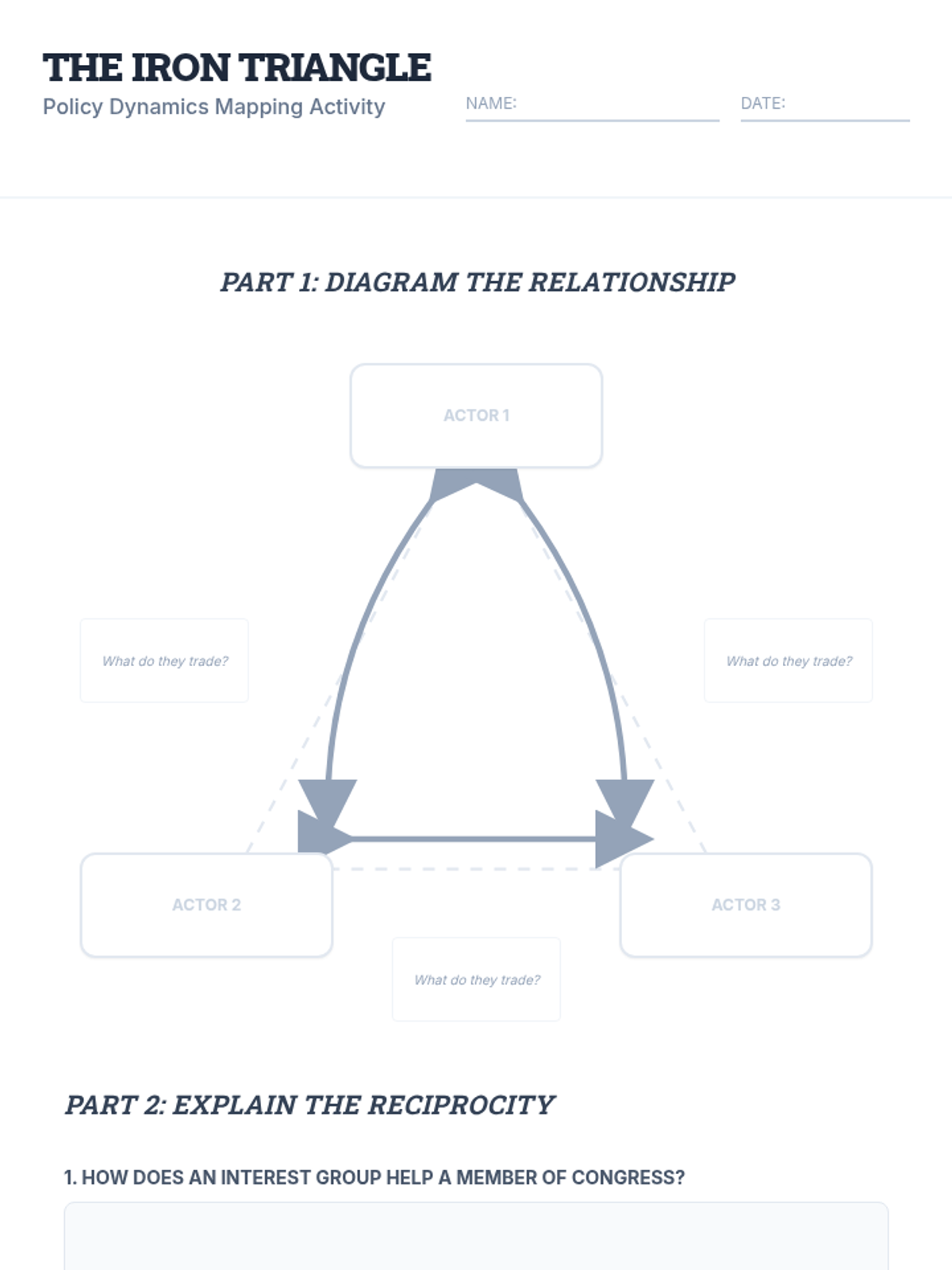 Students will explore the reciprocal relationships between Congress, the Bureaucracy, and Interest Groups by diagramming the 'Iron Triangle' and participating in a policy-making simulation.