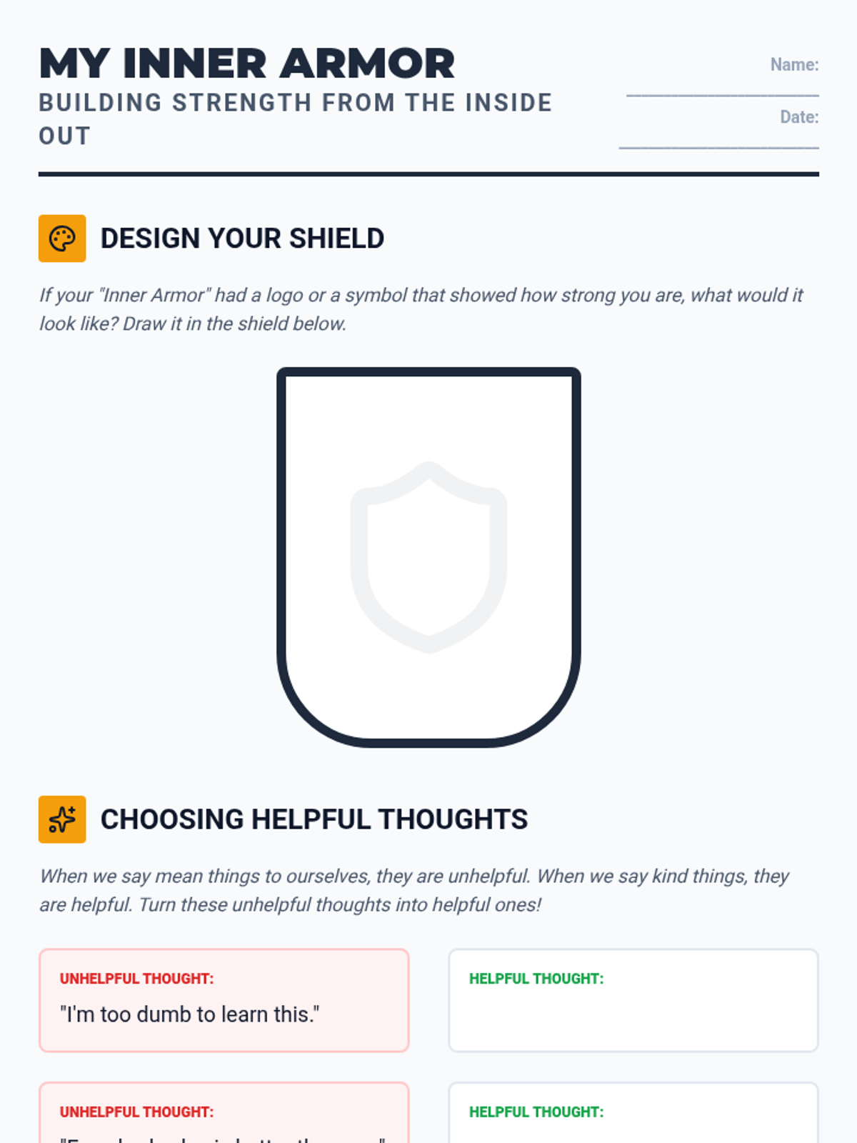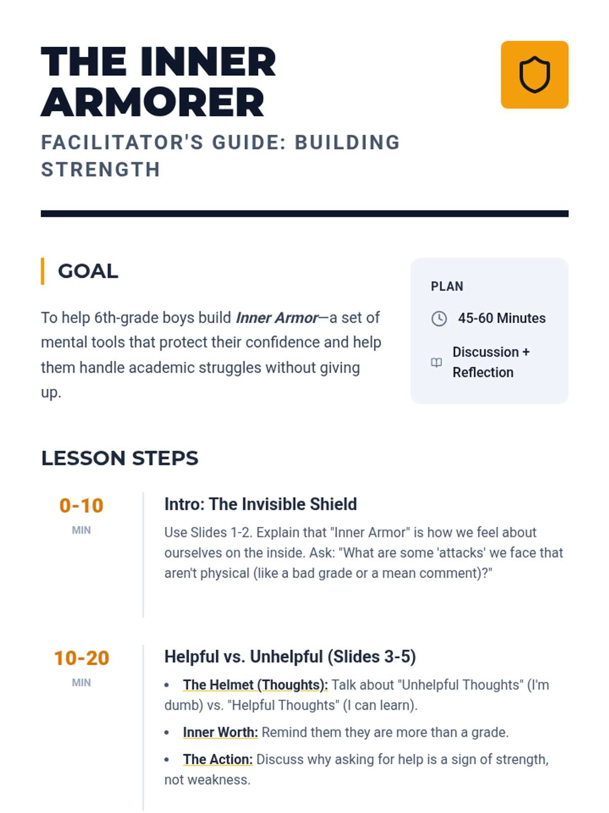 A lesson for 6th-grade boys exploring self-esteem through the metaphor of internal armor, focusing on positive self-talk, self-worth, and academic resilience.
