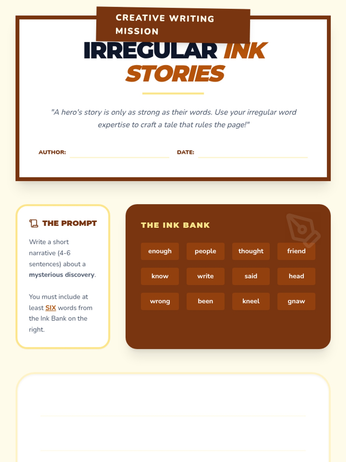 Students apply their knowledge by writing a short narrative using target irregular words and participating in a peer review.
